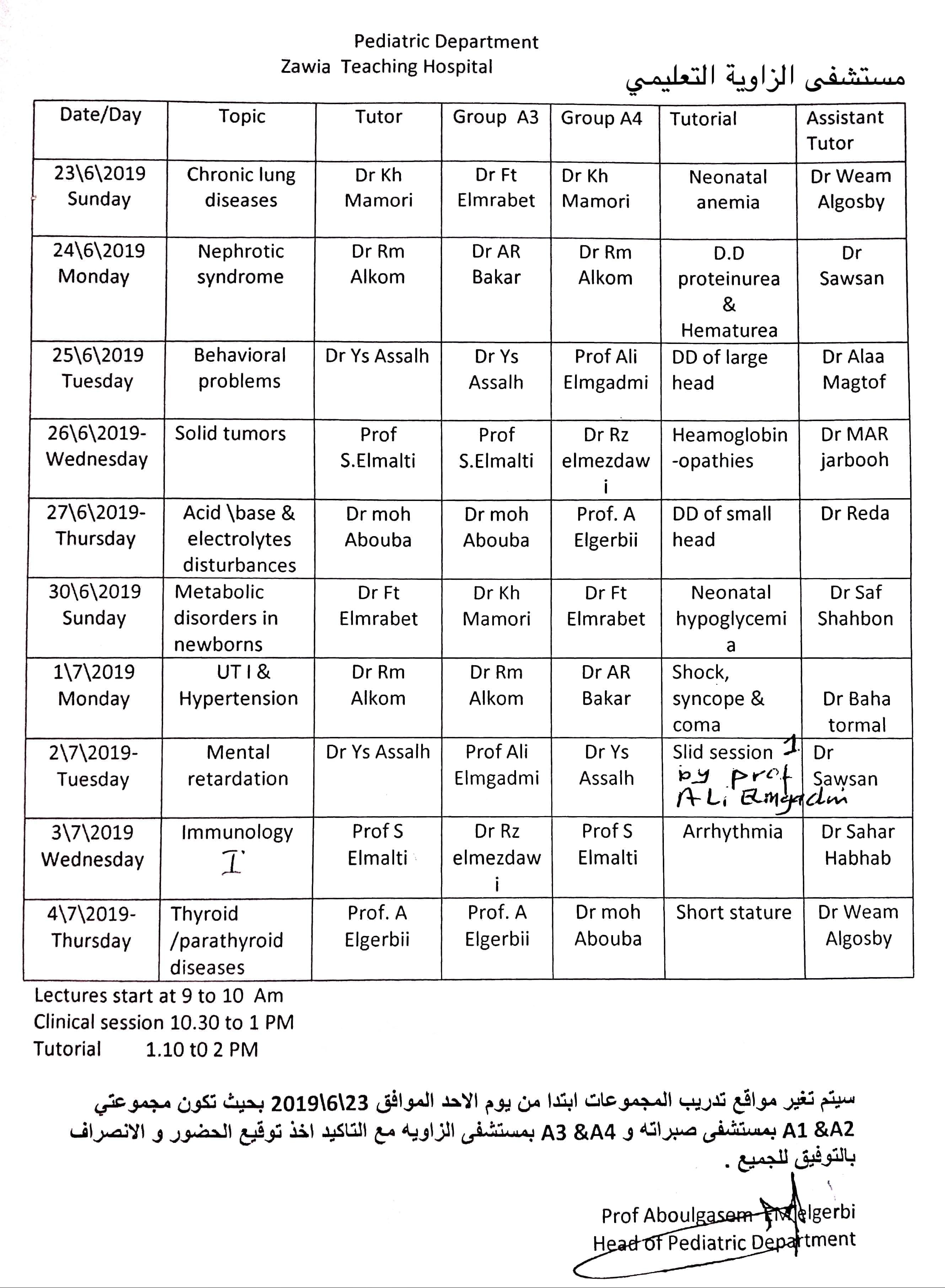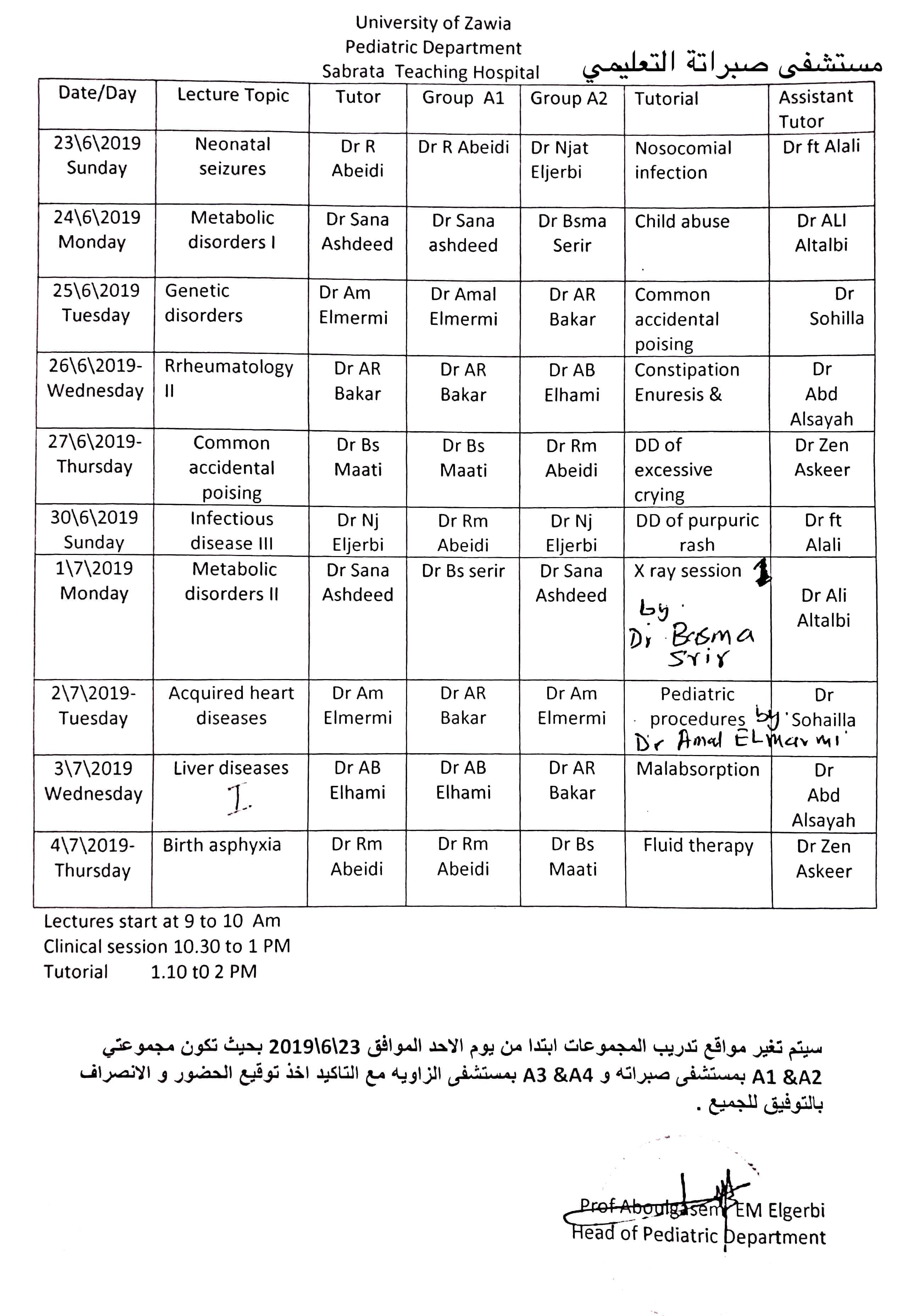 جدول محاضرات مادة الأطفال السنة الخامسة الدفعة 15