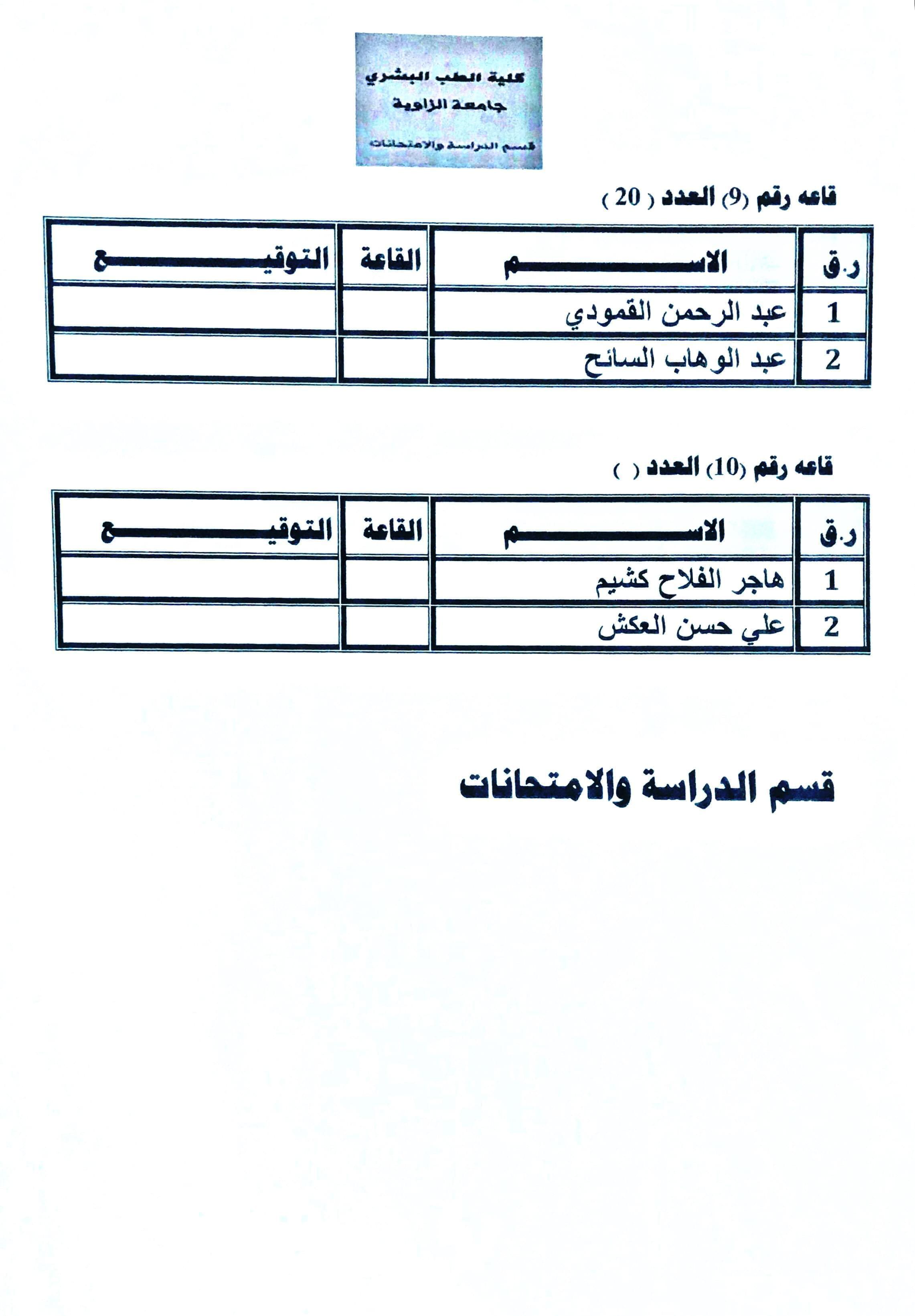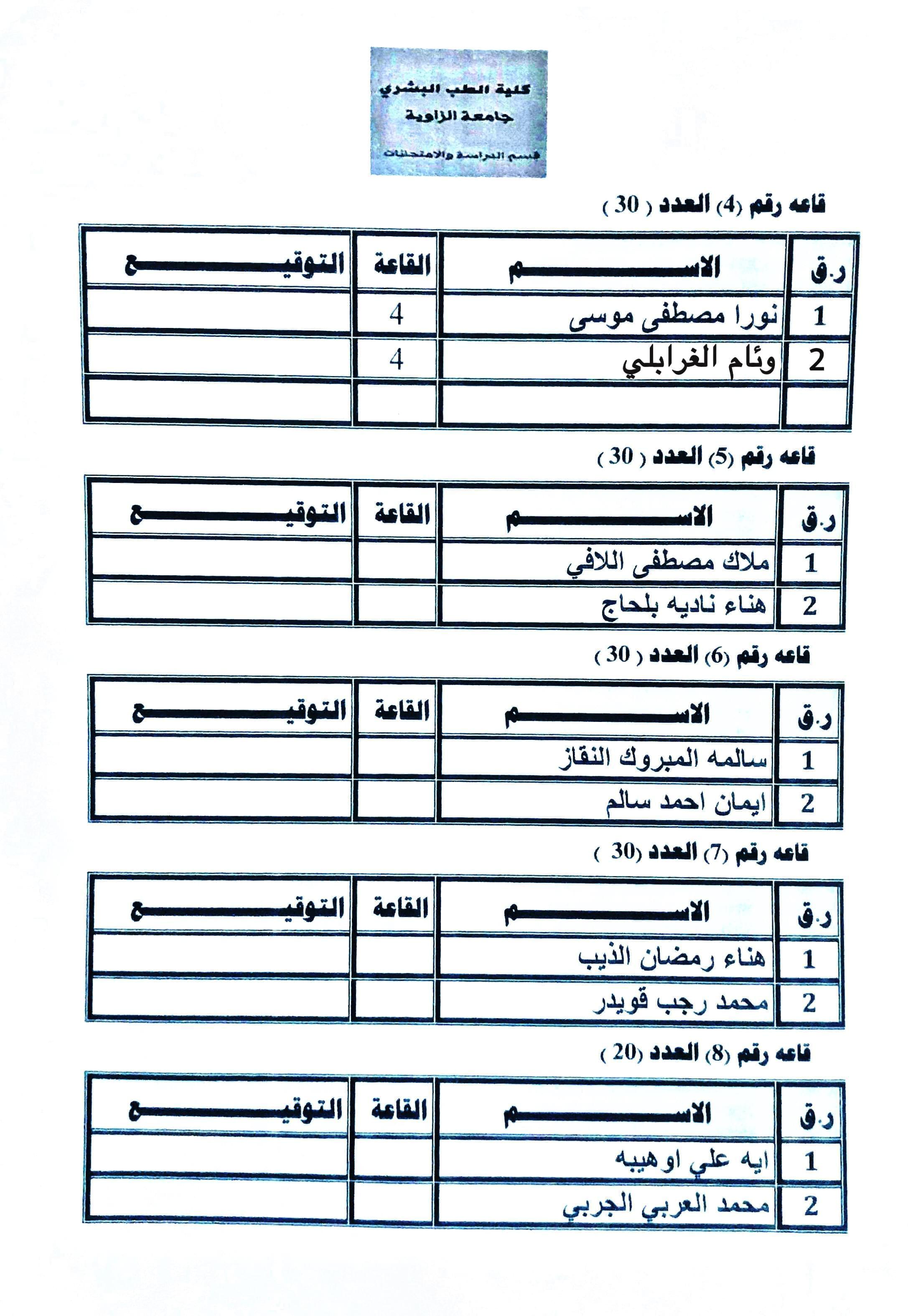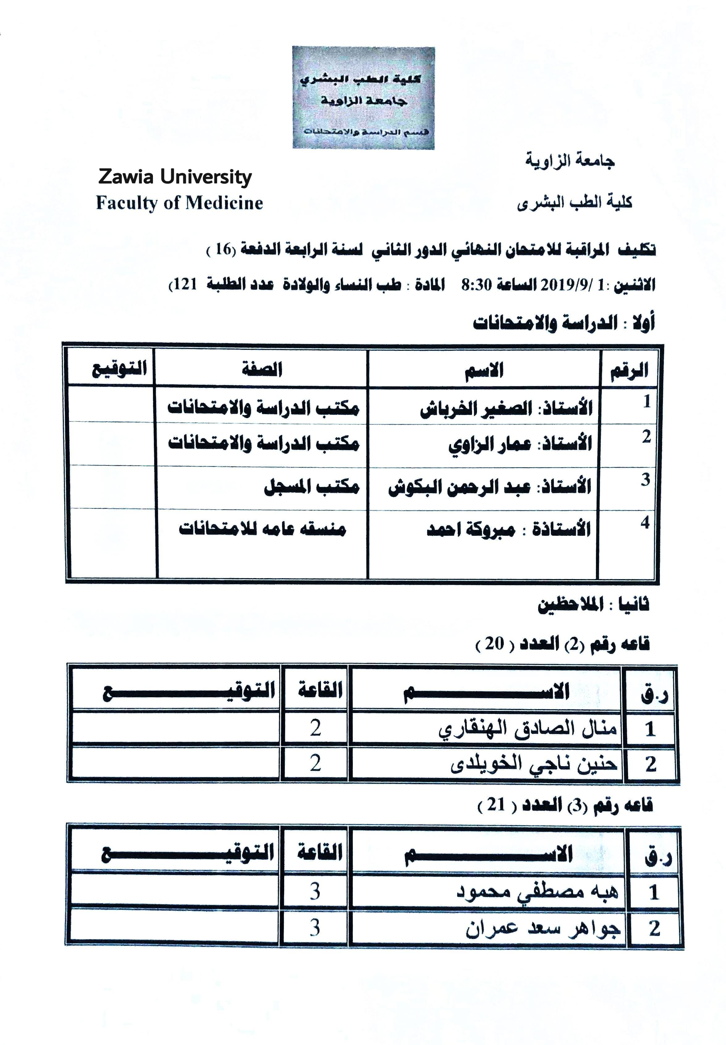 أسماء المكلفين بمراقبة إمتحان الدور الثاني لمادة النساء والولادة للسنة الرابعة الدفعة 16 وذلك يوم الأحد الموافق 1-9-2019 الساعة الـ8:30 صباحاً.