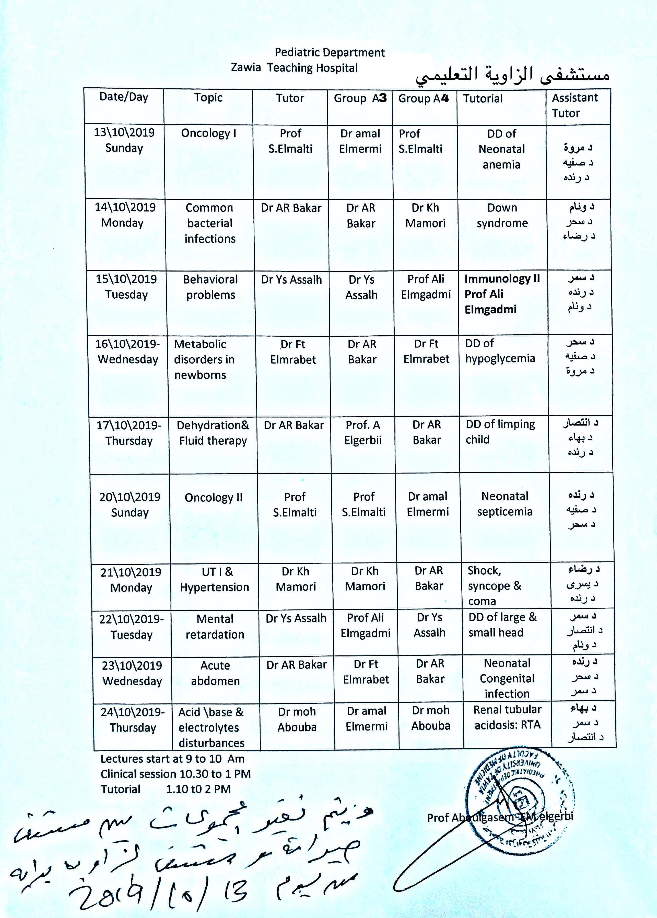 جدول المحاضرات مادة الأطفال لسنة خامسة طب بشري
