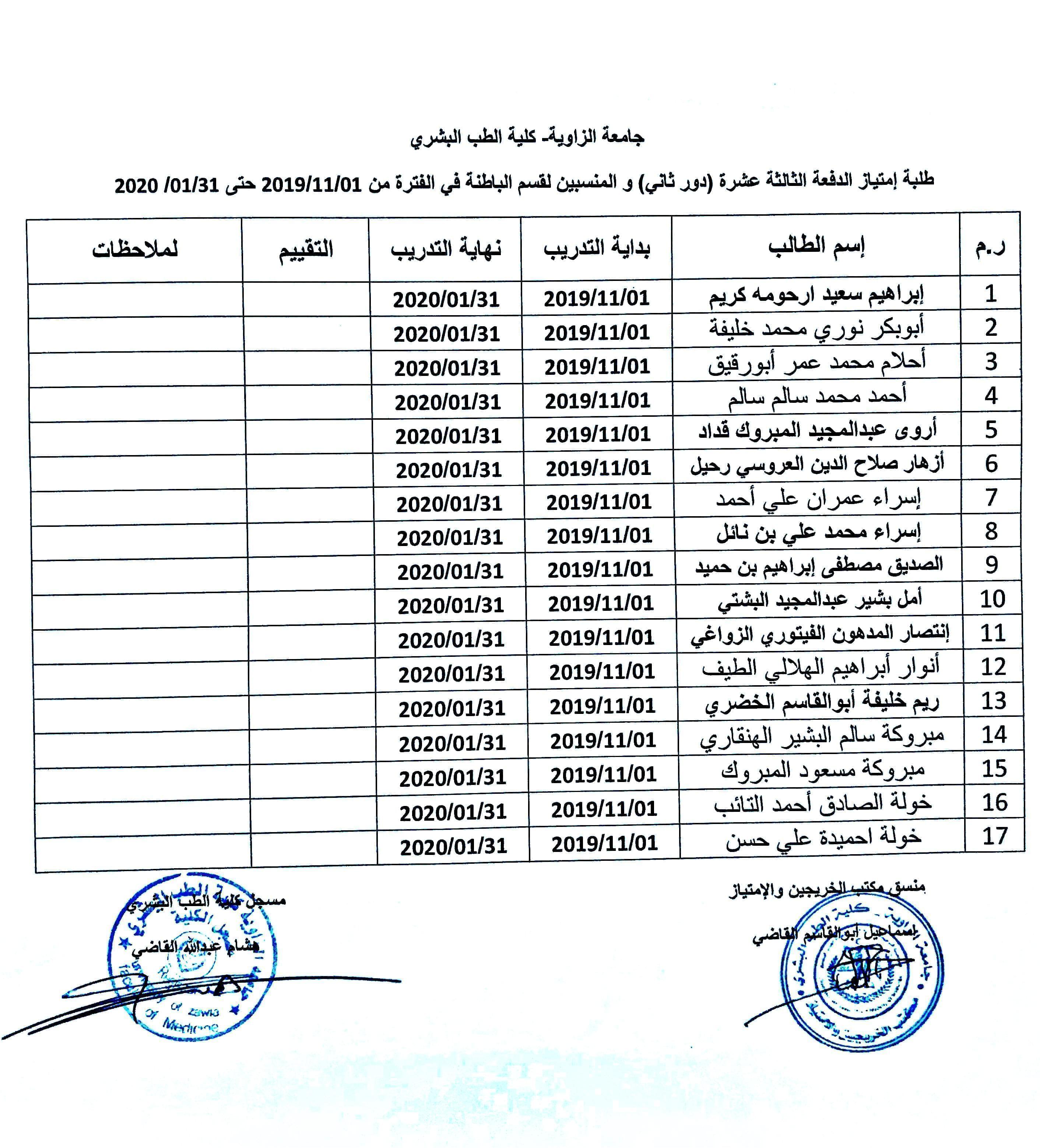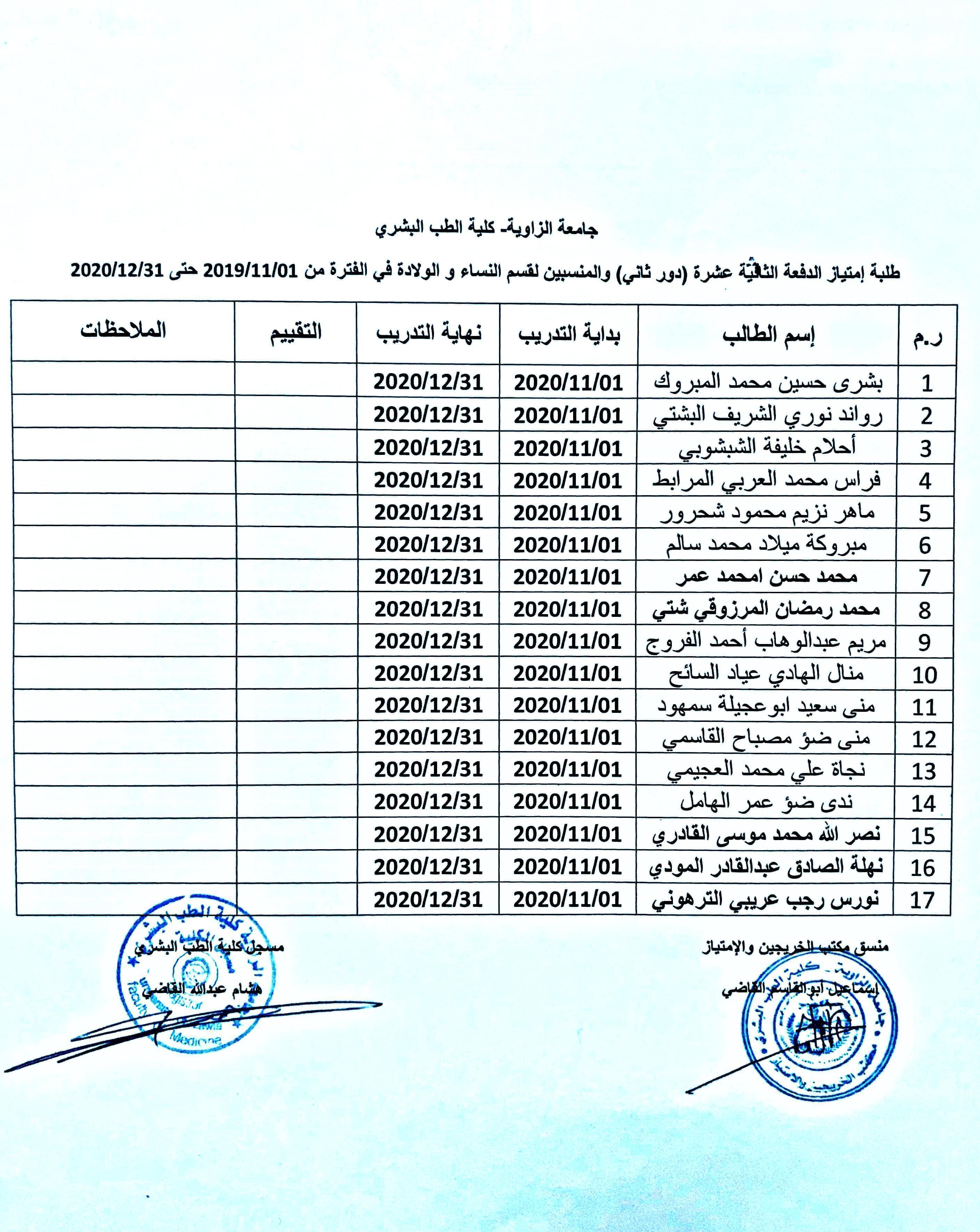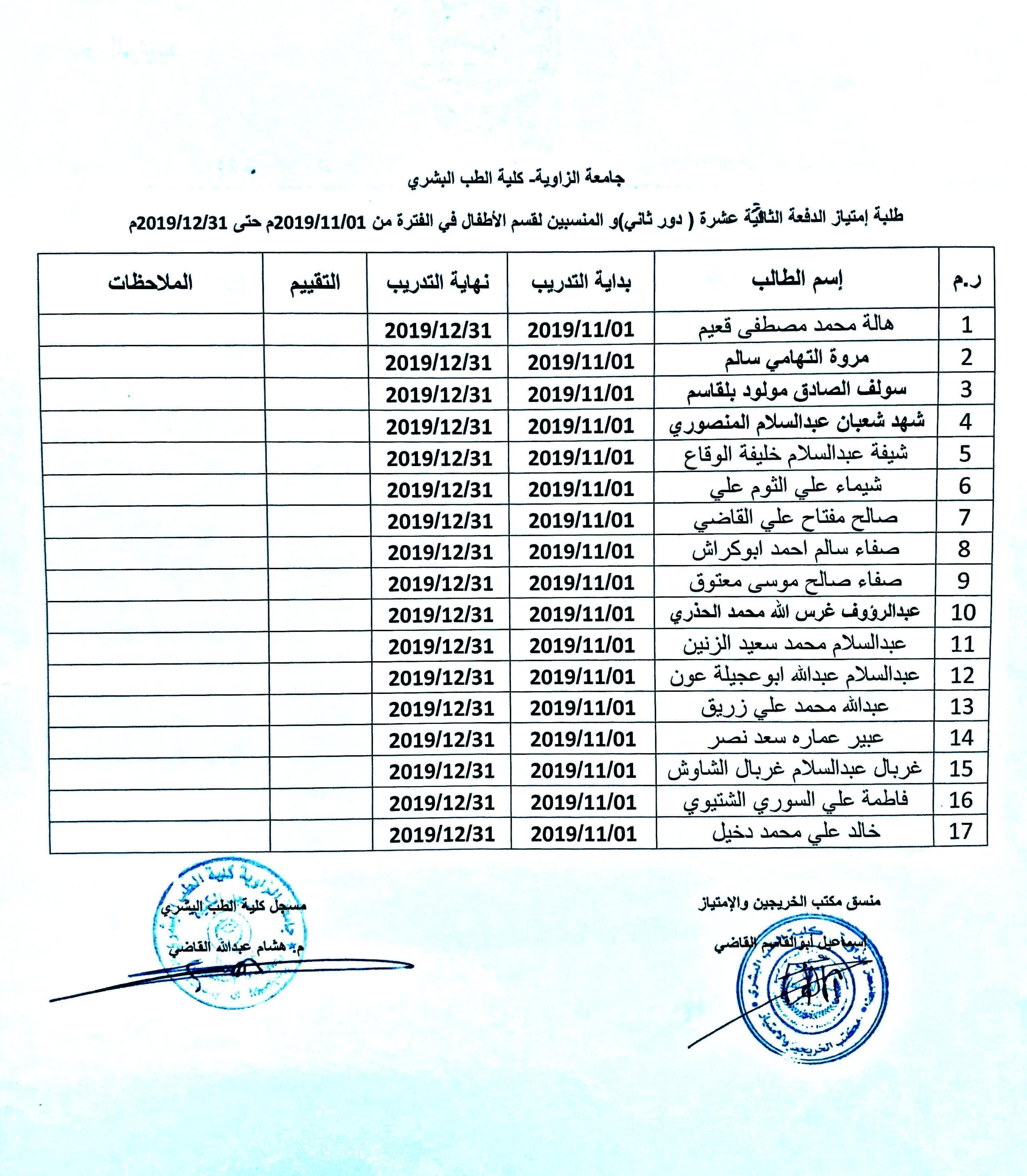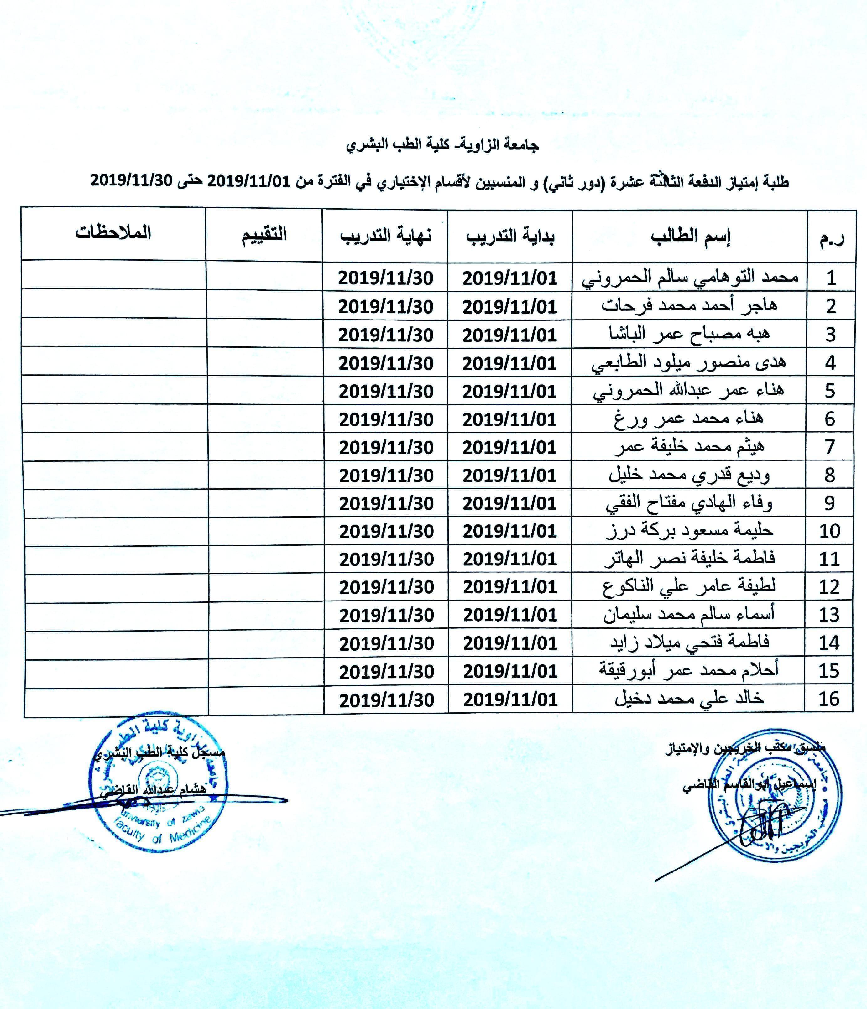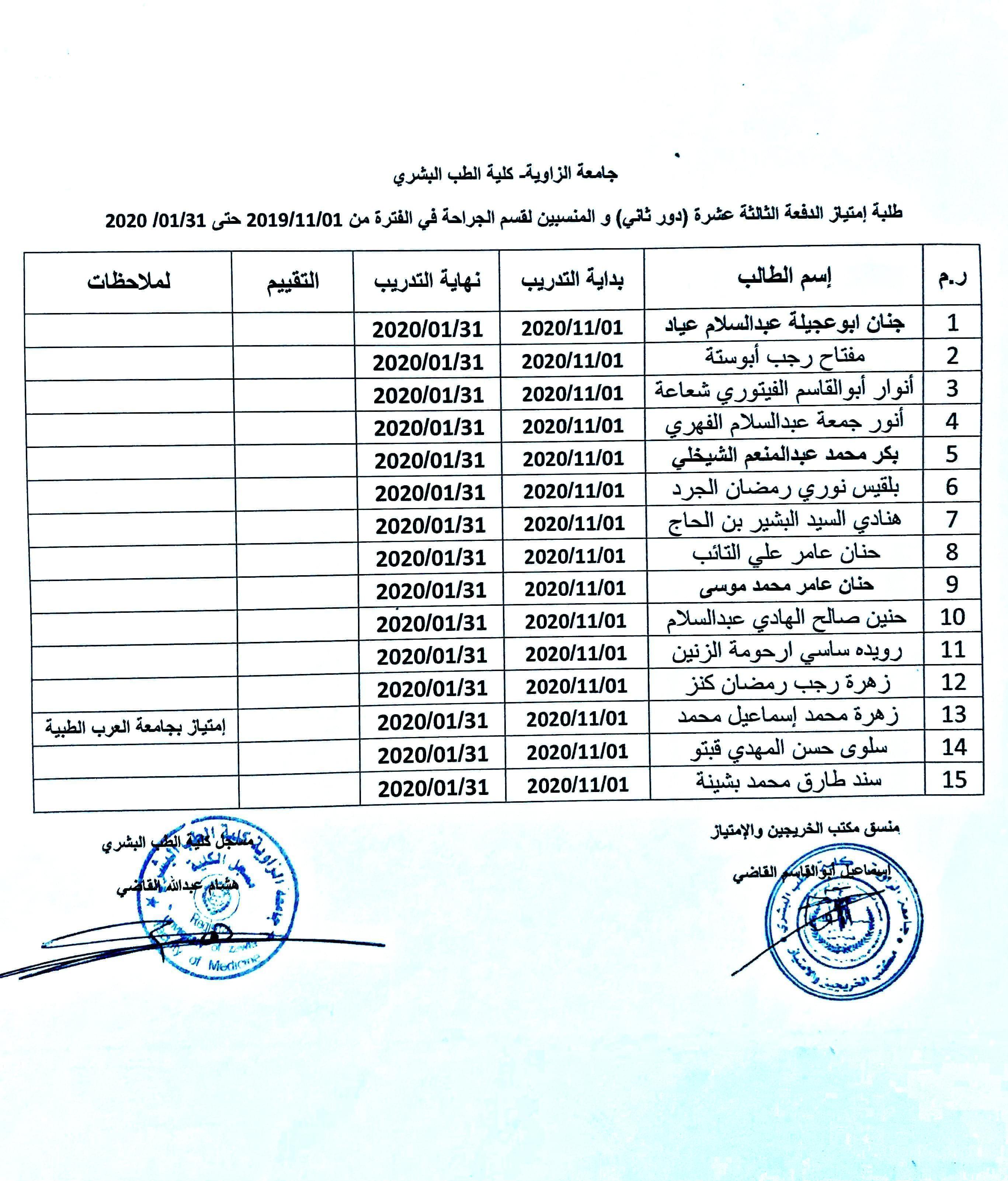 تقسيم مجموعات الإمتياز الدفعة 13 ( الدور الثاني) مع ملاحظة بأن من يرغب في أداء إمتيازه خارج الزاوية لأي تخصص التقدم بطلباتهم خلال أقرب فترة وقبل البدء بالإمتياز.