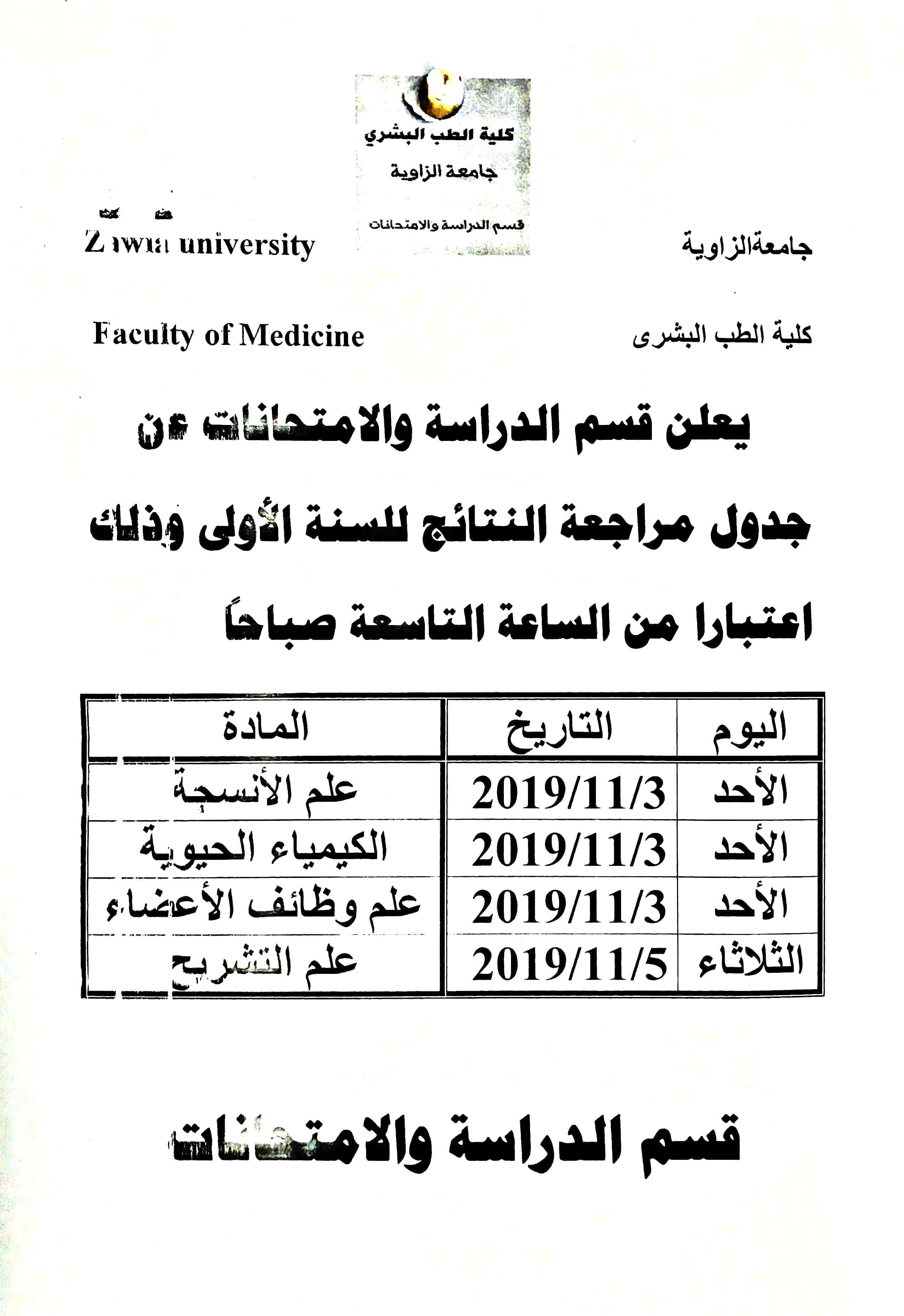 موعد تقديم طلبات مراجعة نتائج الدور الثاني لسنوات الإعداد والأولى والرابعة طب بشري ومرفقة بجداول مراجعة المواد لسنة الإعداد والأولى طب بشري