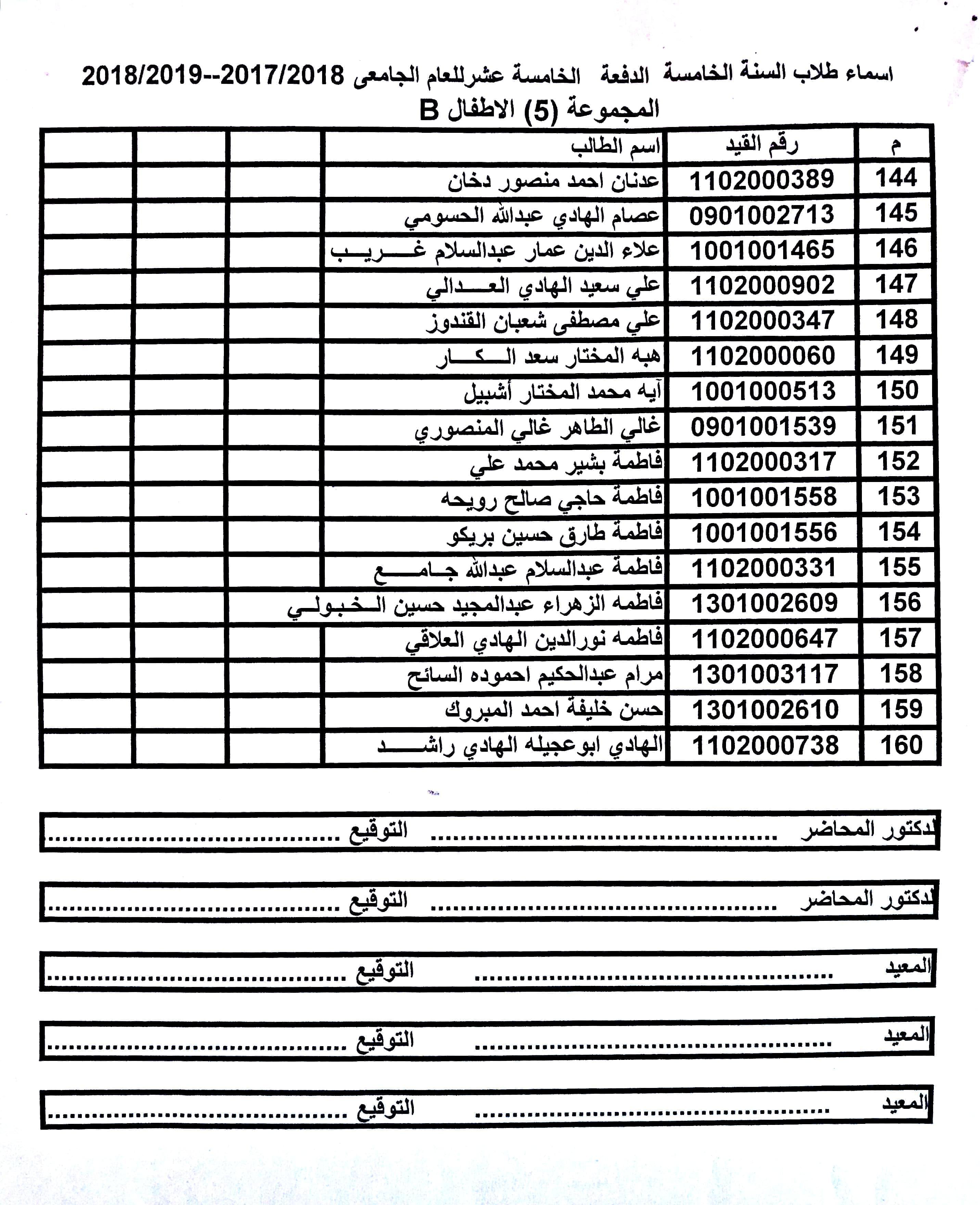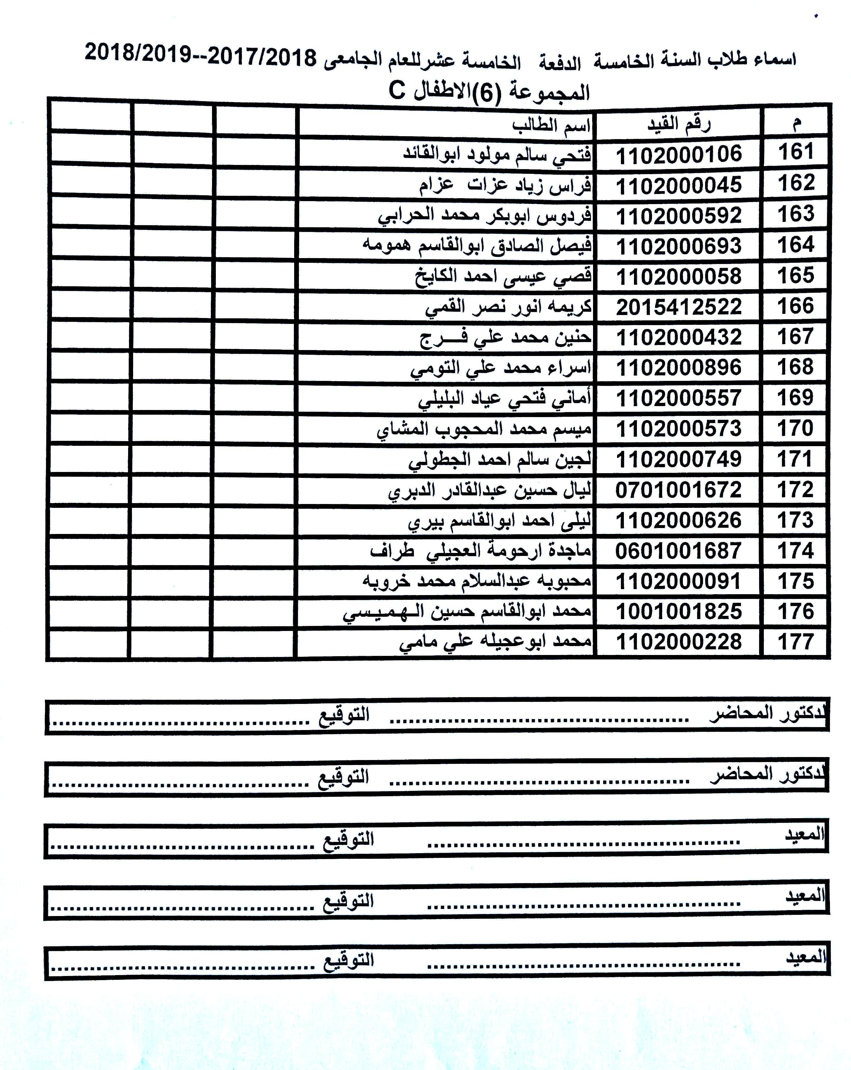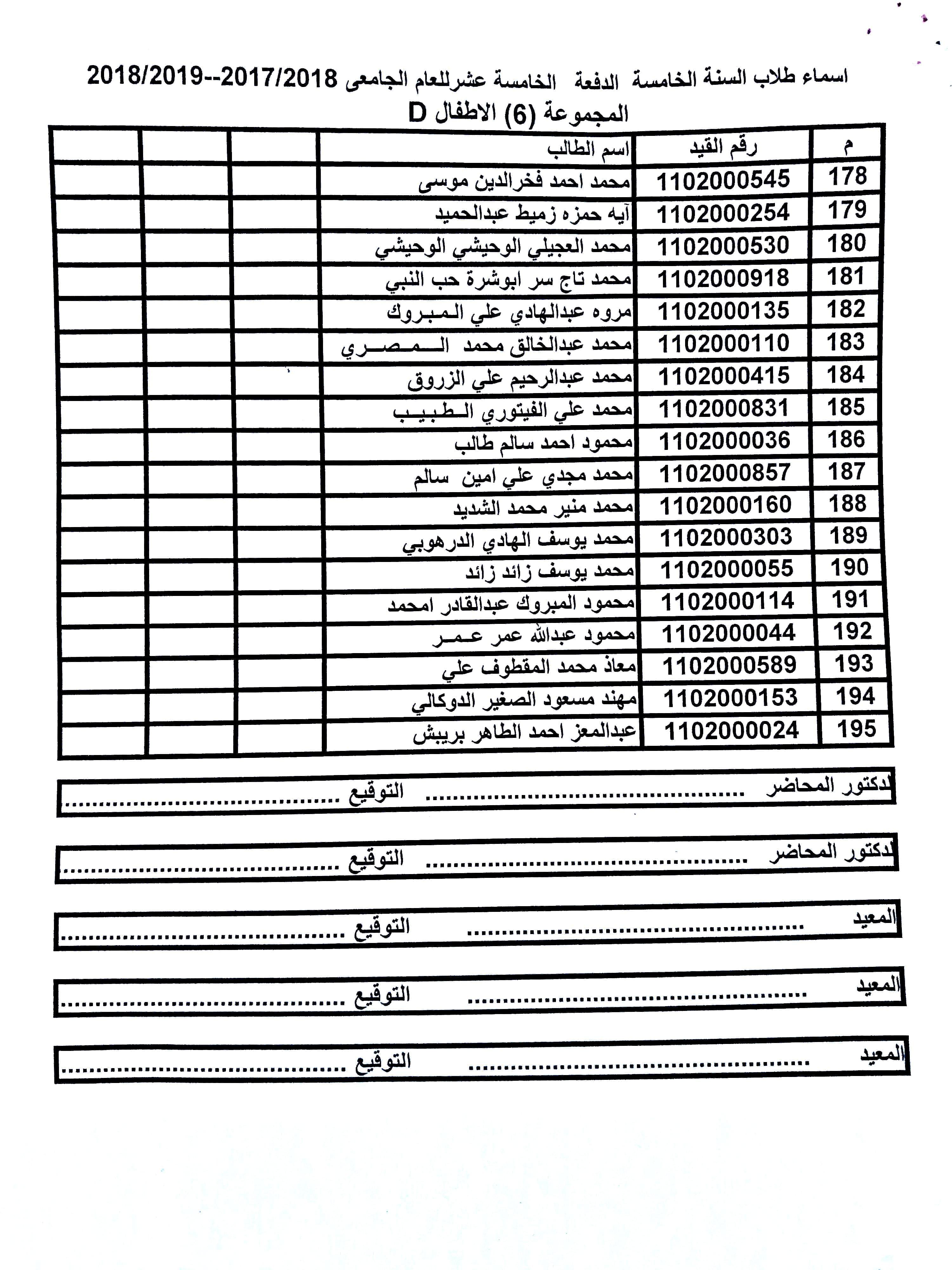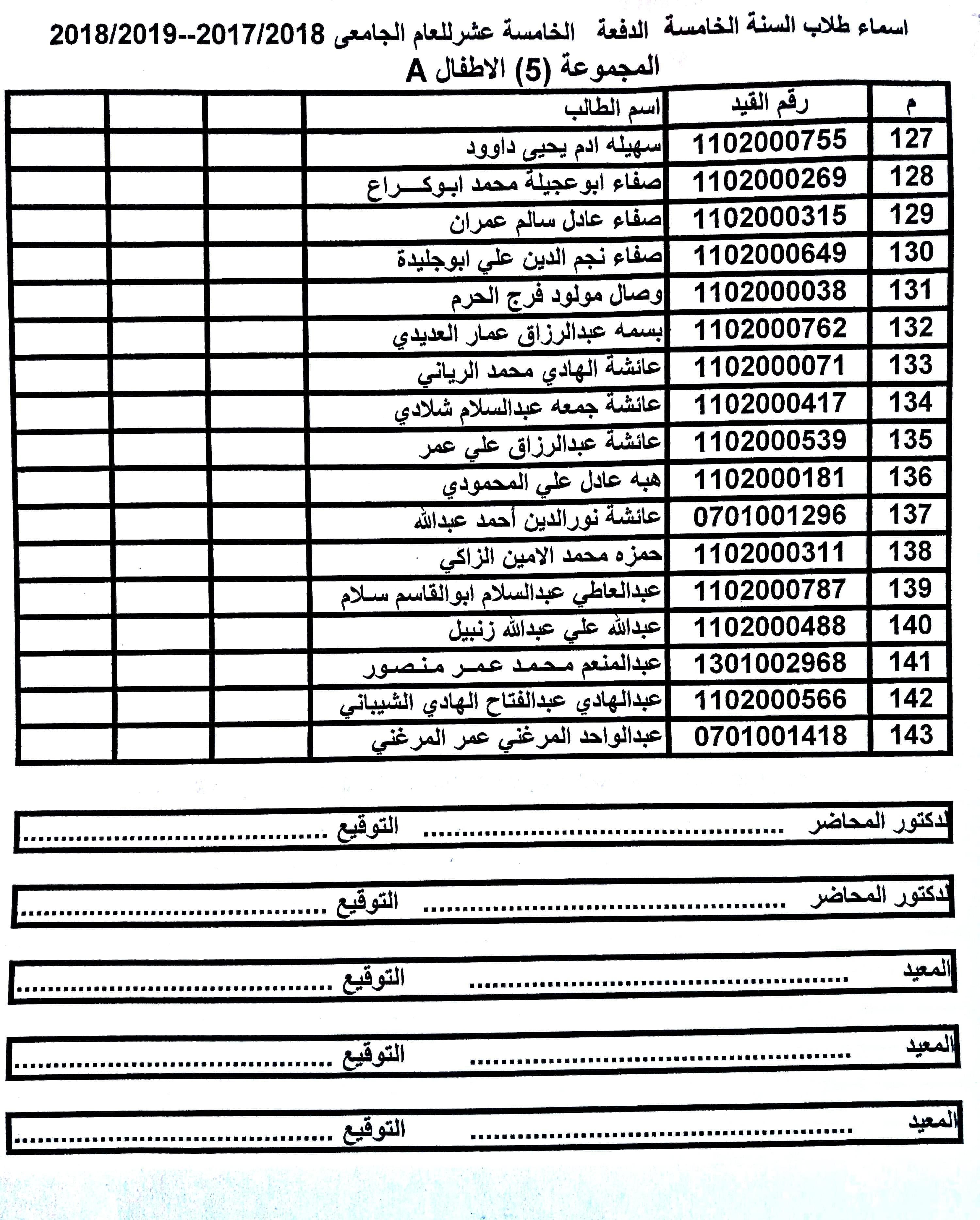 تقسيم المجموعات لمادة الأطفال للسنة الخامسة الدفعة 15 ملاحظة: على الطلبة الراغبين في التغيير بين المجموعات ضرورة مراجعة قسم الدراسة والإمتحانات قبل يوم الخميس الموافق 14-11-2019.