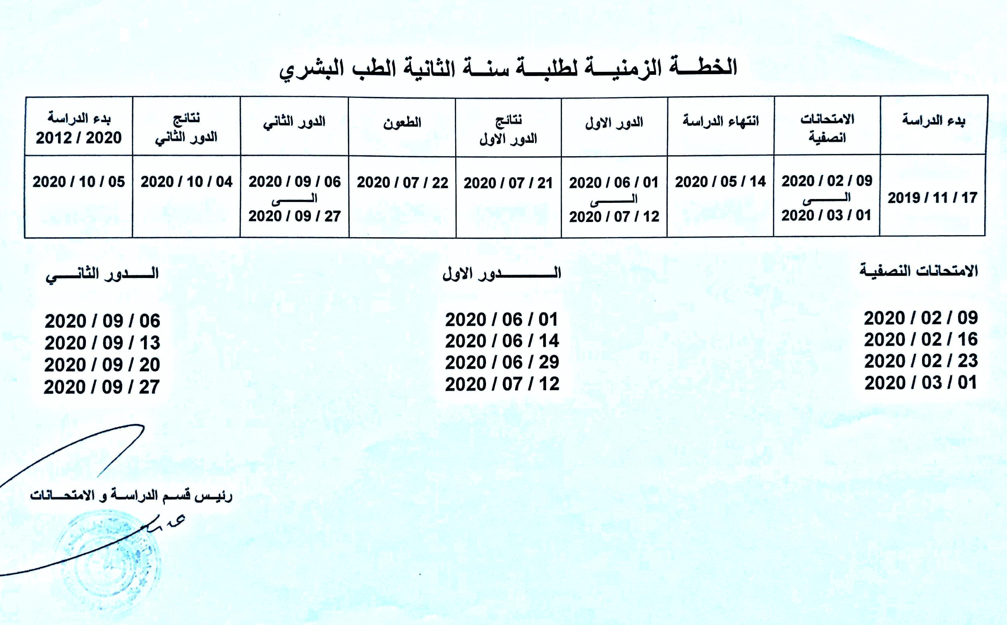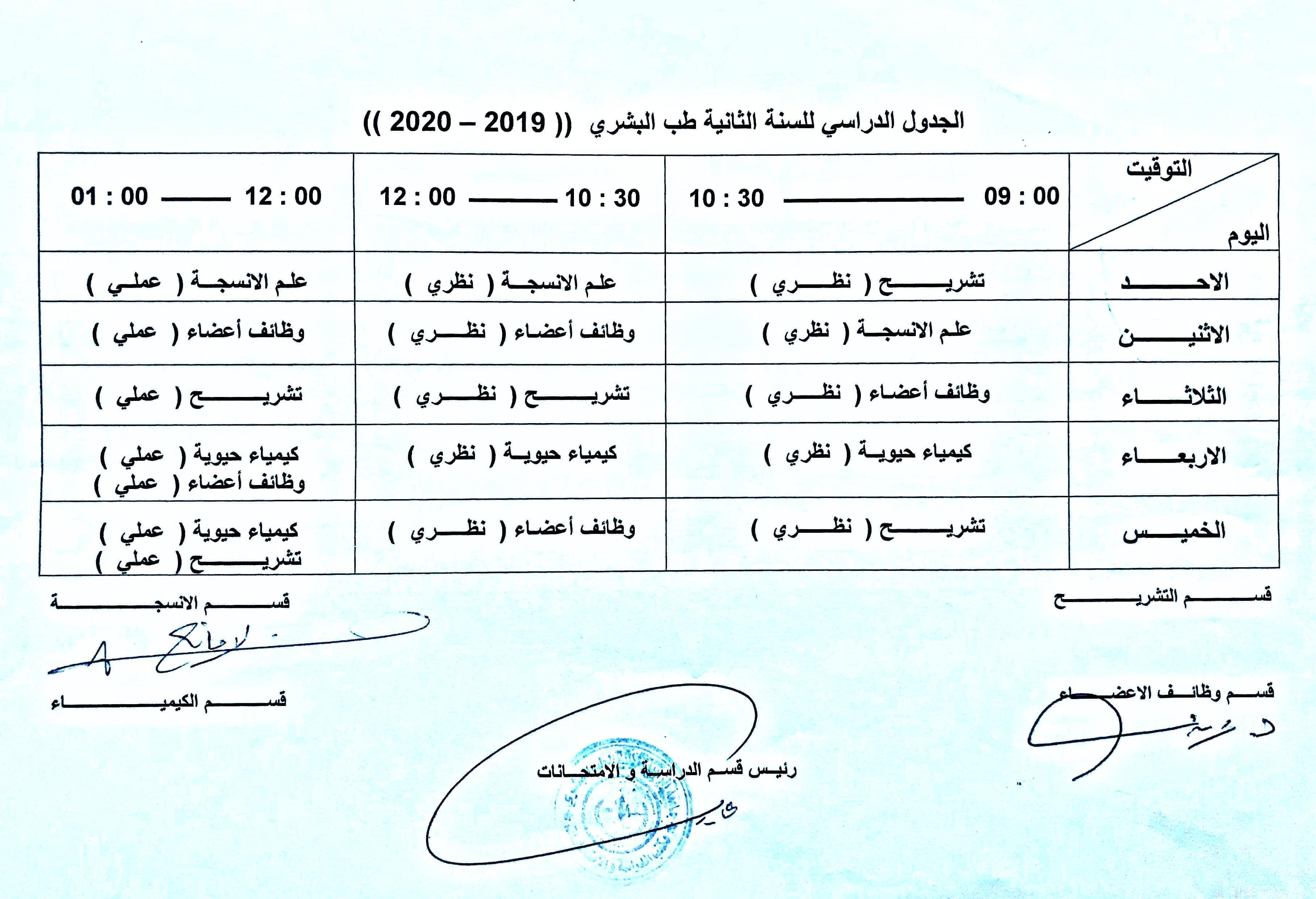 الجدول الدراسي والخطة الزمنية للسنة الثانية طب بشري للعام الجامعي 2019-2020.