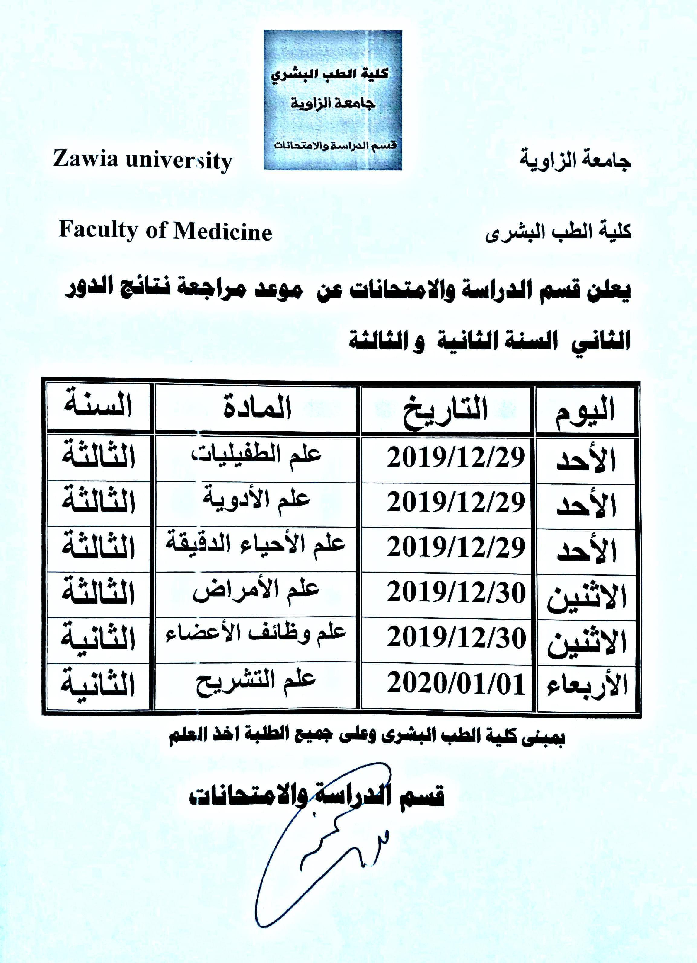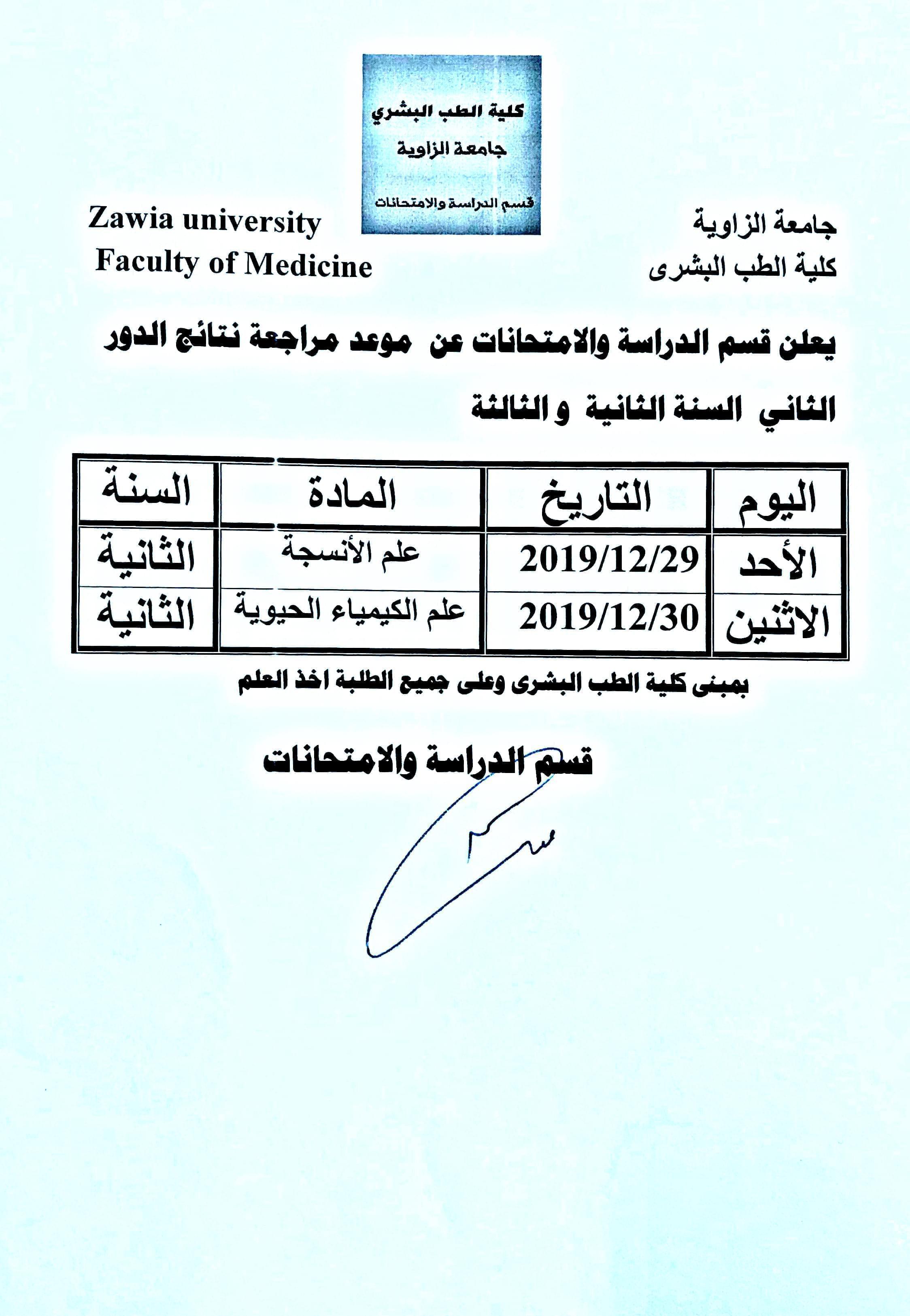 موعد مراجعة نتائج الدور الثاني للسنة الثانية والثالثة طب بشري للعام الجامعي 2018-2019.