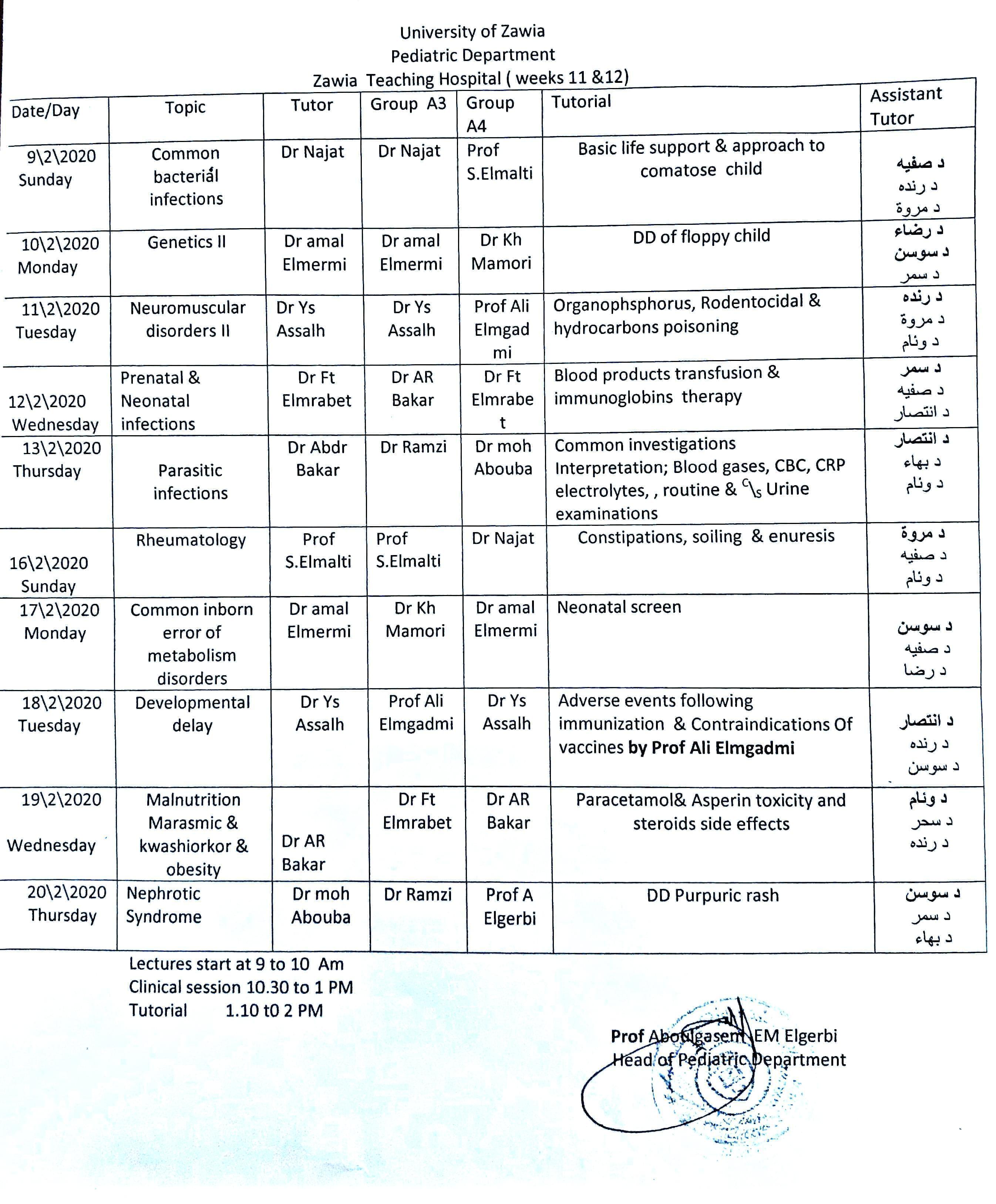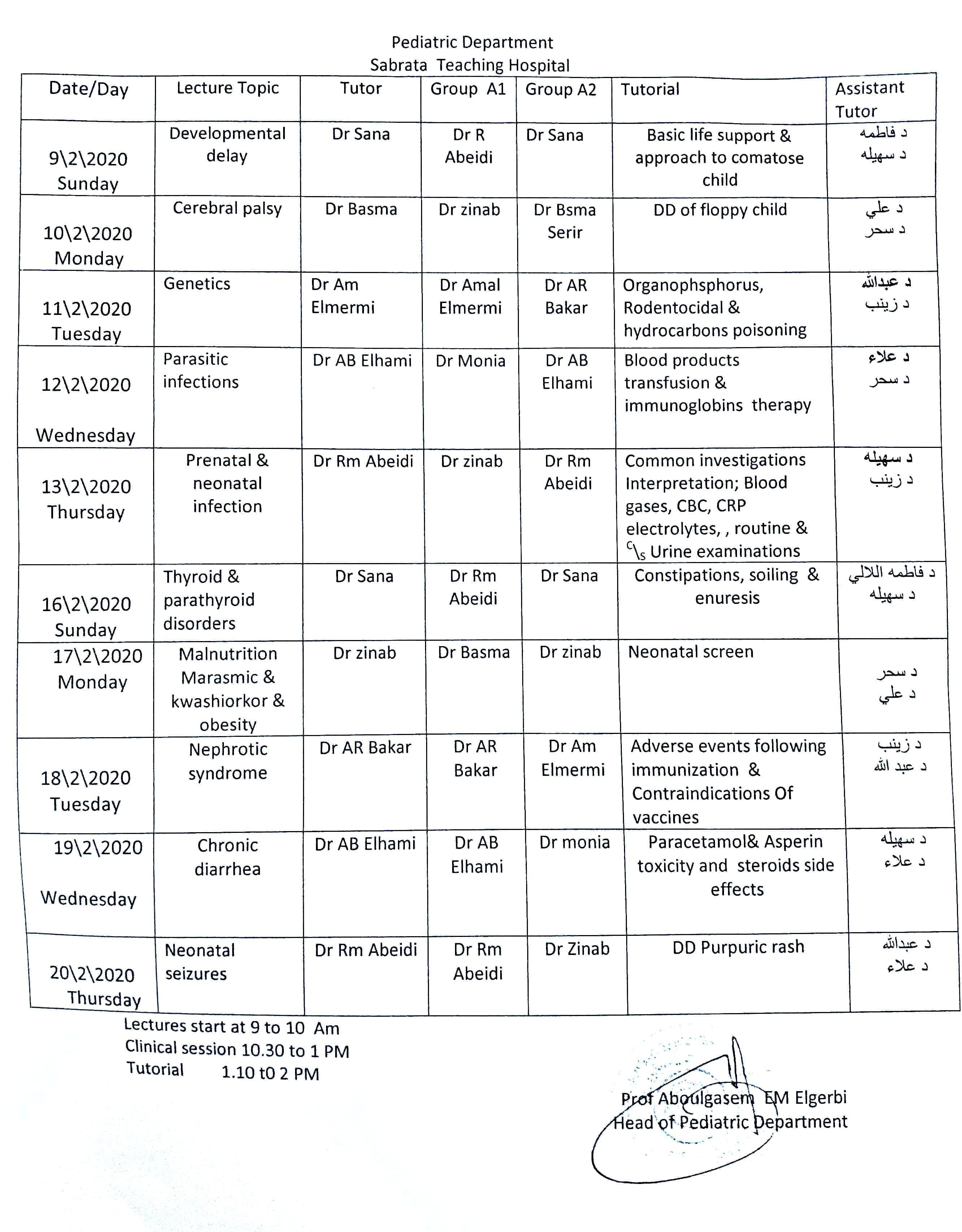 جدول المحاضرات مادة الأطفال للسنة الخامسة طب بشري