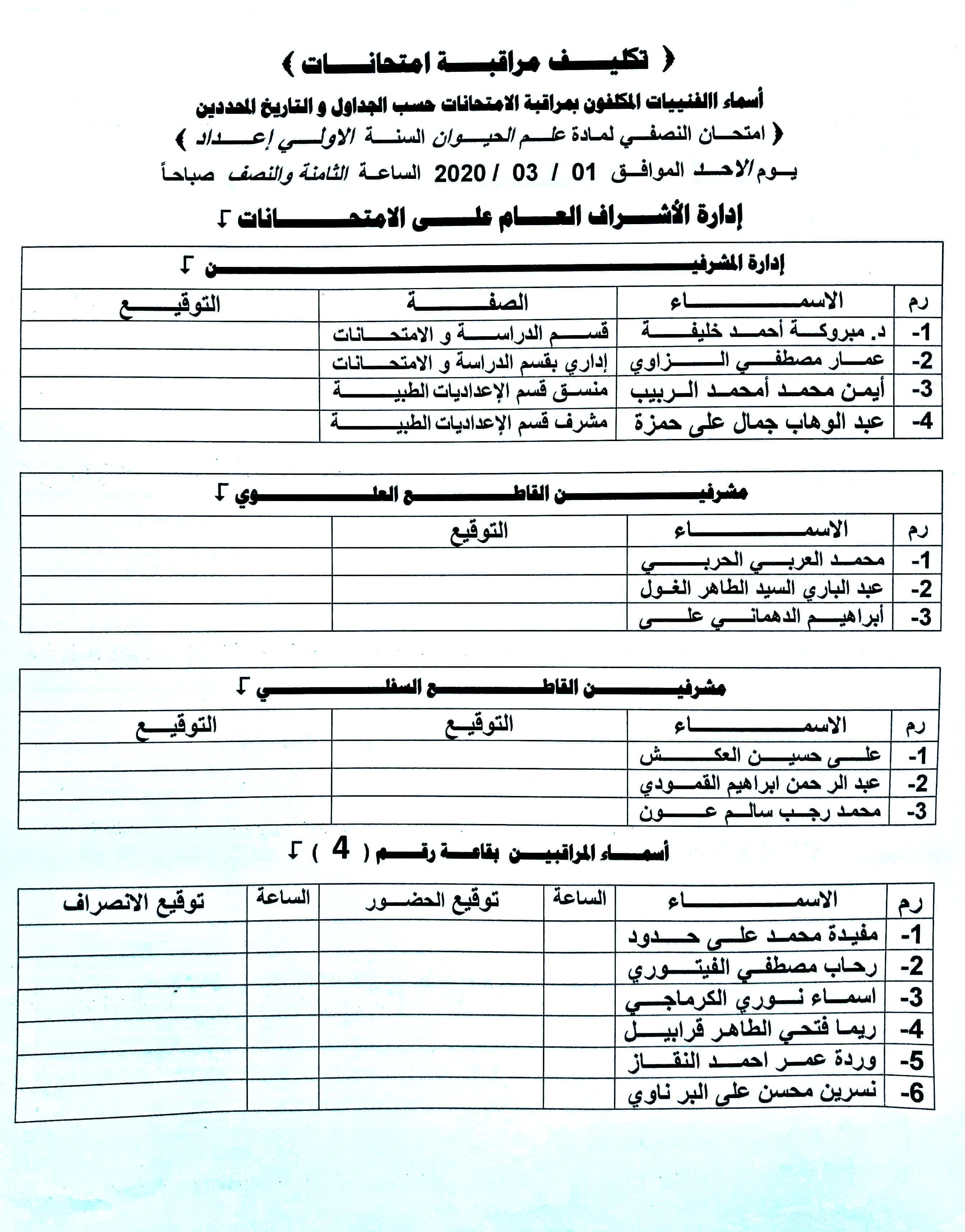 أسماء المكلفين بمراقبة الإمتحان النصفي لمادة علم الحيوان لسنة الإعداد وذلك يوم الأحد الموافق 1-3-2020.