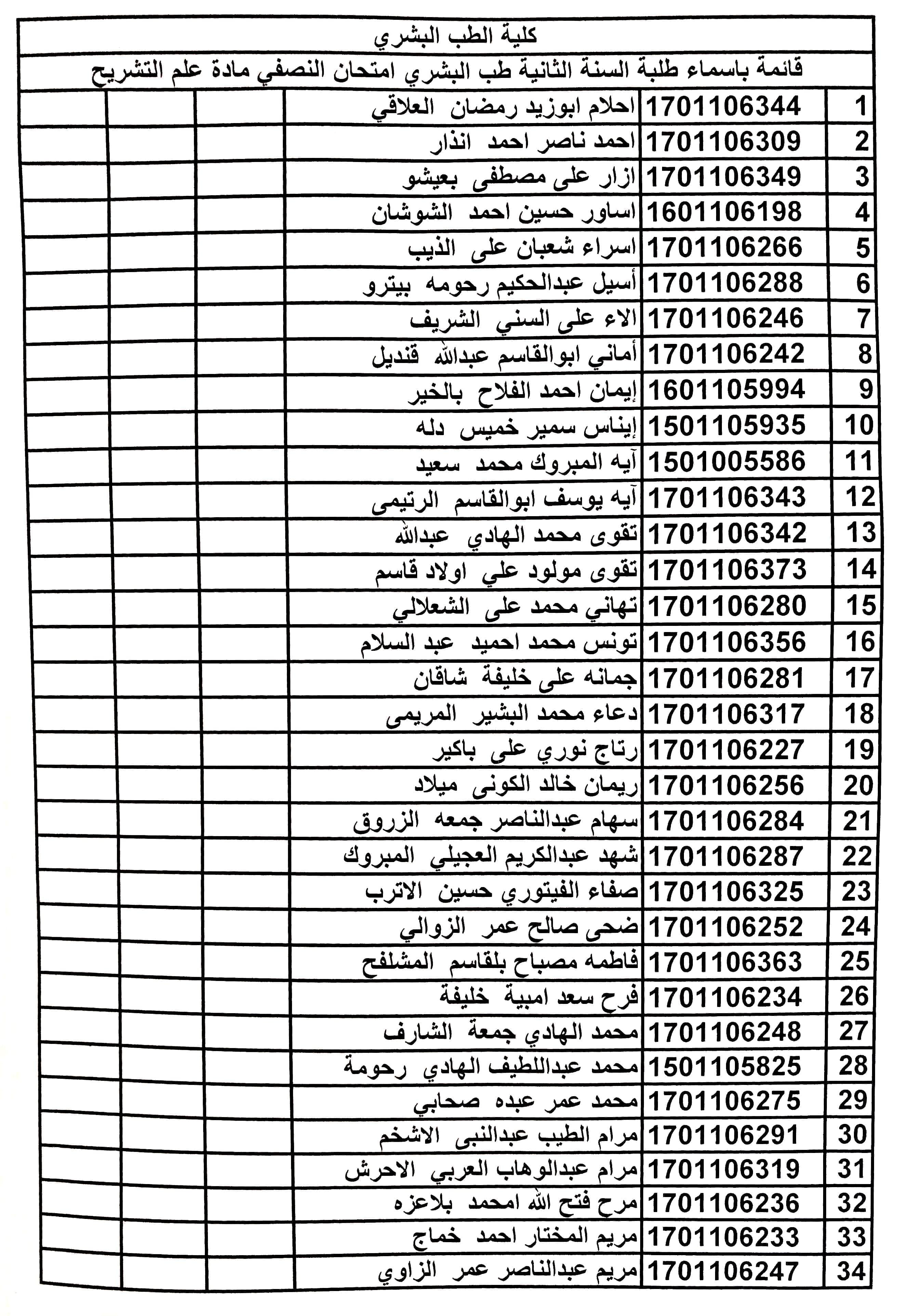 أسماء الطلبة المستهدفين لدخول الإمتحان النصفي لمادة وظائف الأعضاء للسنة الثانية طب بشري.
