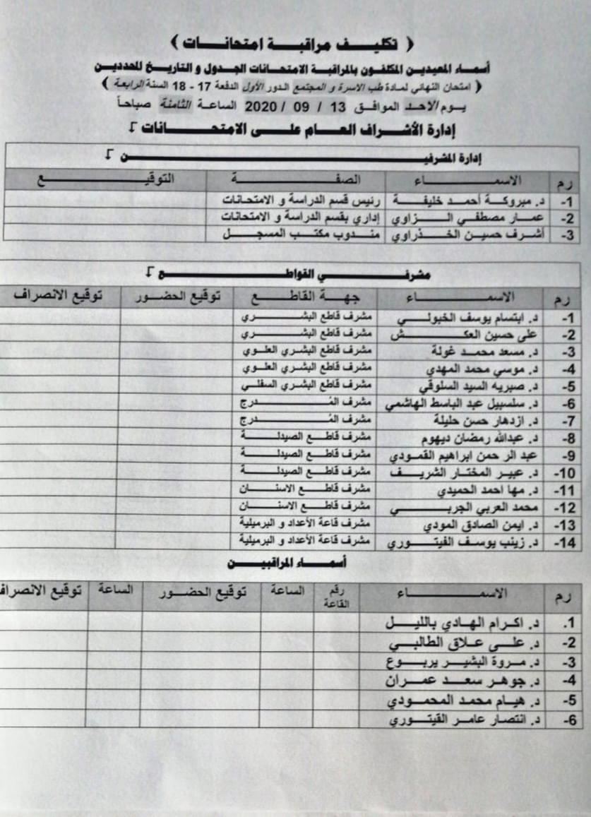أسماء المكلفين بمراقبة امتحان الدور الأول في مادة طب العيون للسنة الرابعة الدفعة 18,17وذلك يوم الأحد الموافق 11-10-2020 الساعة 8:00 صباحا.