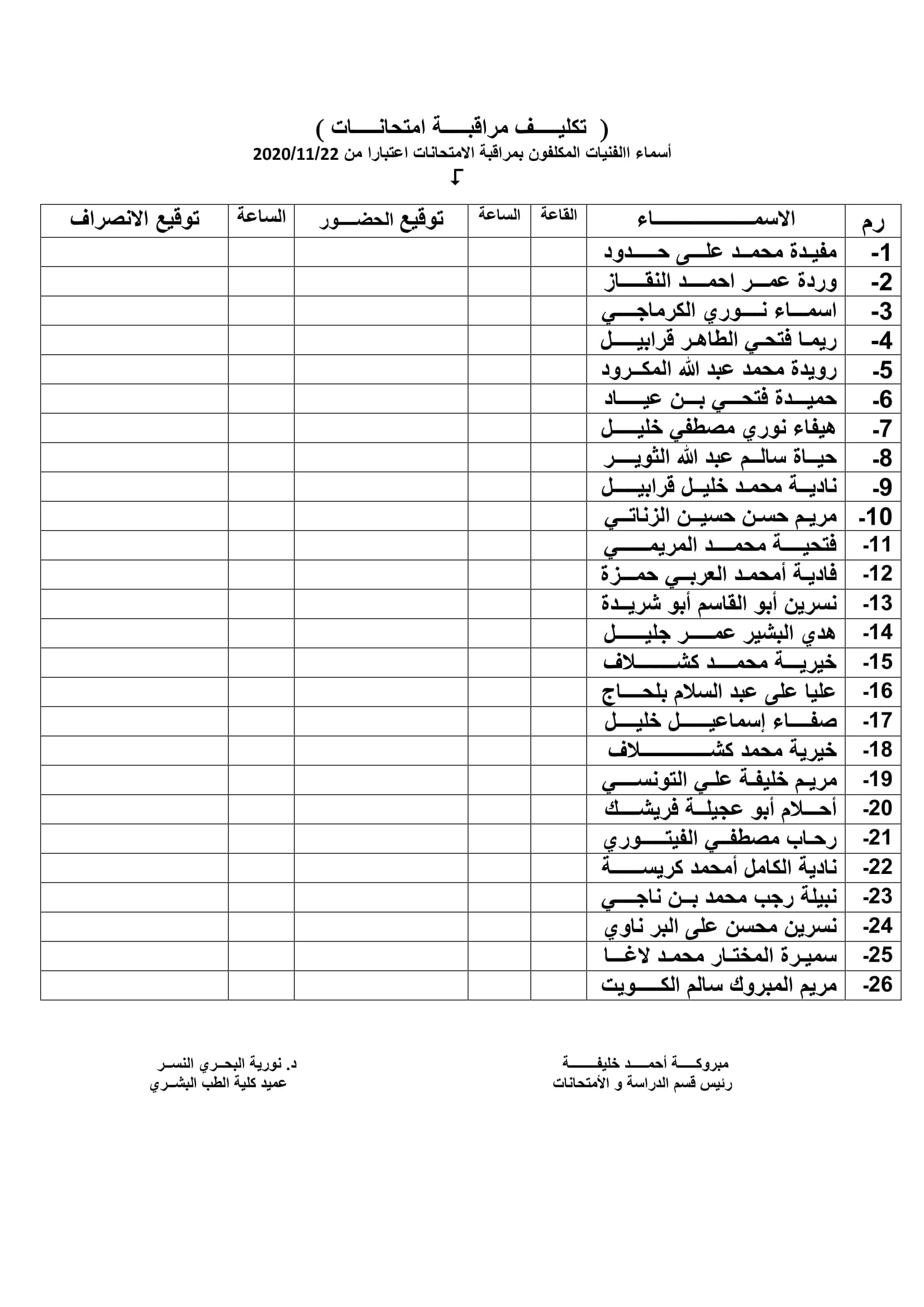 اسماء المكلفين بمراقبة الامتحانات النهائية (الدور الأول) لسنة الاعداد الطبي للعام الجامعي 2019-2020 وذلك اعتبارا من يوم الأحد الموافق 22-11-2020 وحتى نهاية الامتحانات.