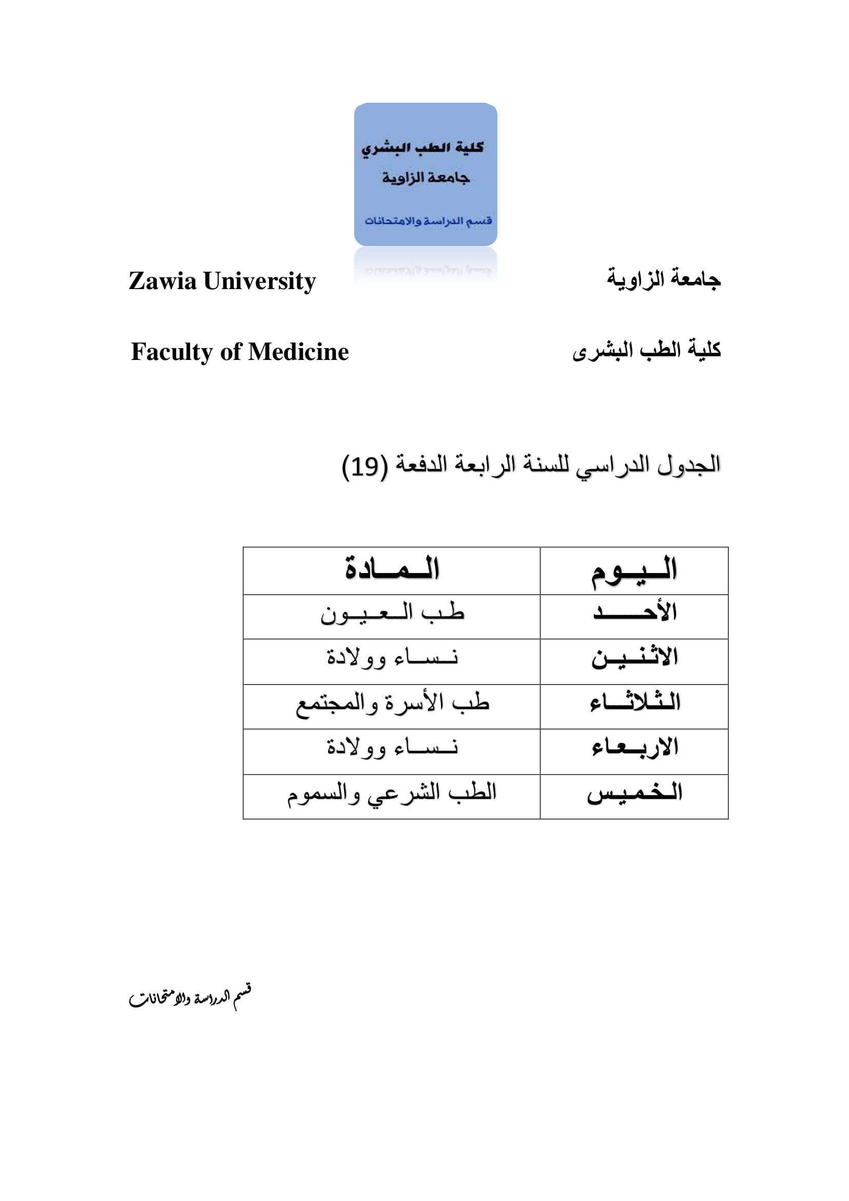 لطلبة السنة الرابعة الدفعة 19 نعلمكم باستئناف الدراسة وذلك ابتداء من يوم الأحد الموافق 10-1-2021 حسب الجدول المرفق.