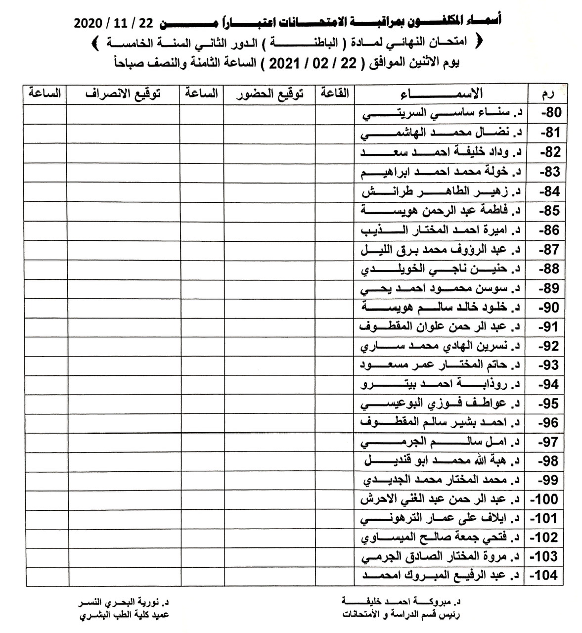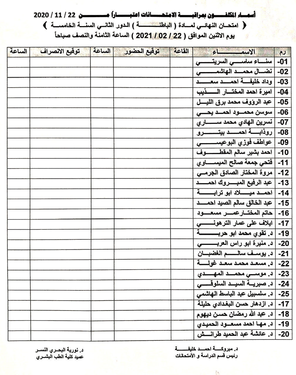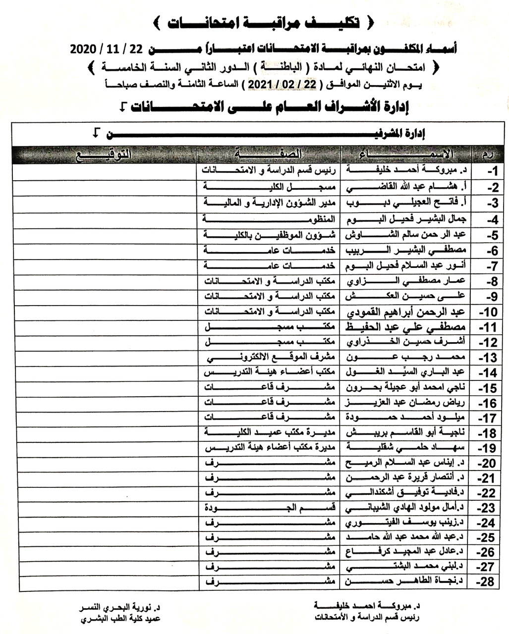 أسماء المكلفين بمراقبة امتحان الدور الثاني لمادة الباطنة للسنة الخامسة الدفعة 14 وذلك يوم الاثنين الموافق 22-2-2021 الساعة الـ08:30 صباحاً.