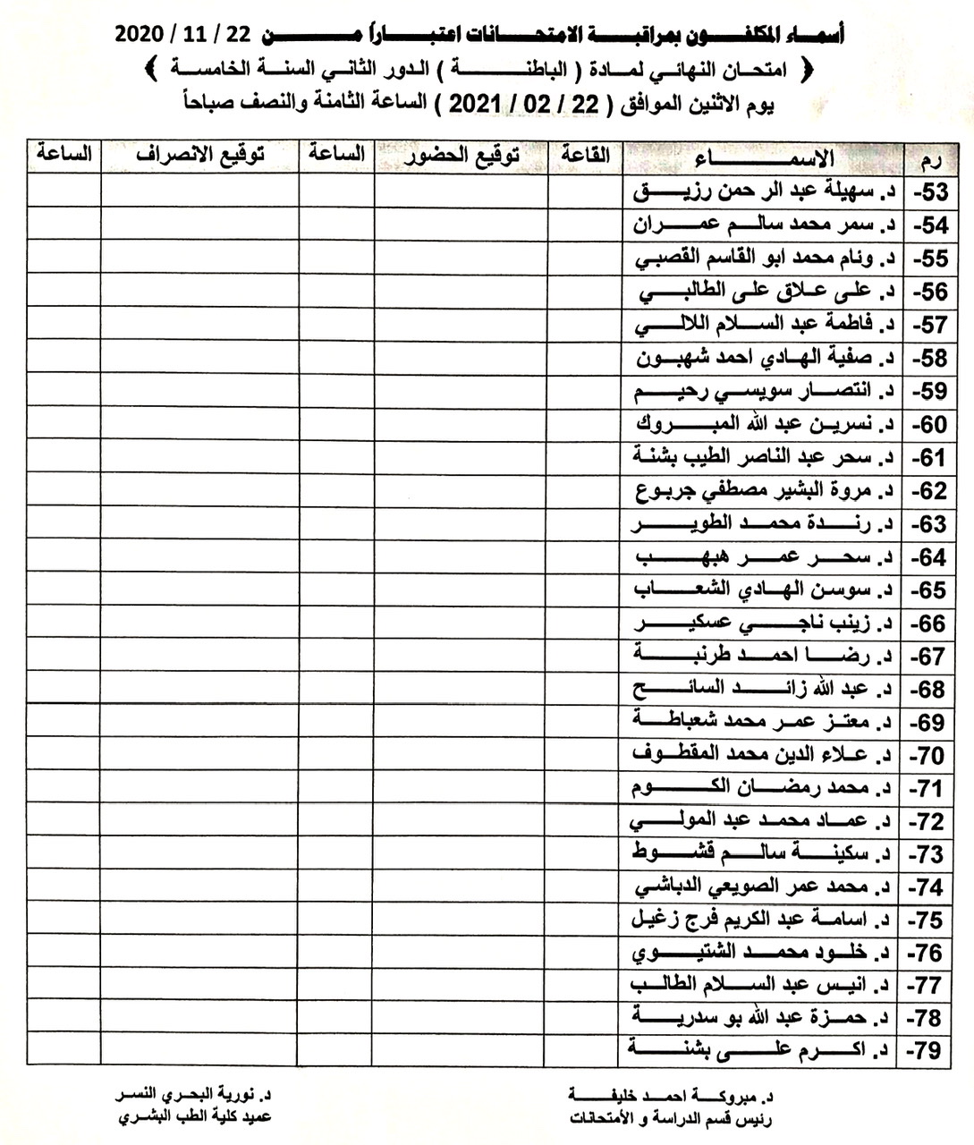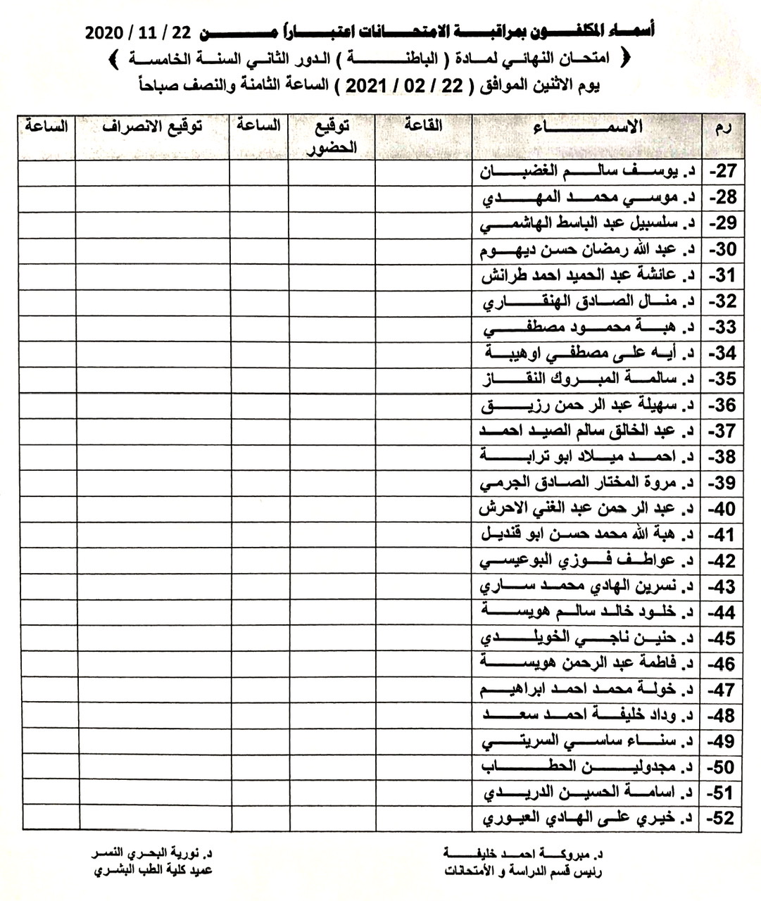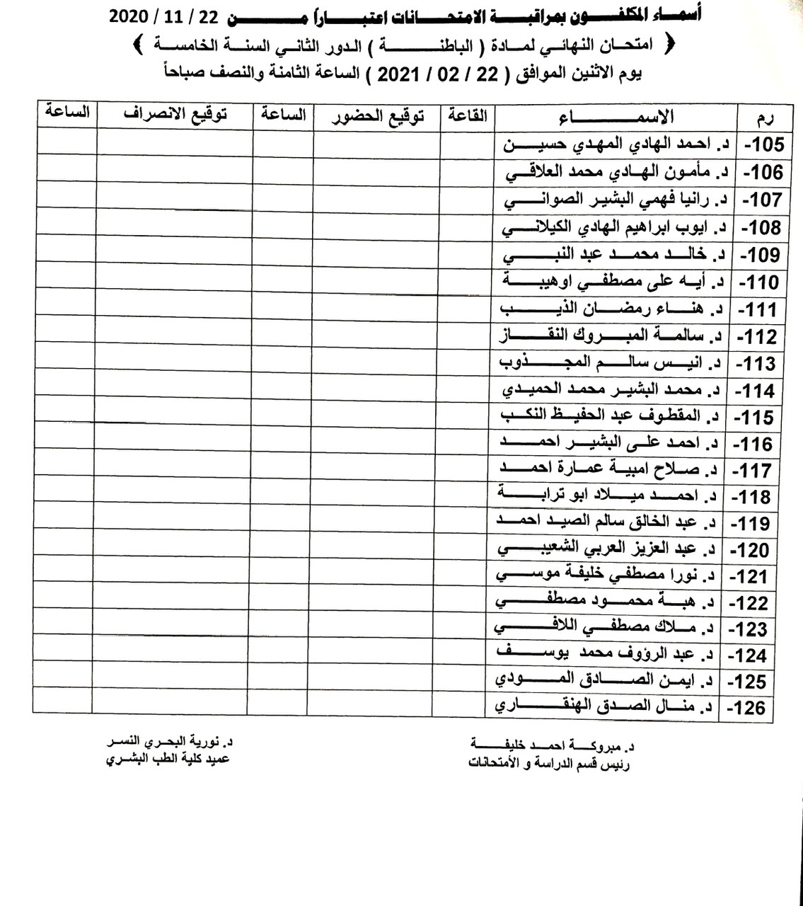 أسماء المكلفين بمراقبة امتحان الدور الثاني لمادة الباطنة للسنة الخامسة الدفعة 14 وذلك يوم الاثنين الموافق 22-2-2021 الساعة الـ08:30 صباحاً.
