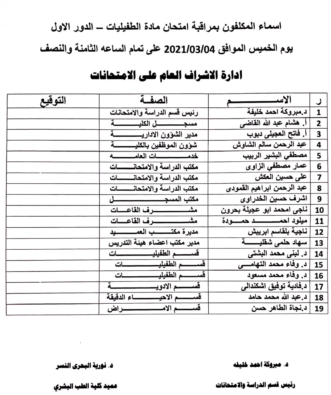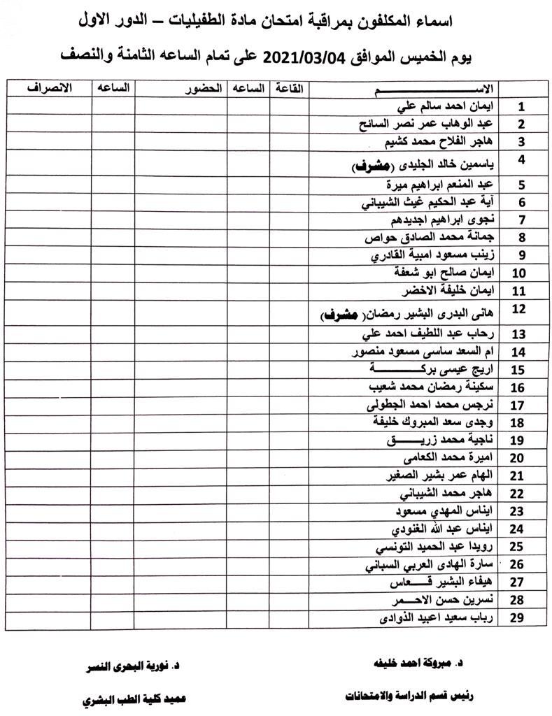 اسماء المكلفين بمراقبة امتحان الدور الاول لمادة الطفيليات للسنة الثالثة طب بشري  للعام الجامعي 2019-2020.