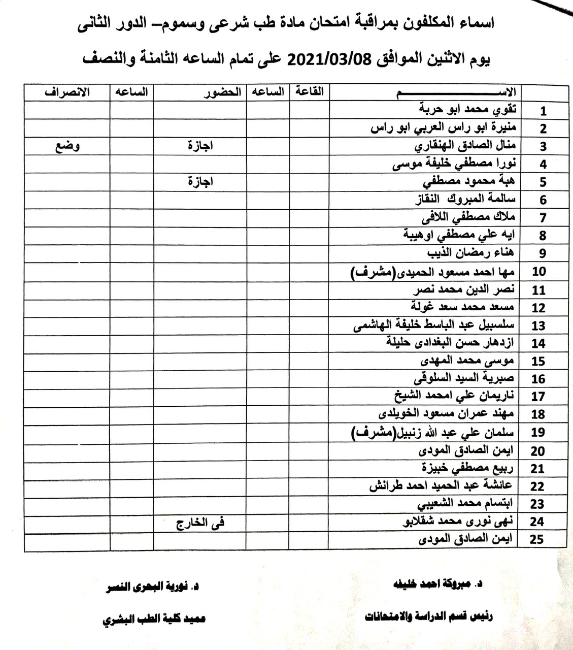 امتحان الطب الشرعي والسموم يوم الاثنين الموافق 8-3-2021 الساعة 8:30 صباحاً.