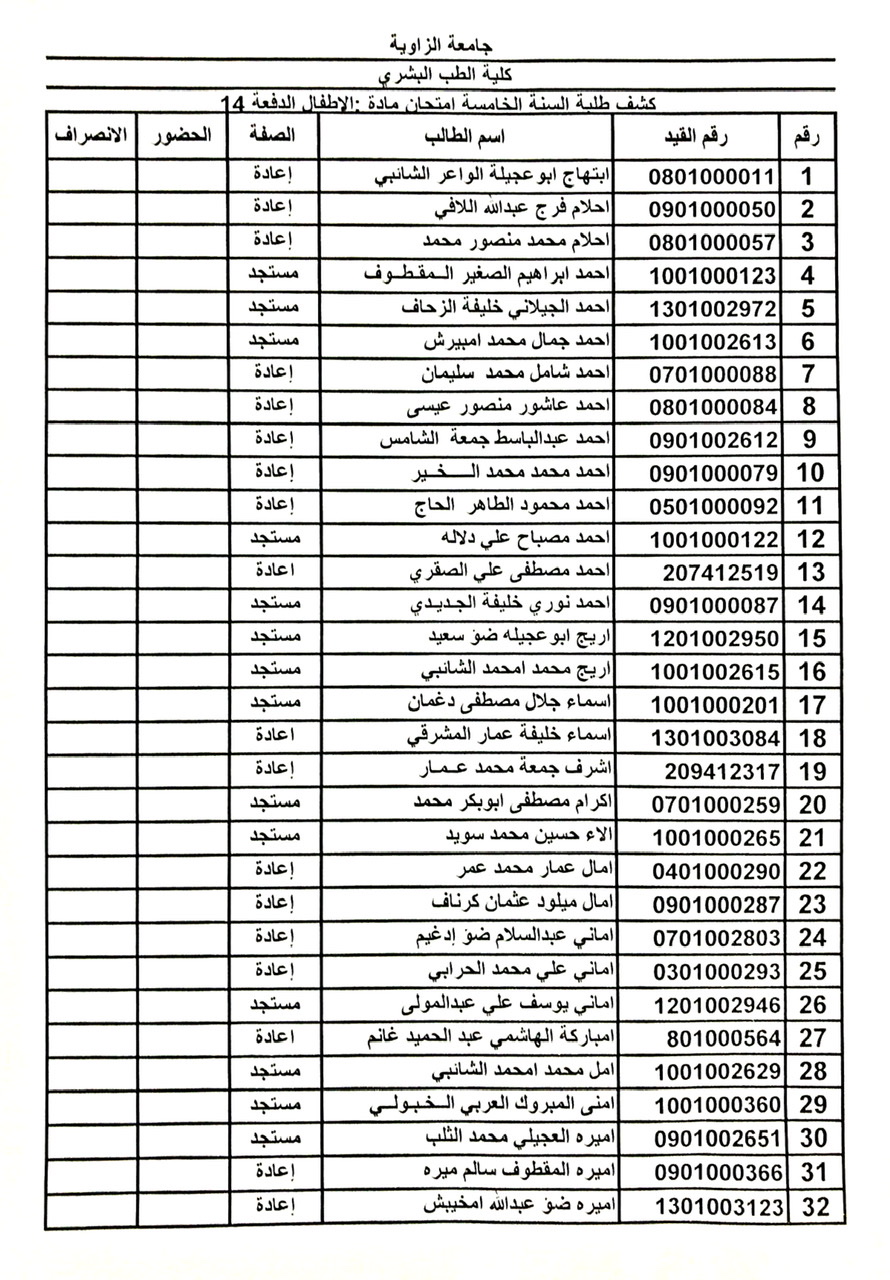 توزيع المجموعات الامتحان السريري الدور الثاني للسنة الخامسة الدفعة 14 بمستشفى الزاوية التعليمي.