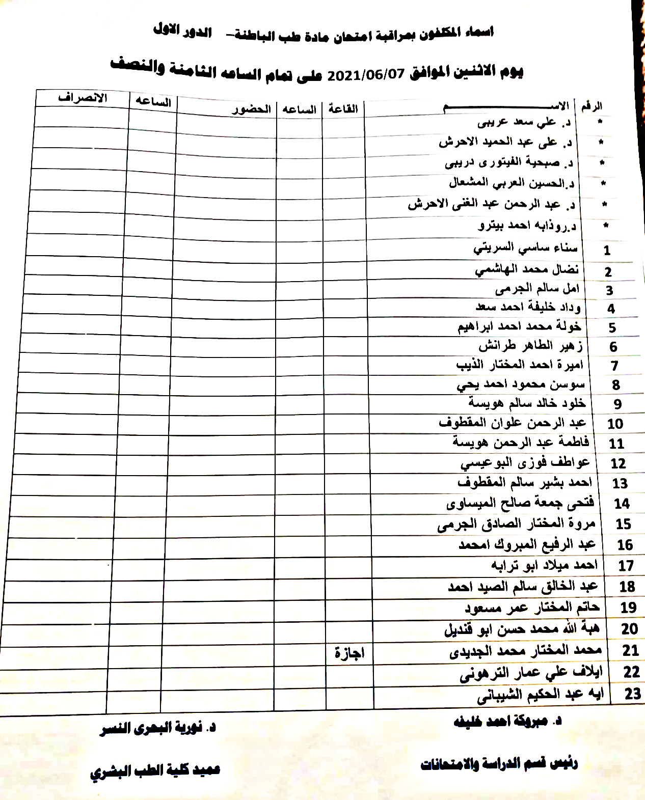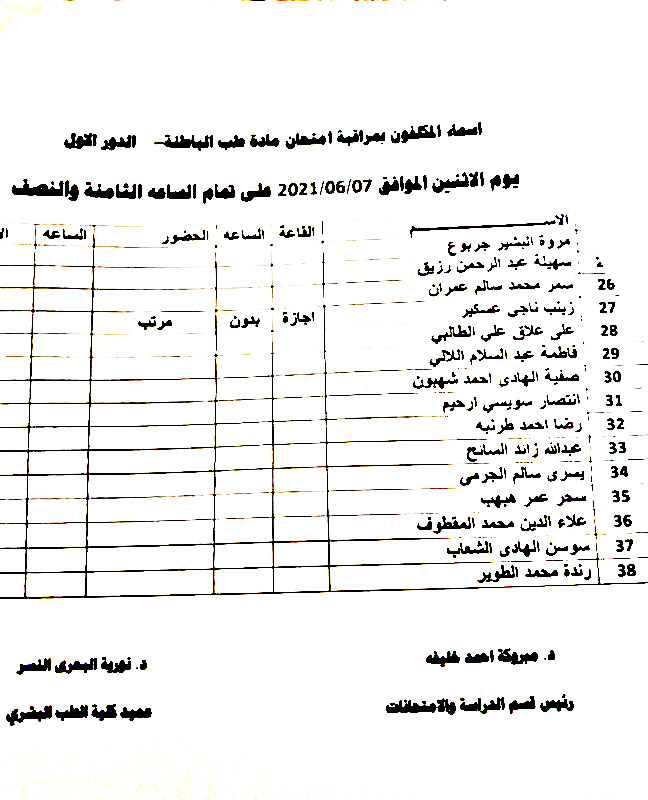 أسماء المكلفين بمراقبة امتحان الدور الأول لمادة الباطنة للسنة الخامسة الدفعة 15 وذلك يوم الاثنين الموافق 7-6-2021 الساعة الـ 08:30 صباحاً.