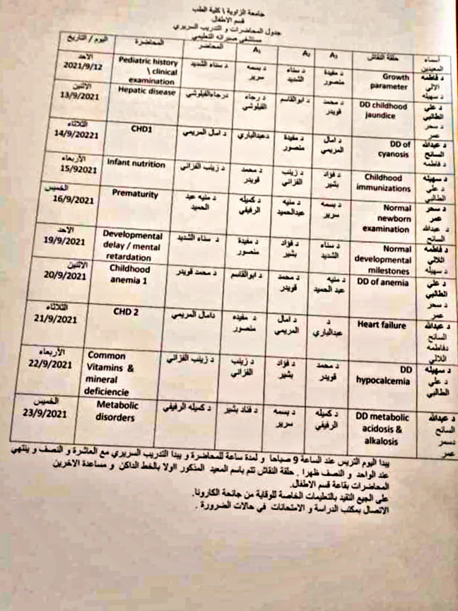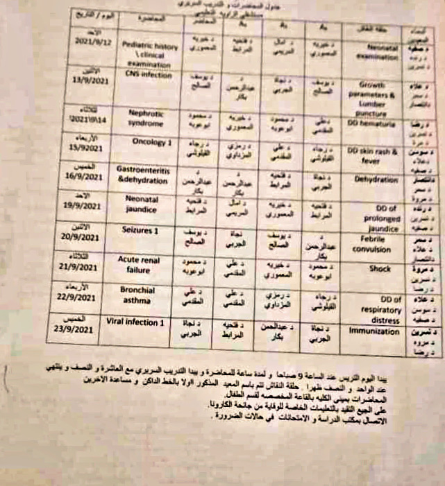 يعلن قسم الأطفال بكلية الطب البشري الزاوية عن بداية المرحلة السريرية للسنة الخامسة الدفعة 16 اعتبارا من يوم الأحد الموافق 12-9-2021 وذلك حسب المجموعات المرفقة بالاعلان