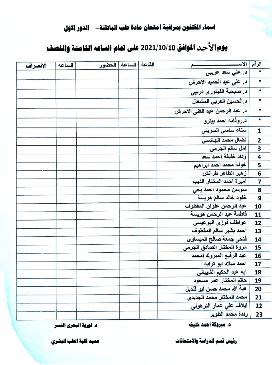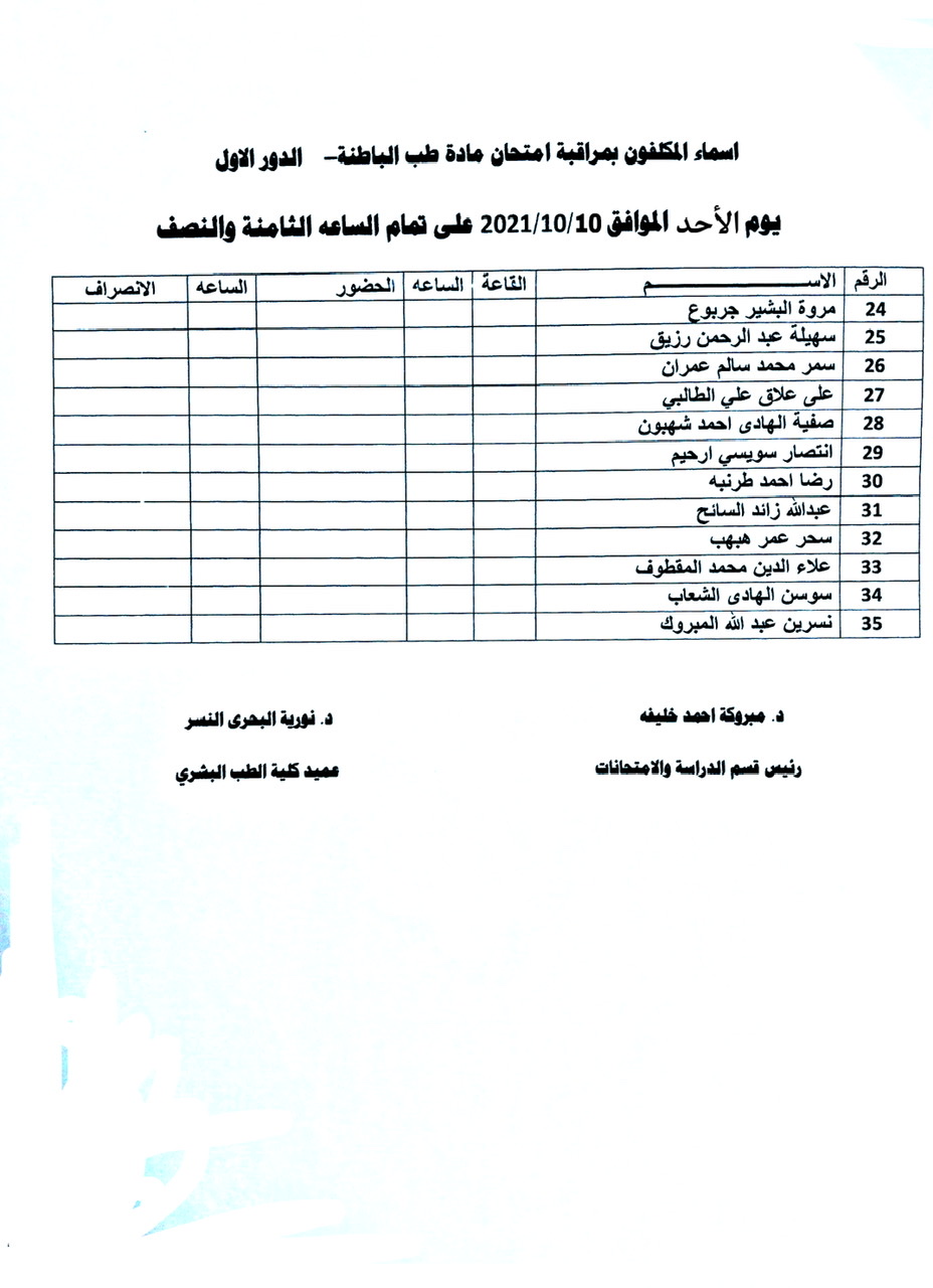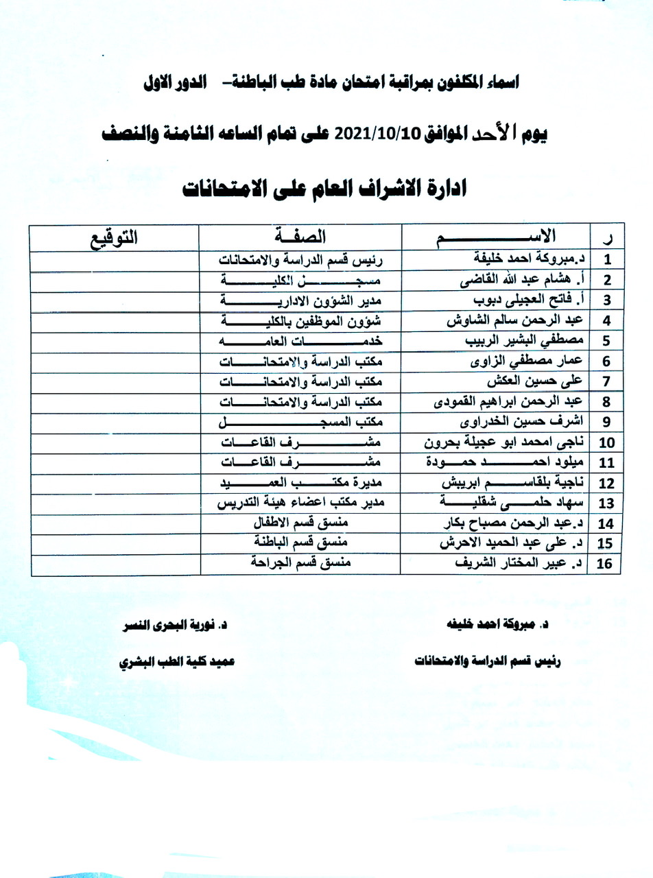 أسماء المكلفين بمراقبة امتحان الدور الأول لمادة الباطنة للسنة الخامسة الدفعة 15 وذلك يوم الأحد الموافق 10-10-2021 الساعة الـ08:30 صباحاً.