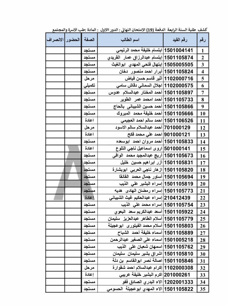 قوائم وتقسيم مجموعات الامتحان الشفوي الدور الأول لمادة طب الأسرة والمجتمع للسنة الرابعة الدفعة 19 والمرحلين