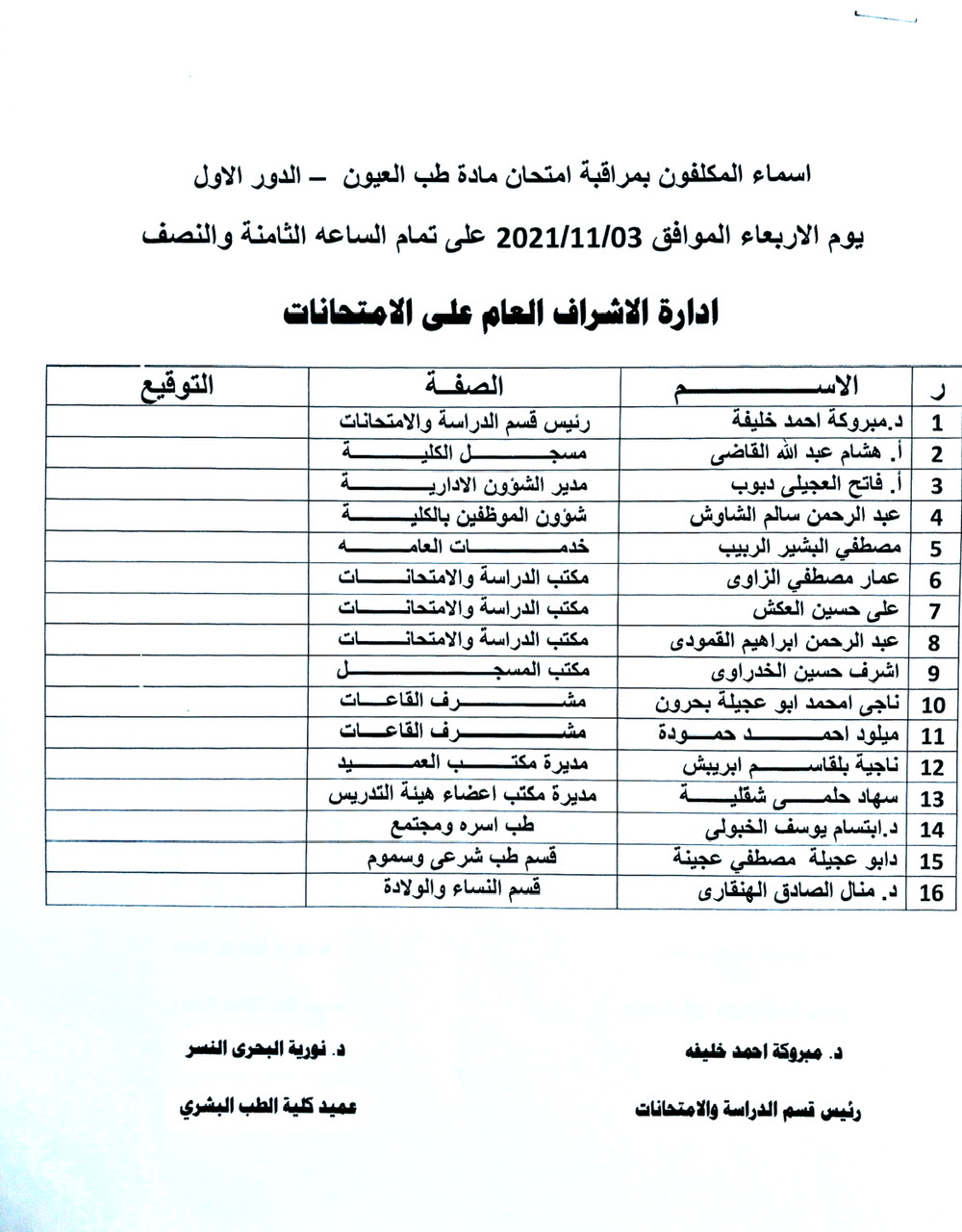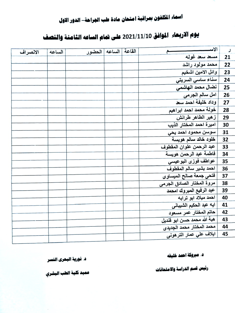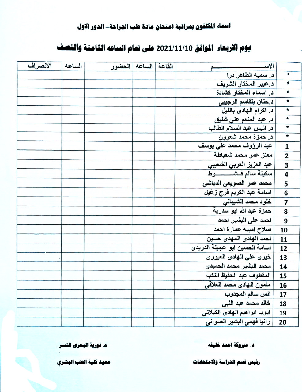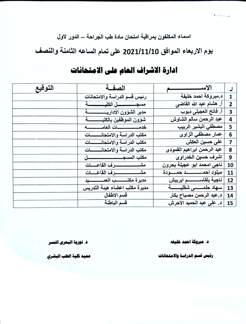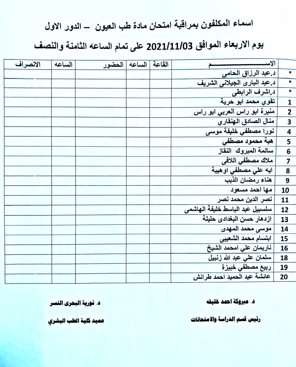 أسماء المكلفين بمراقبة امتحانات الدور الأول لكل من: امتحان العيون للسنة الرابعة الدفعة 19 وذلك يوم الأربعاء الموافق 3-11-2021 الساعة الـ08:30 صباحاً. امتحان الجراحة للسنة الخامسة الدفعة 15 وذلك يوم الأربعاء الموافق 10-11-2021 الساعة الـ08:30 صباحاً.