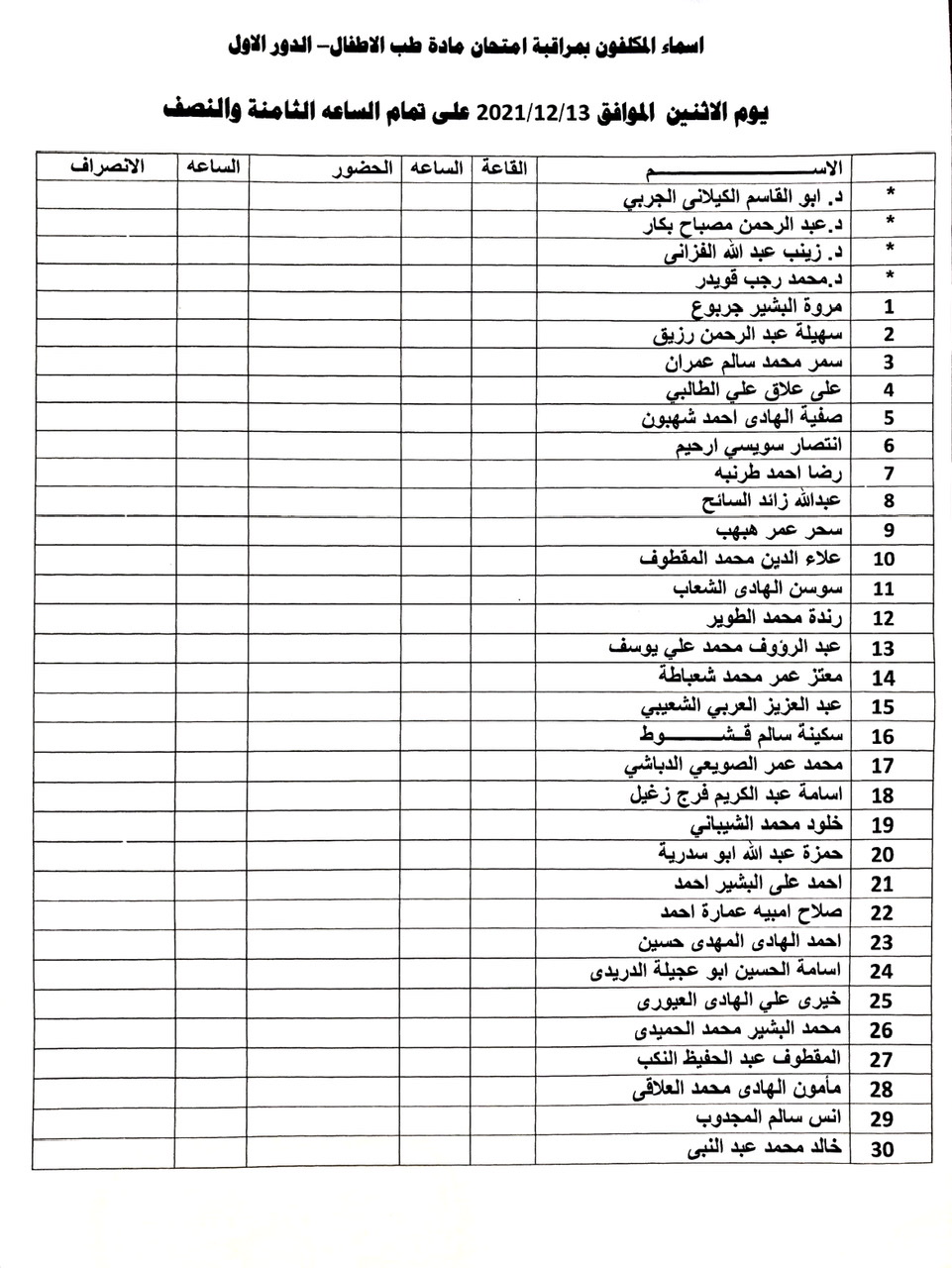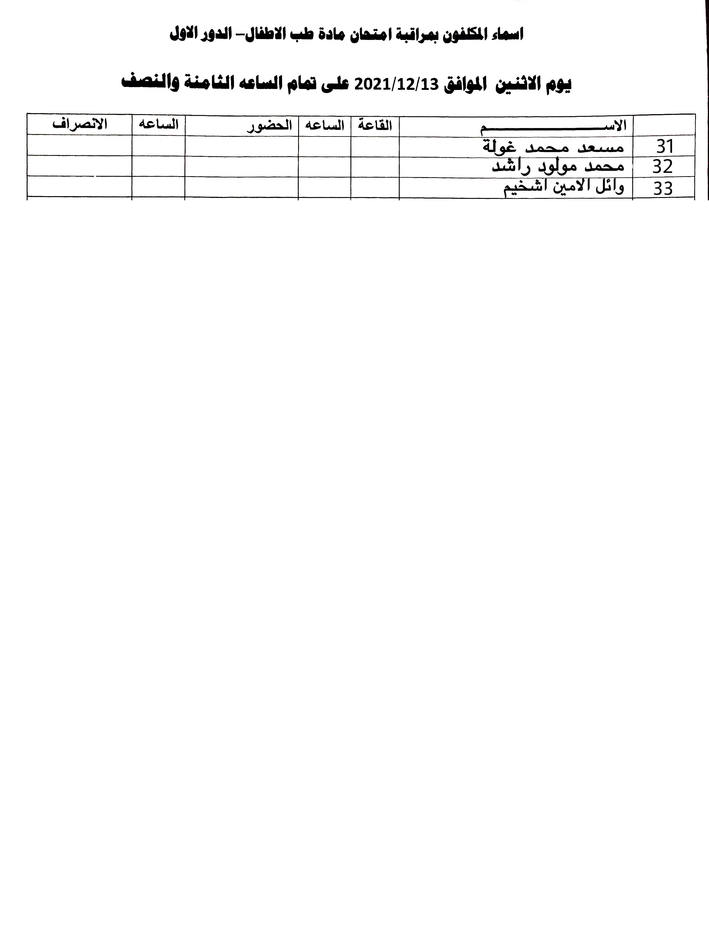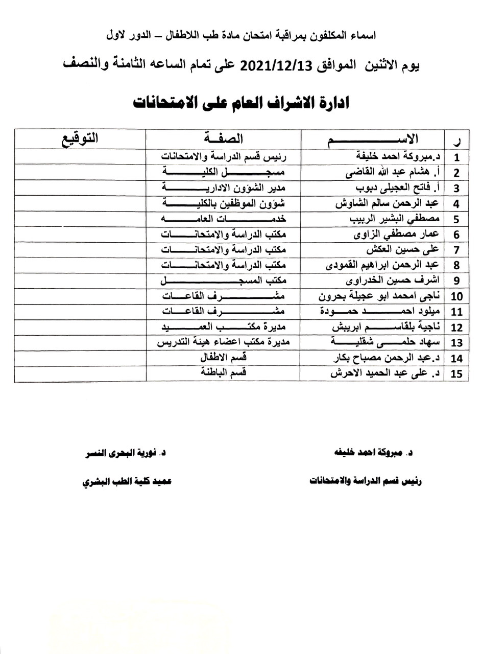 أسماء المكلفين بمراقبة امتحان الدور الأول لمادة الأطفال للسنة الخامسة الدفعة 15 وذلك يوم الغد الاثنين الموافق 13-12-2021 الساعة الـ08:30 صباحاً.