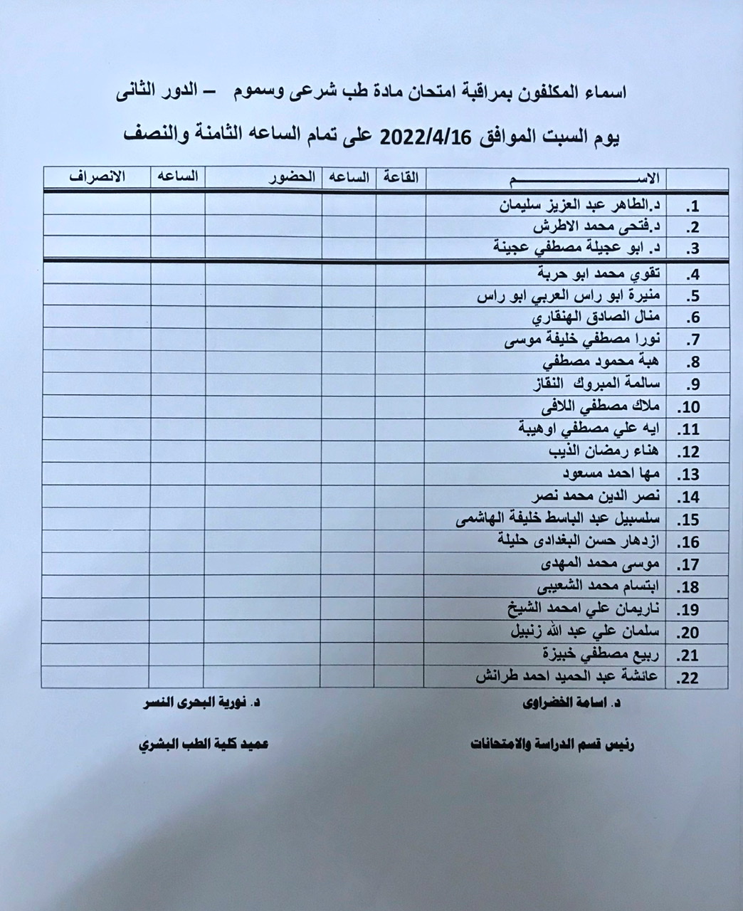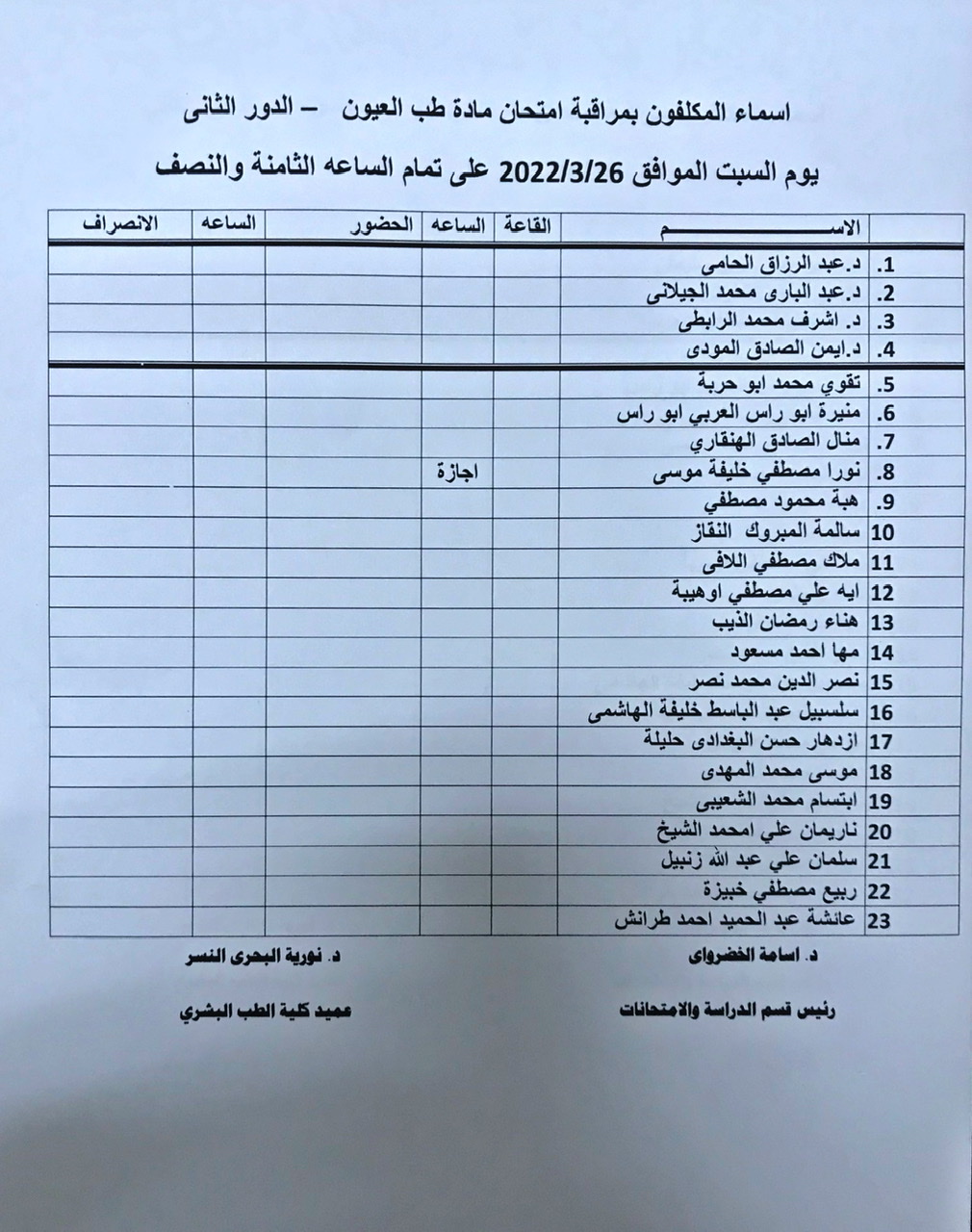 أسماء المكلفين بمراقبة امتحانات الدور الثاني للسنة الرابعة الدفعة 19.
