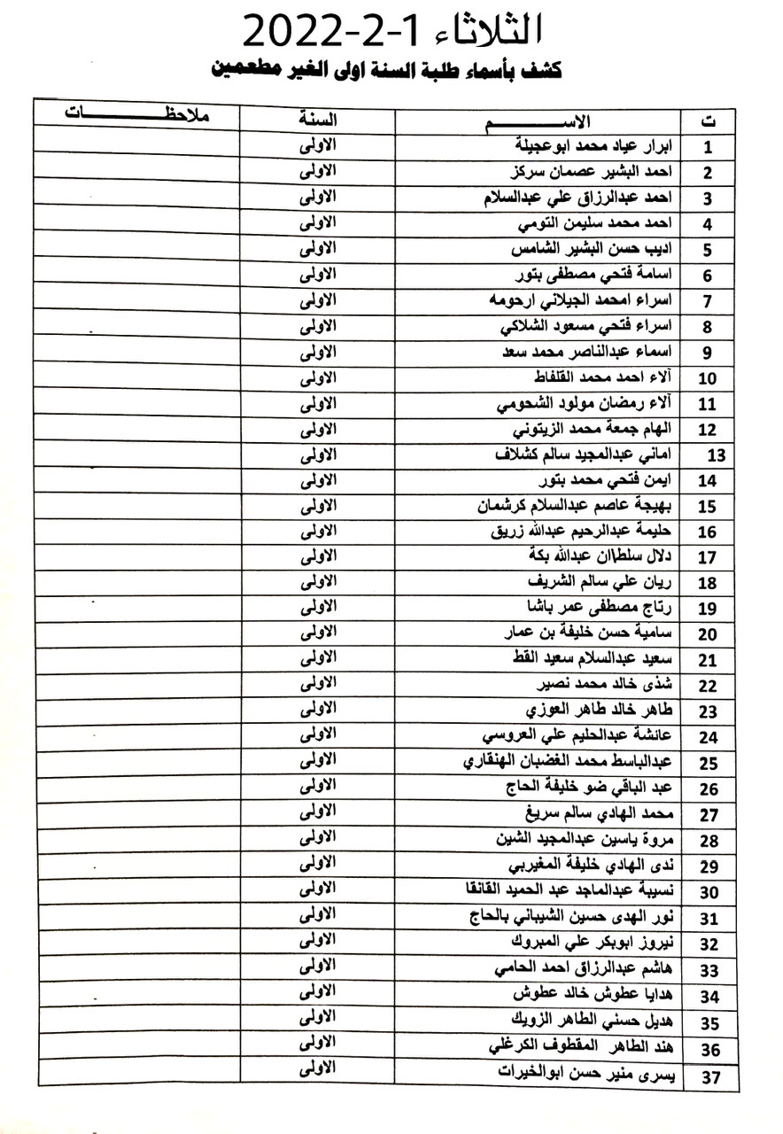 على الطلبة المدرجة أسماؤهم في القوائم مراجعة مكتب المسجل كل حسب الأيام المحددة في القوائم واحضار مايثبت تلقيهم التطعيم ضد فايروس كورونا .