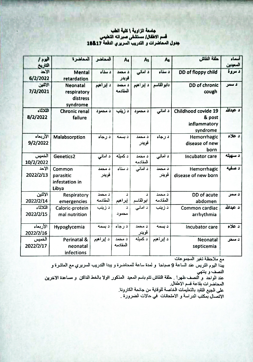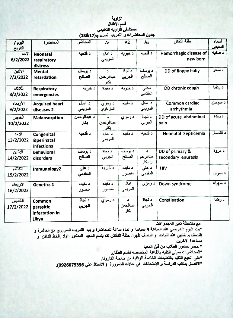 جدول المحاضرات السريرية لمادة الاطفال للسنة الخامسة الدفعة 18،17مجموعات مستشفى الزاوية التعليمي A1,A2,A3