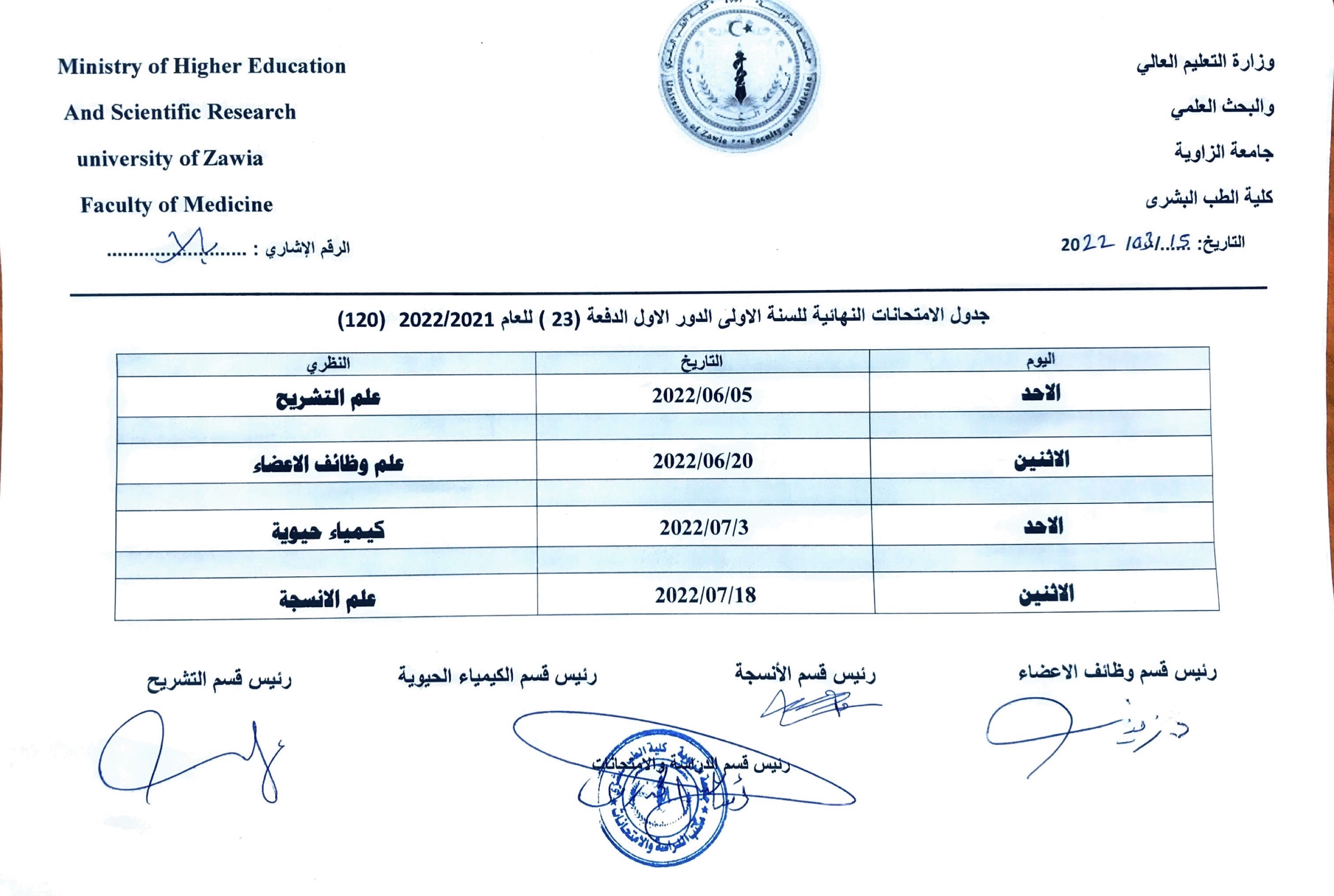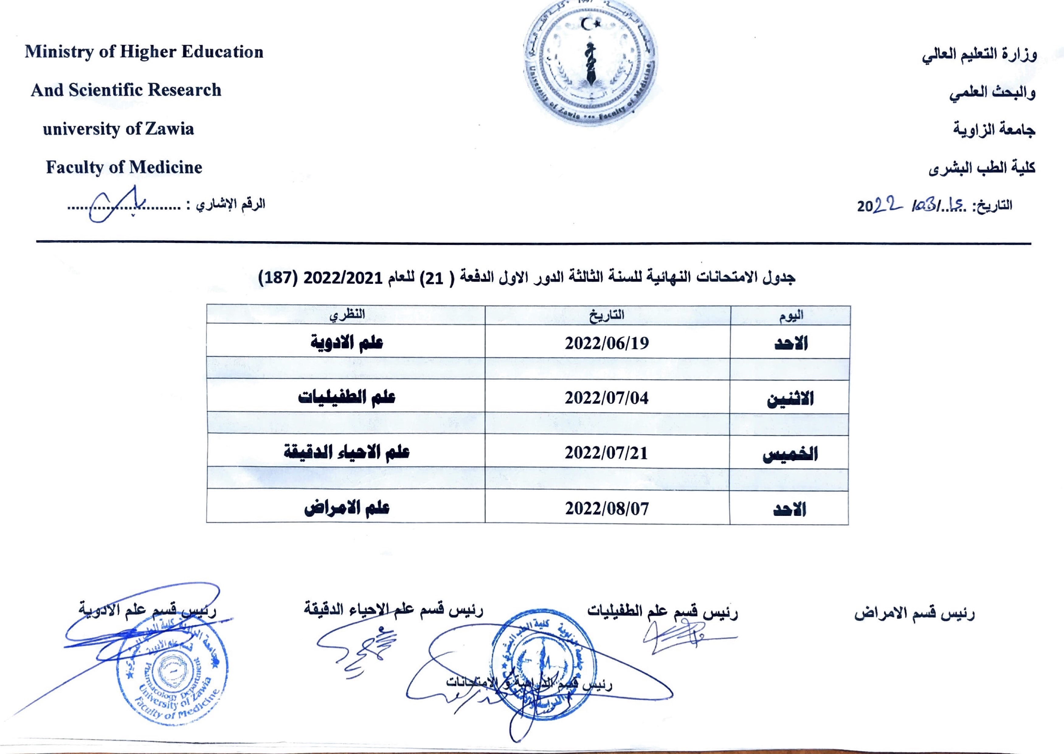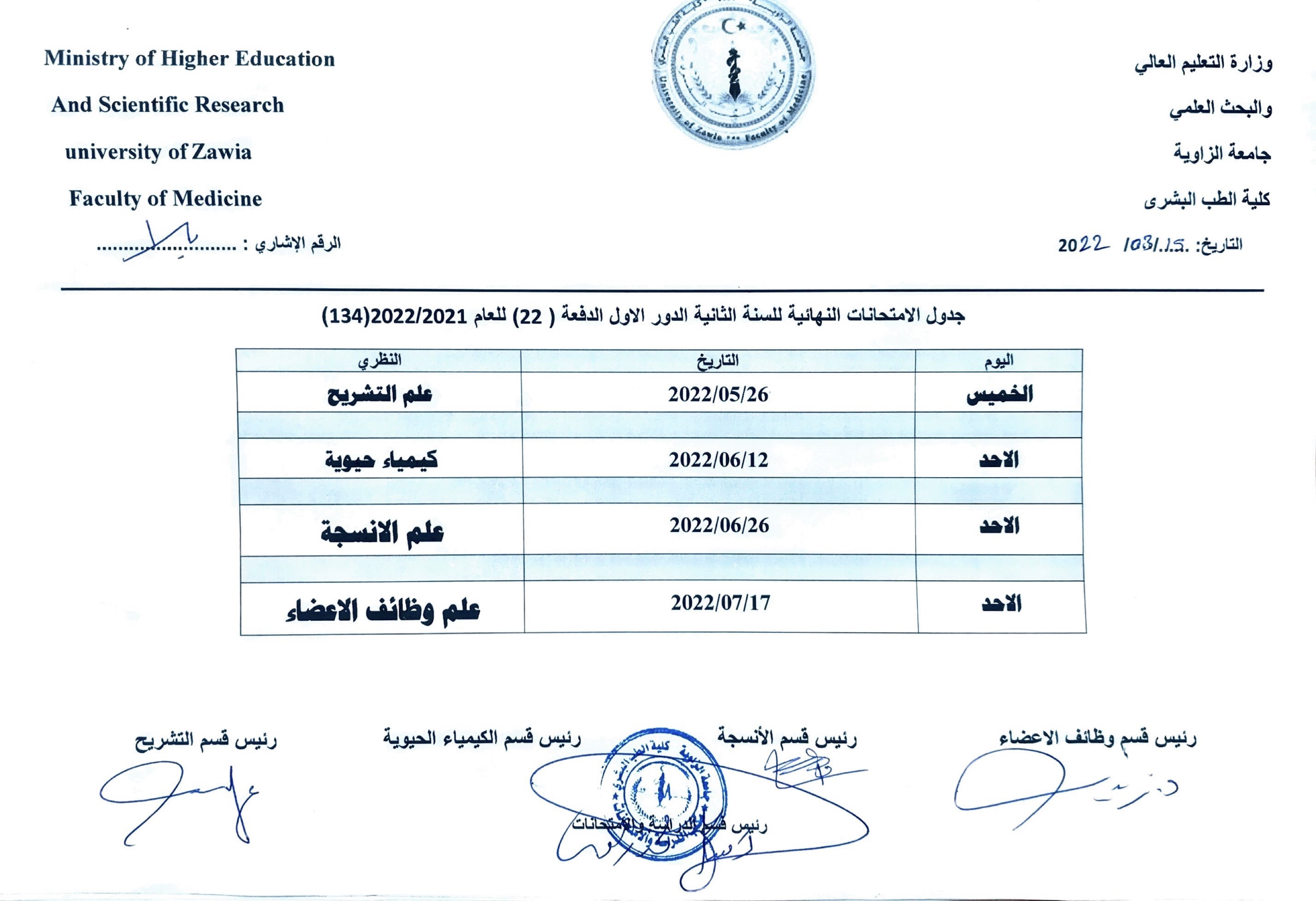 جداول الامتحانات النهائيه الدور الأول للسنوات الاولى والثانيه والثالثه طب بشري