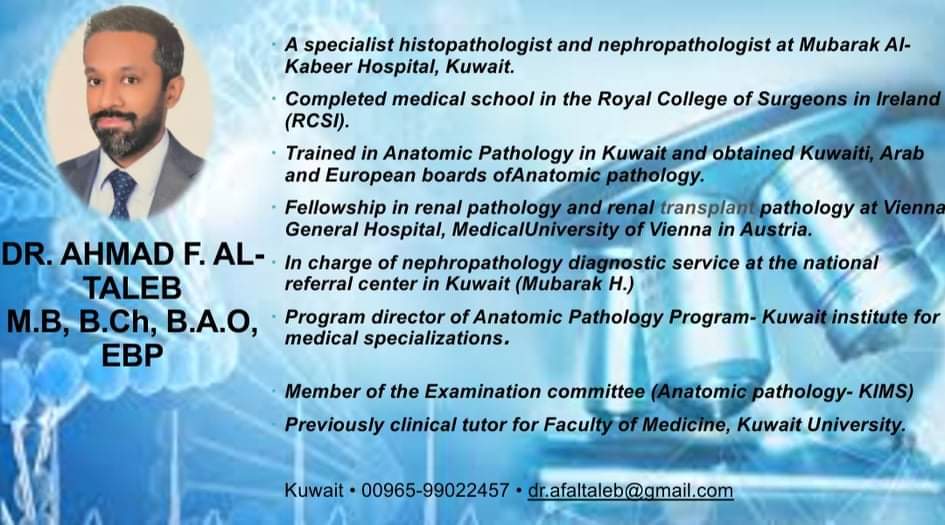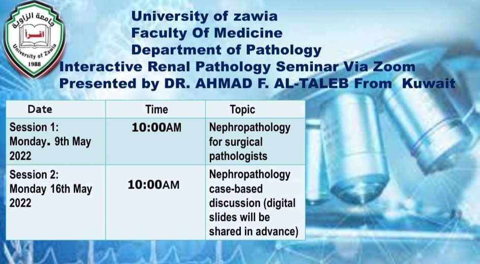 في اطار التعليم الطبي المستمر والرفع من الكفاءات التشخيصية لأطباء علم الأمراض في ليبيا وأعضاء هيئة التدريس والمعيدين بقسم علم الأمراض بكلية الطب البشري جامعة الزاوية وبالتعاون مع الكفاءات والخبرات من أطباء الوطن العربى في هذا المجال يستضيف قسم علم الأمراض كلية الطب البشري جامعة الزاوية وعبر تقنية الزوم ضيف الشرف الأستشاري في علم الأمراض من دولة الكويت الدكتور أحمد الطالب و علي يومين كما هو موضح بالجدول الورشة حول تشخيص أمراض الكلي ومناقشة بعض الحالات المرضية يوم الاثنين القادم الساعة العاشرة صباحا بتوقيت ليبيا وستنقل المحاضرة داخل قاعة التعليم الالكتروني بالكلية لمن لديه الرغبة بالحضور الدعوة لكل الأطباء وأعضاء هيئة التدريس والمهتمين بهذا المجال لمتابعة المحاضرات عبر رابط الزوم