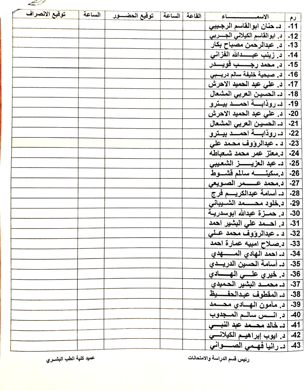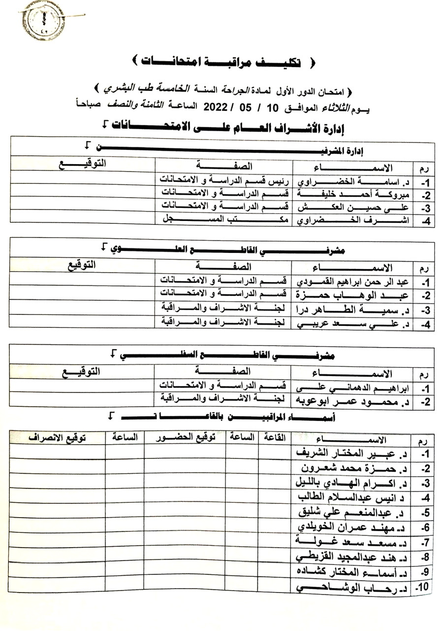 اسماء المكلفين بمراقبة امتحان الدور الأول لمادة الجراحة للسنة الخامسة الدفعة 16 وذلك يوم الثلاثاء الموافق 10-5-2022 الساعة الـ08:30 صباحاً.