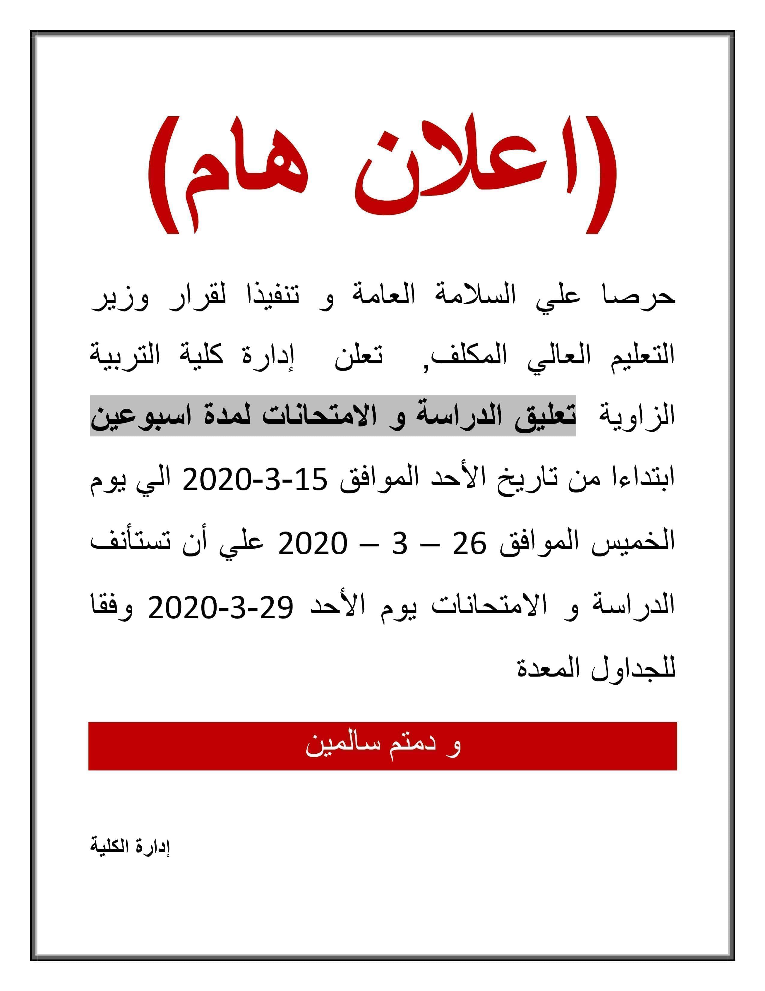 حرصا علي السلامة العامة و تنفيذا لقرار وزير التعليم العالي المكلف, تعلن إدارة كلية التربية الزاوية تعليق الدراسة و الامتحانات لمدة اسبوعين ابتداءا من تاريخ الأحد الموافق 15-3-2020 الي يوم الخميس الموافق 26 – 3 – 2020 علي أن تستأنف الدراسة و الامتحانات يوم الأحد 29-3-2020 وفقا للجداول المعدة