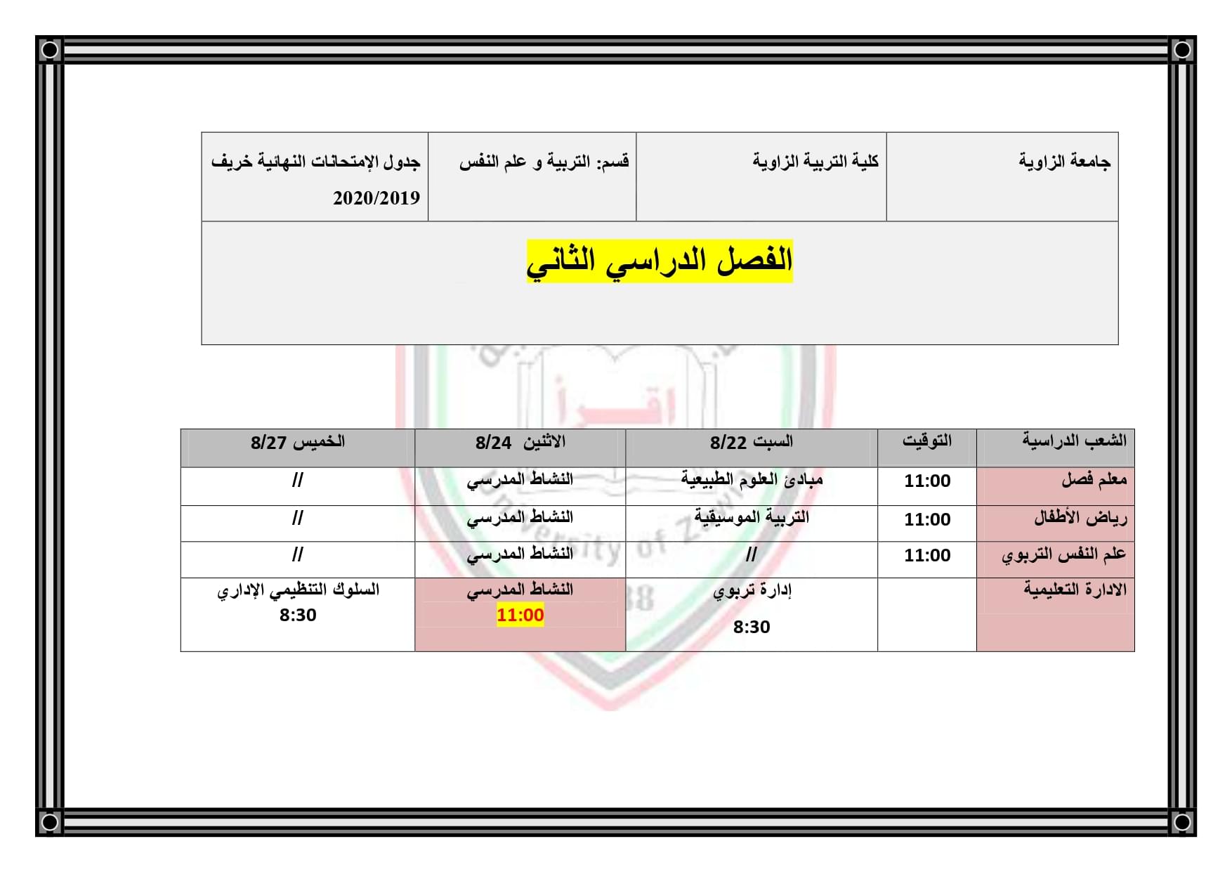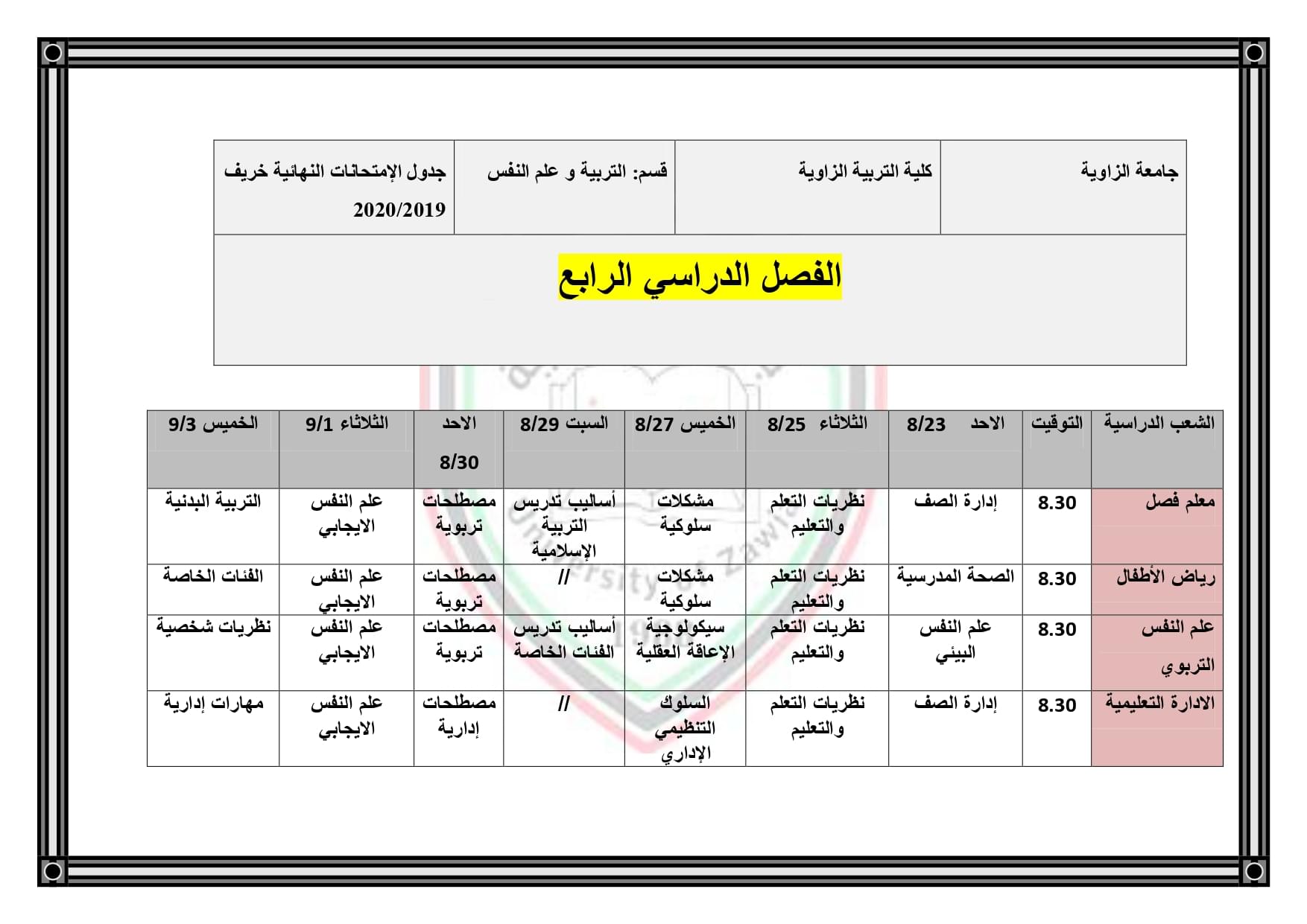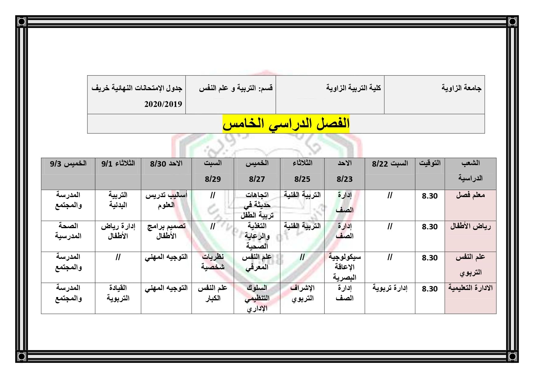 جدول الإمتحانات النهائية لقسم التربية و علم النفس