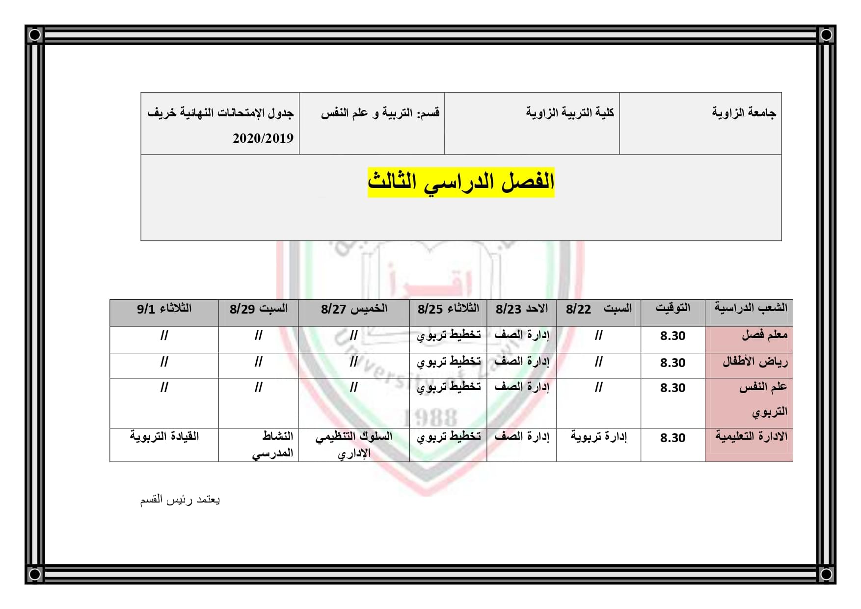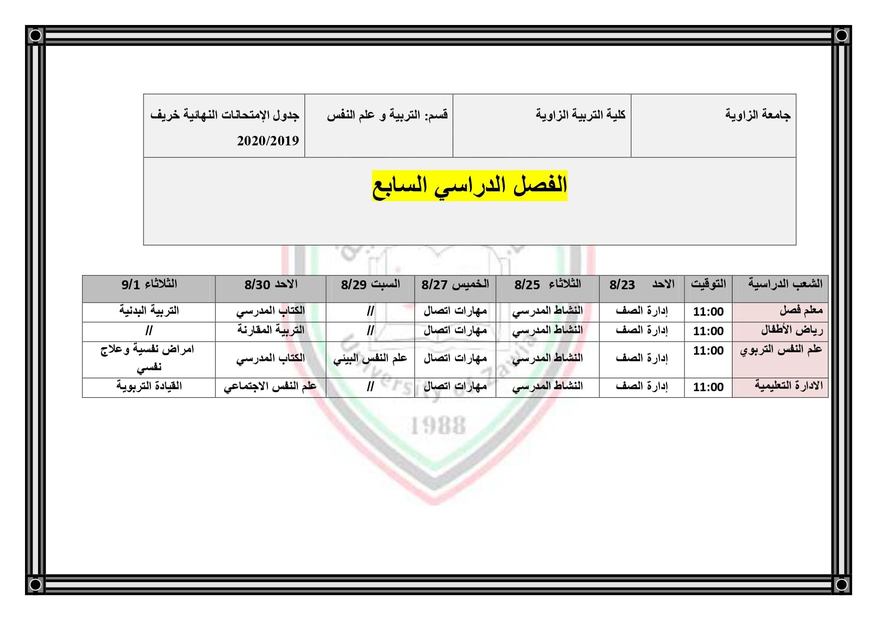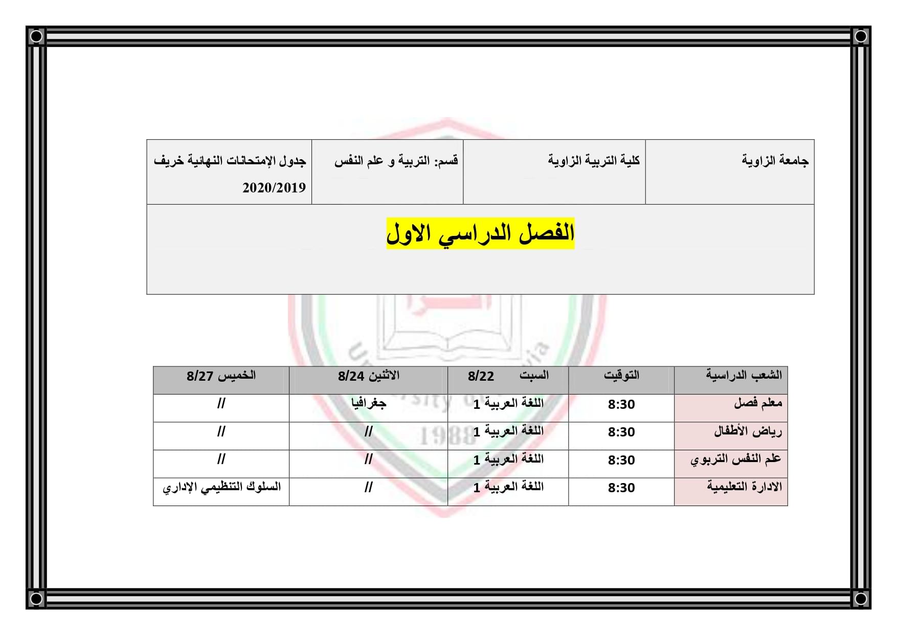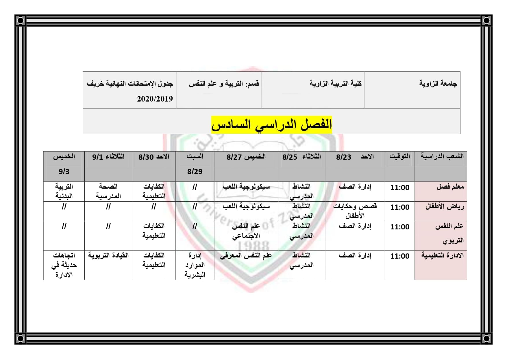 جدول الإمتحانات النهائية لقسم التربية و علم النفس