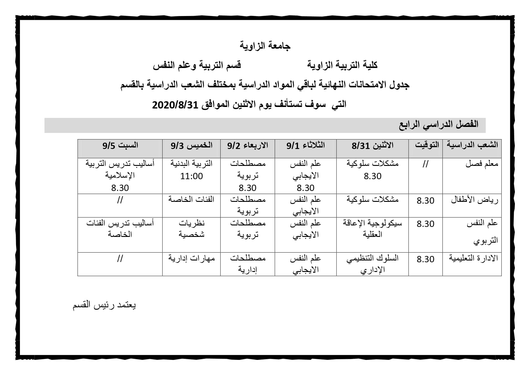 جدول إستكمال الإمتحانات النهائية ( قسم التربية و علم النفس )
