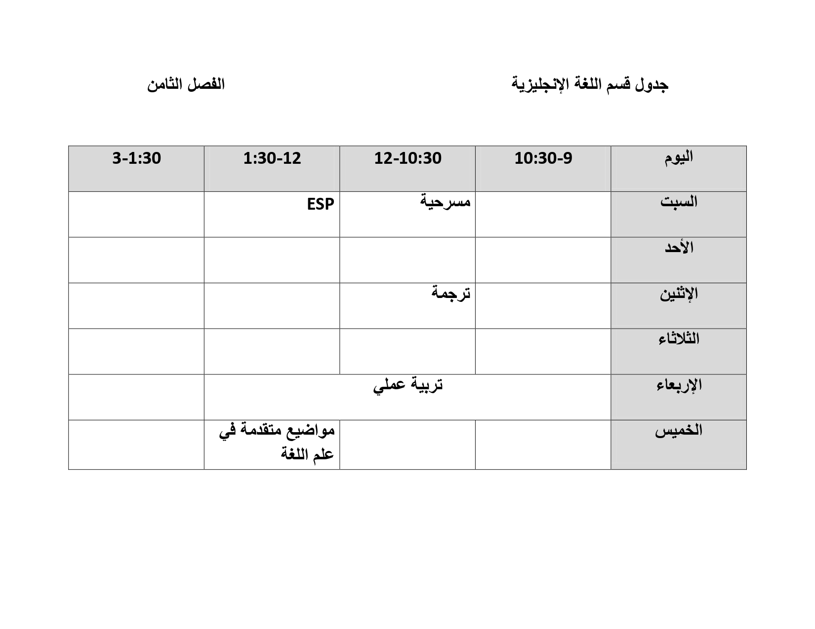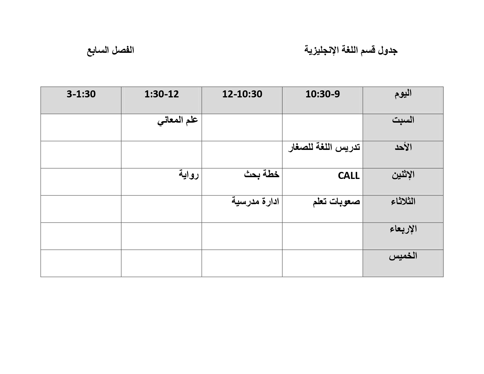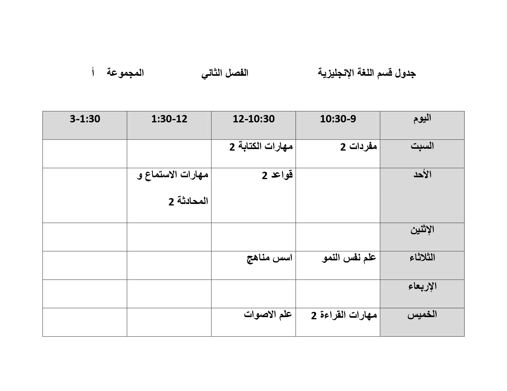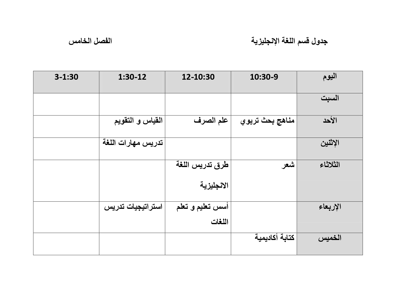 جدول قسم اللغة الإنجليزية