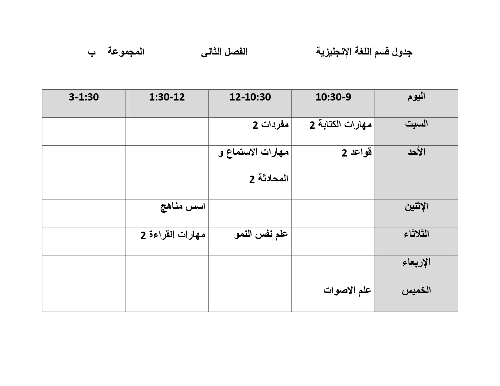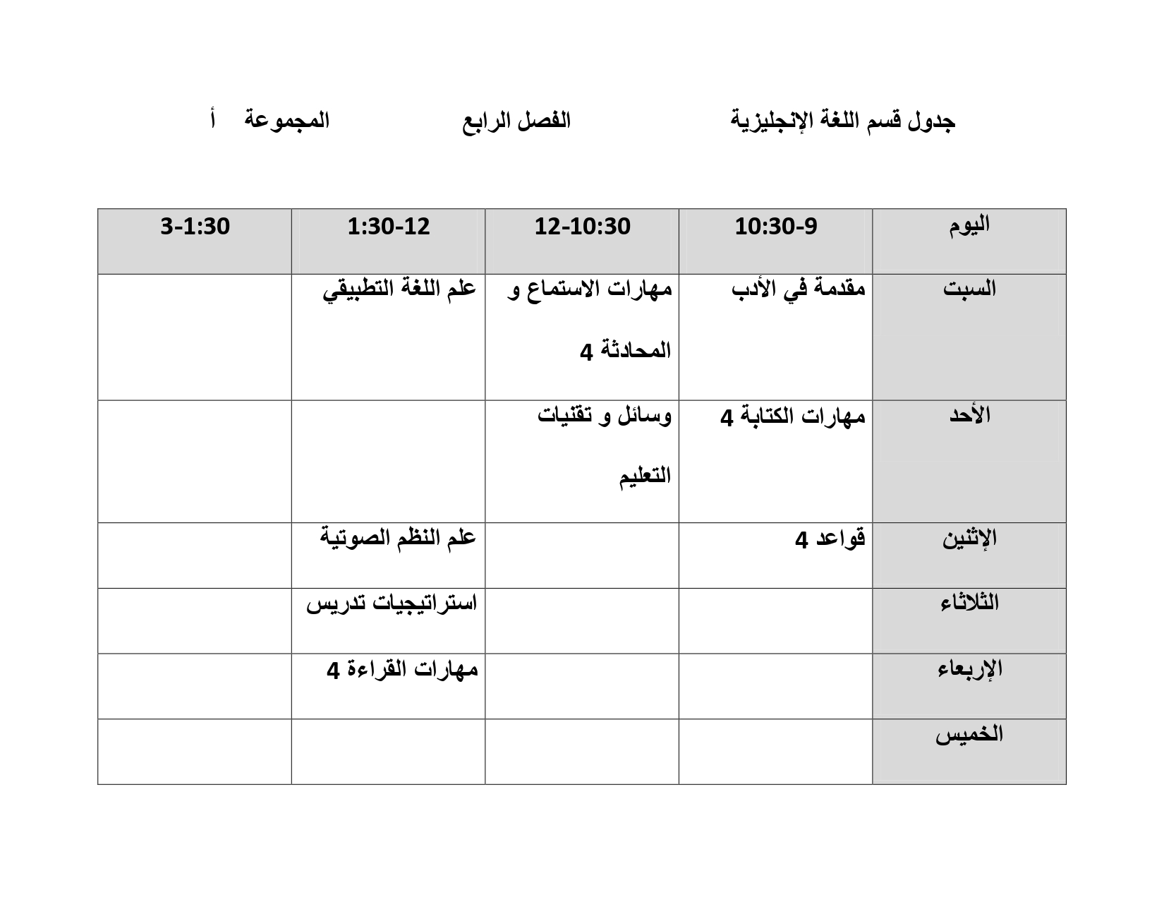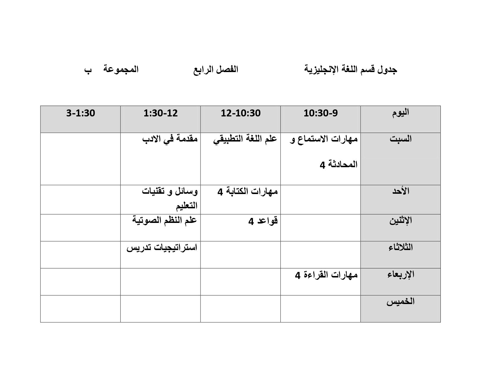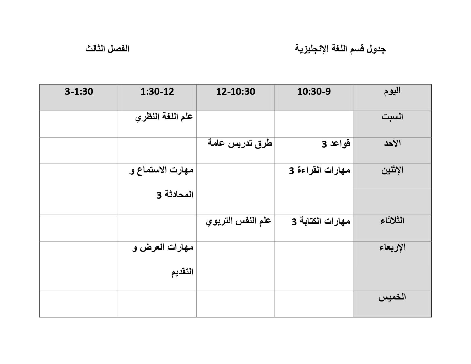 جدول قسم اللغة الإنجليزية