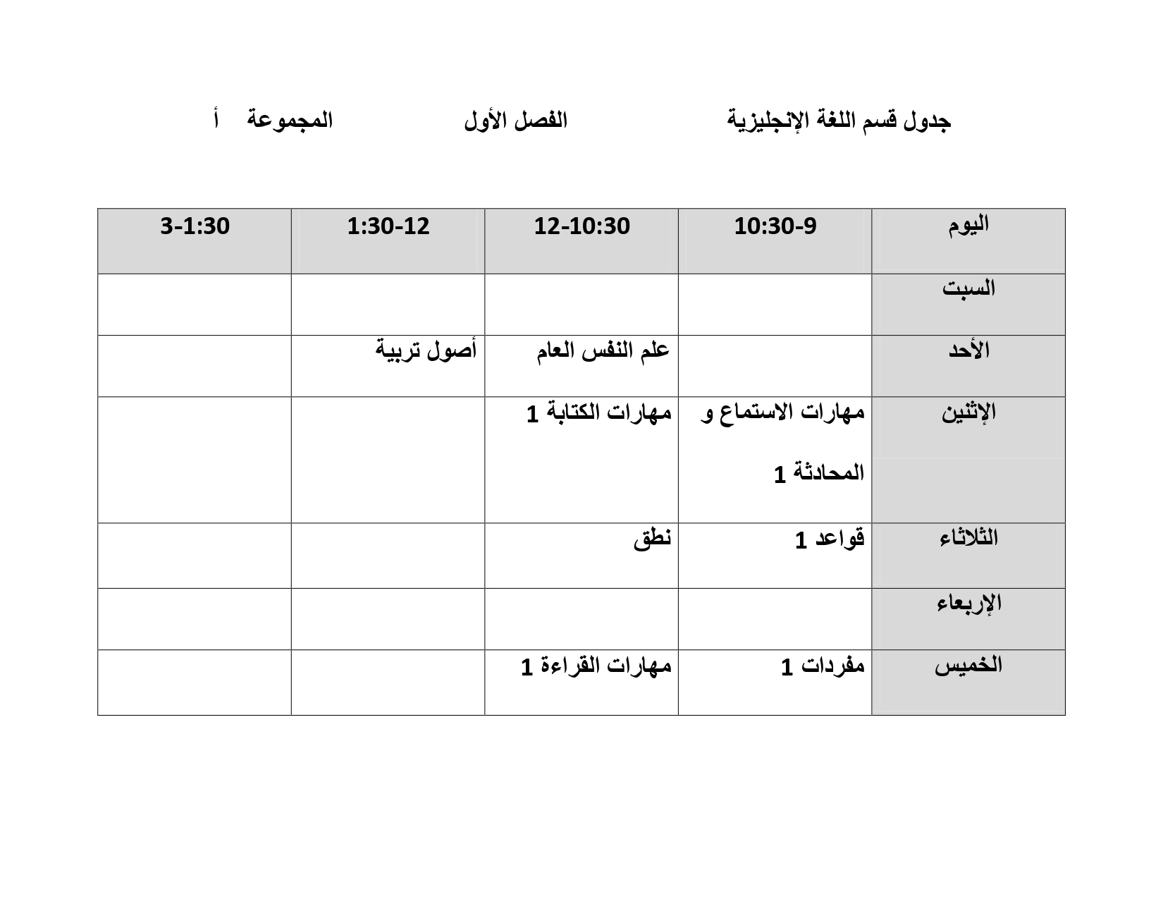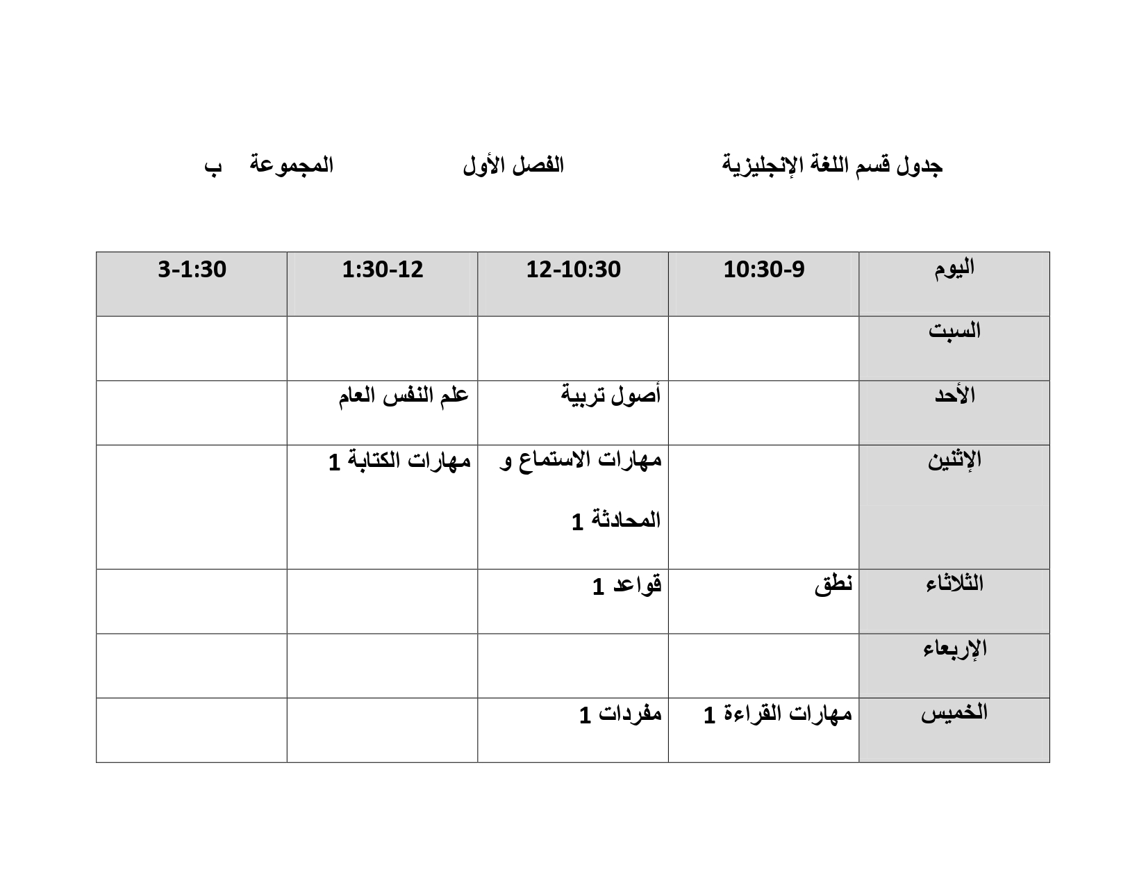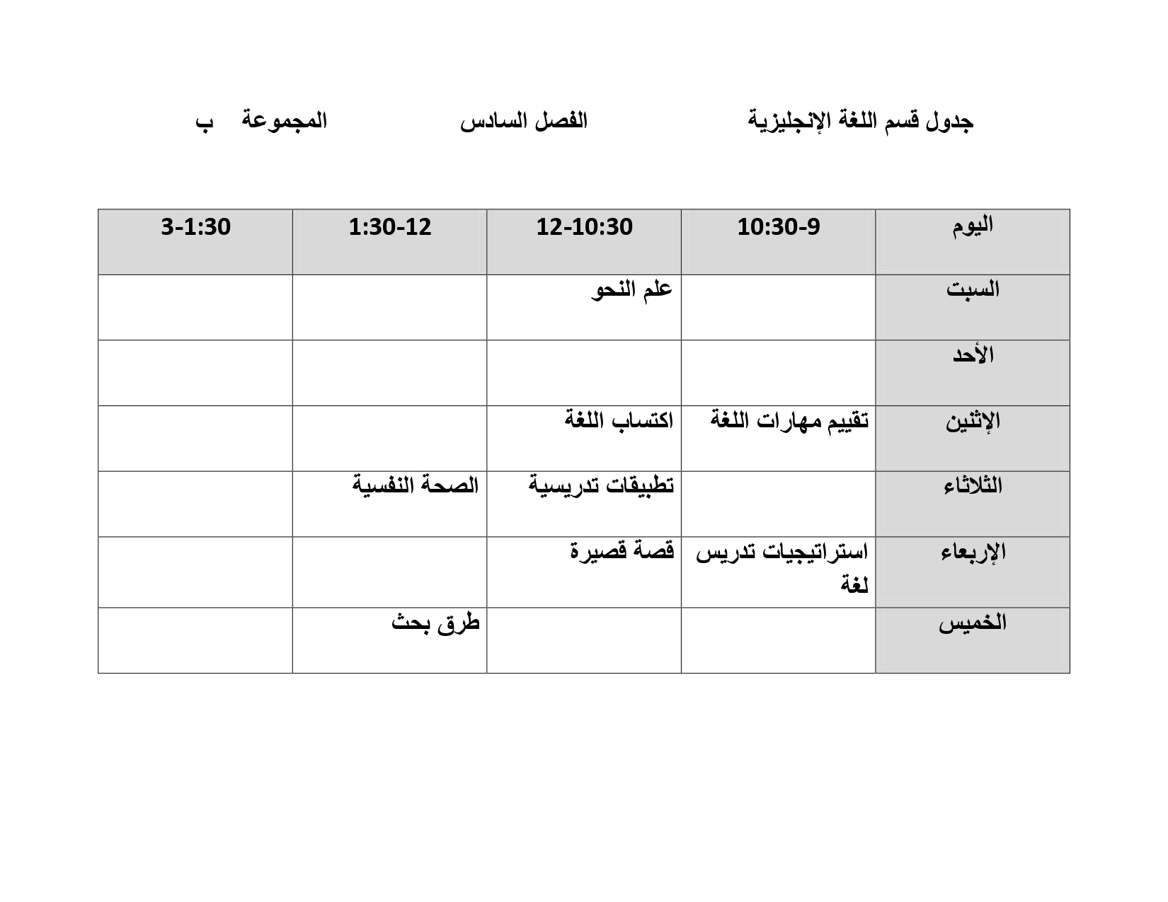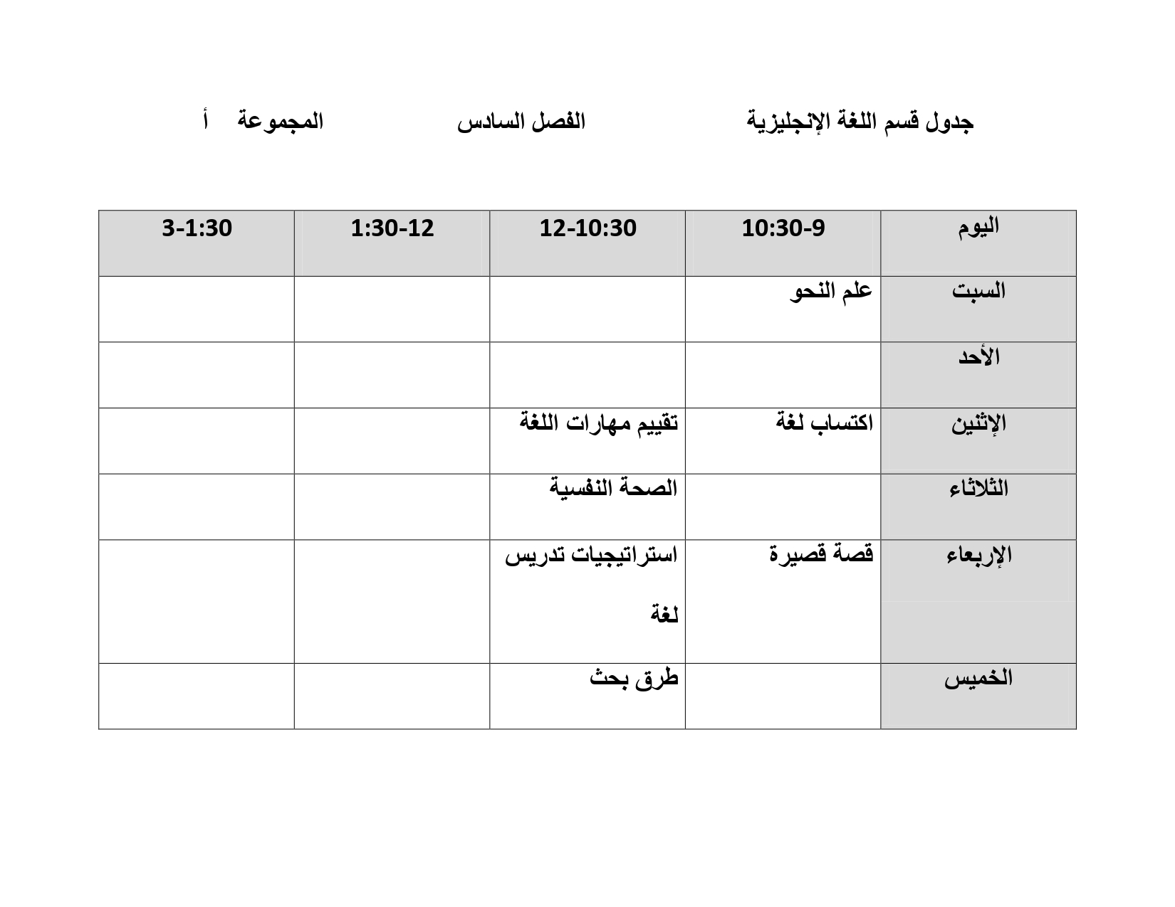 جدول قسم اللغة الإنجليزية