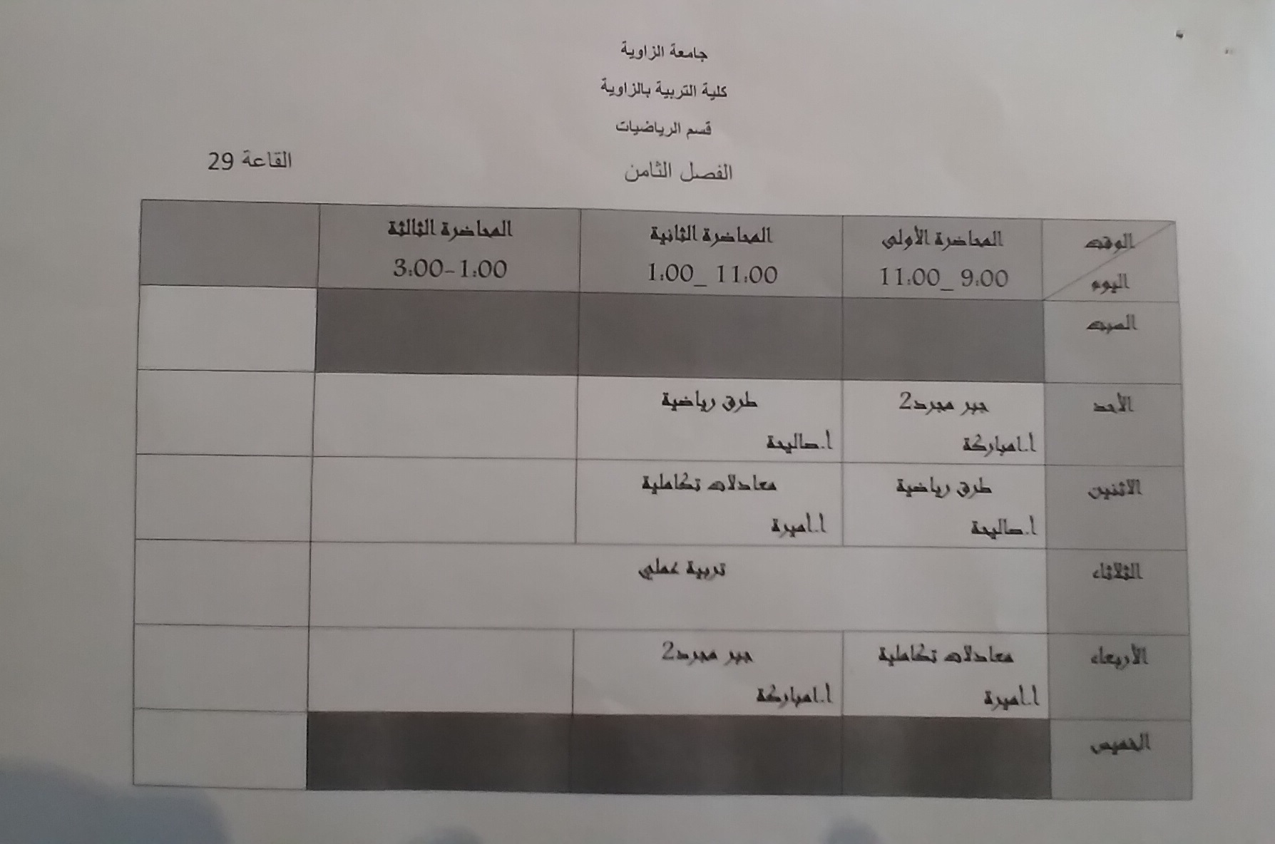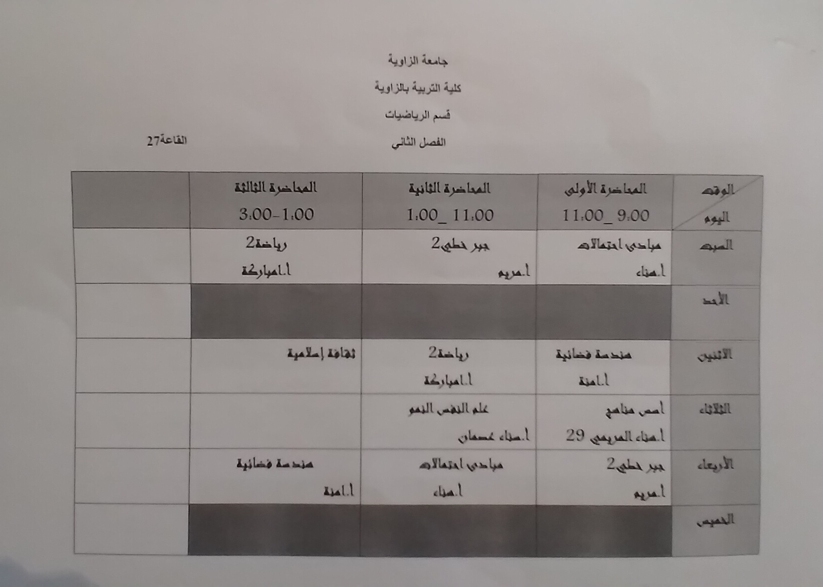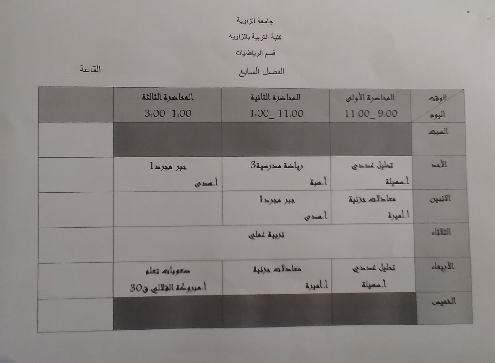 جدول قسم الرياضيات