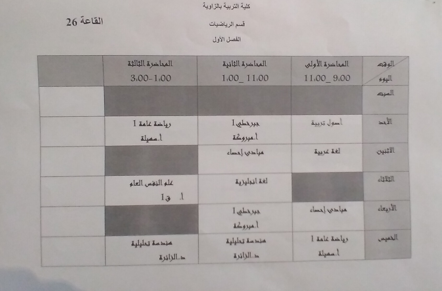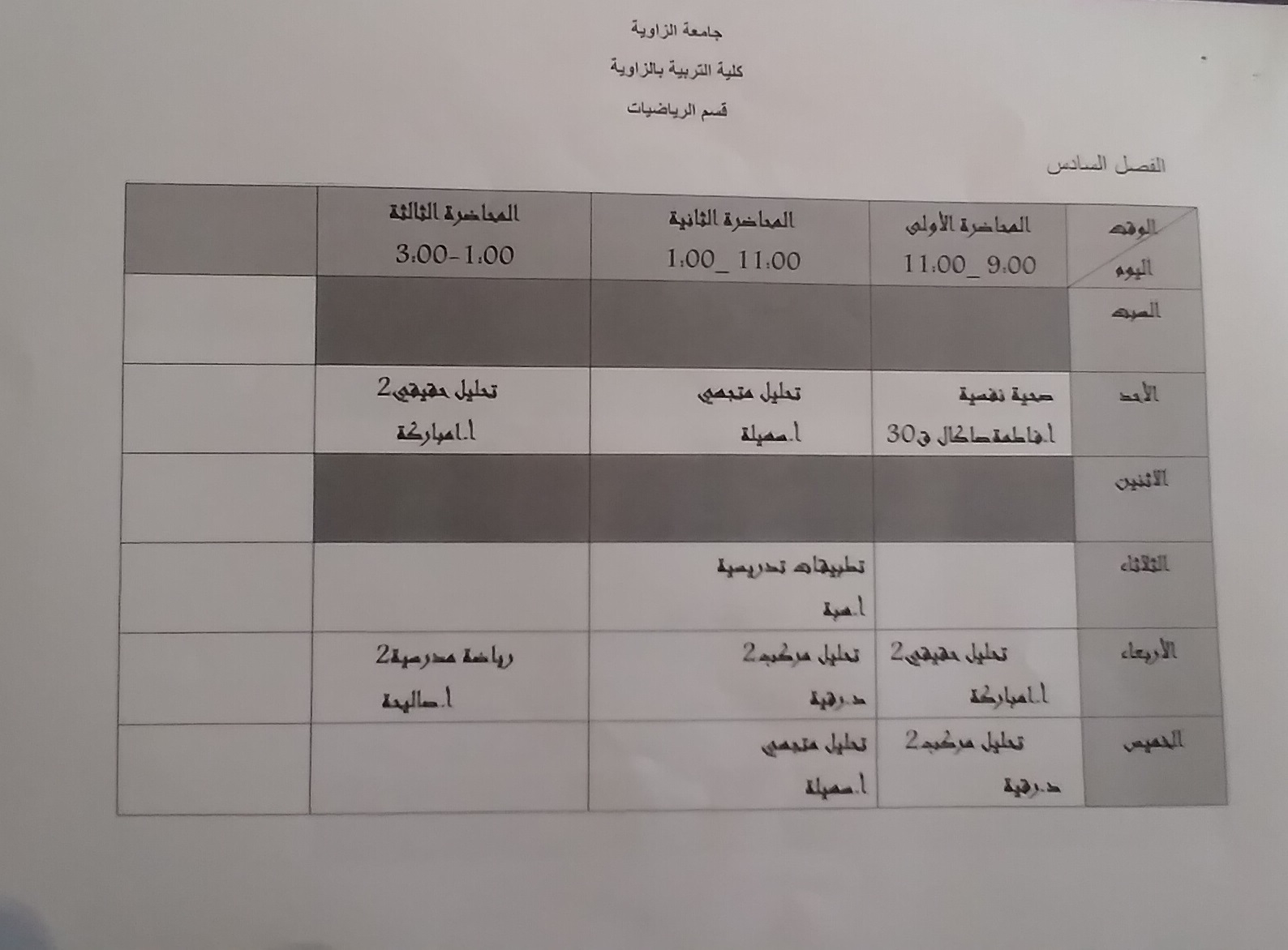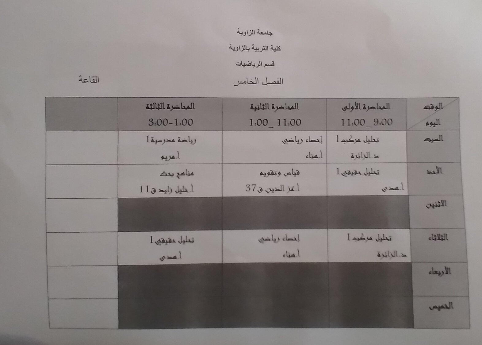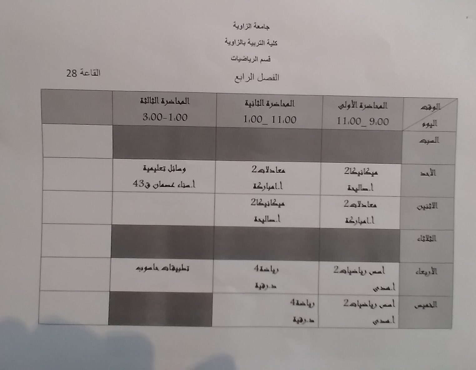 جدول قسم الرياضيات