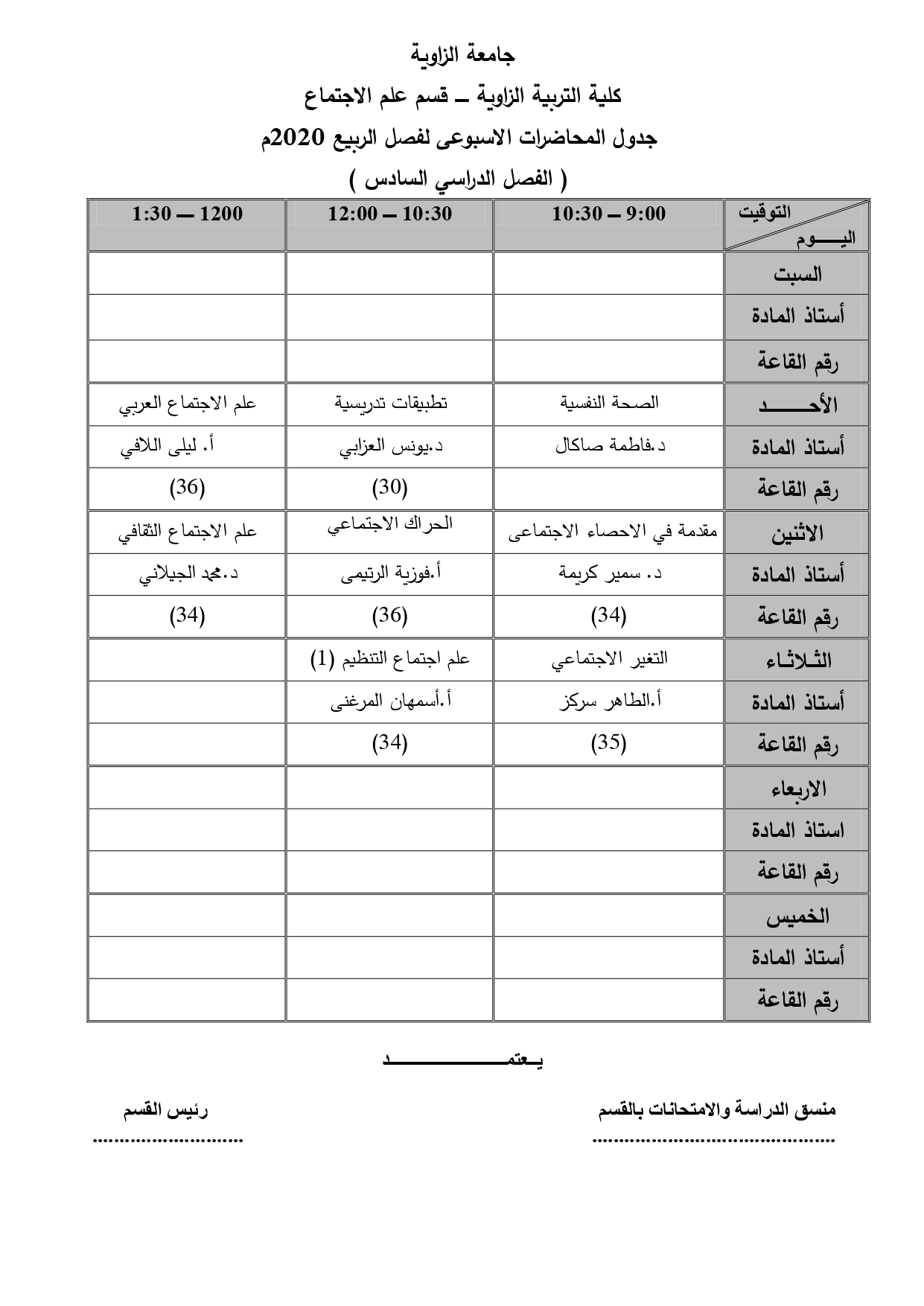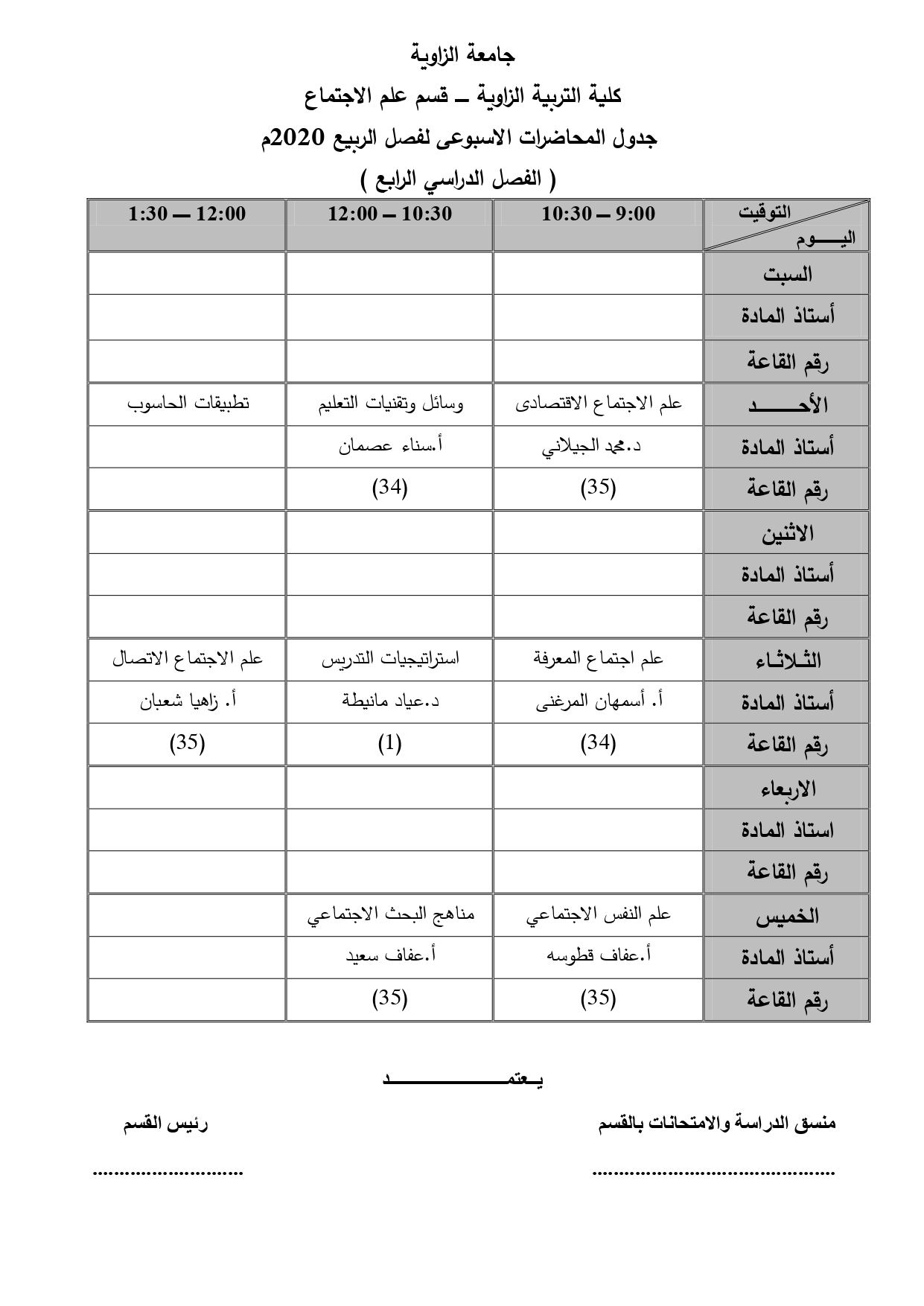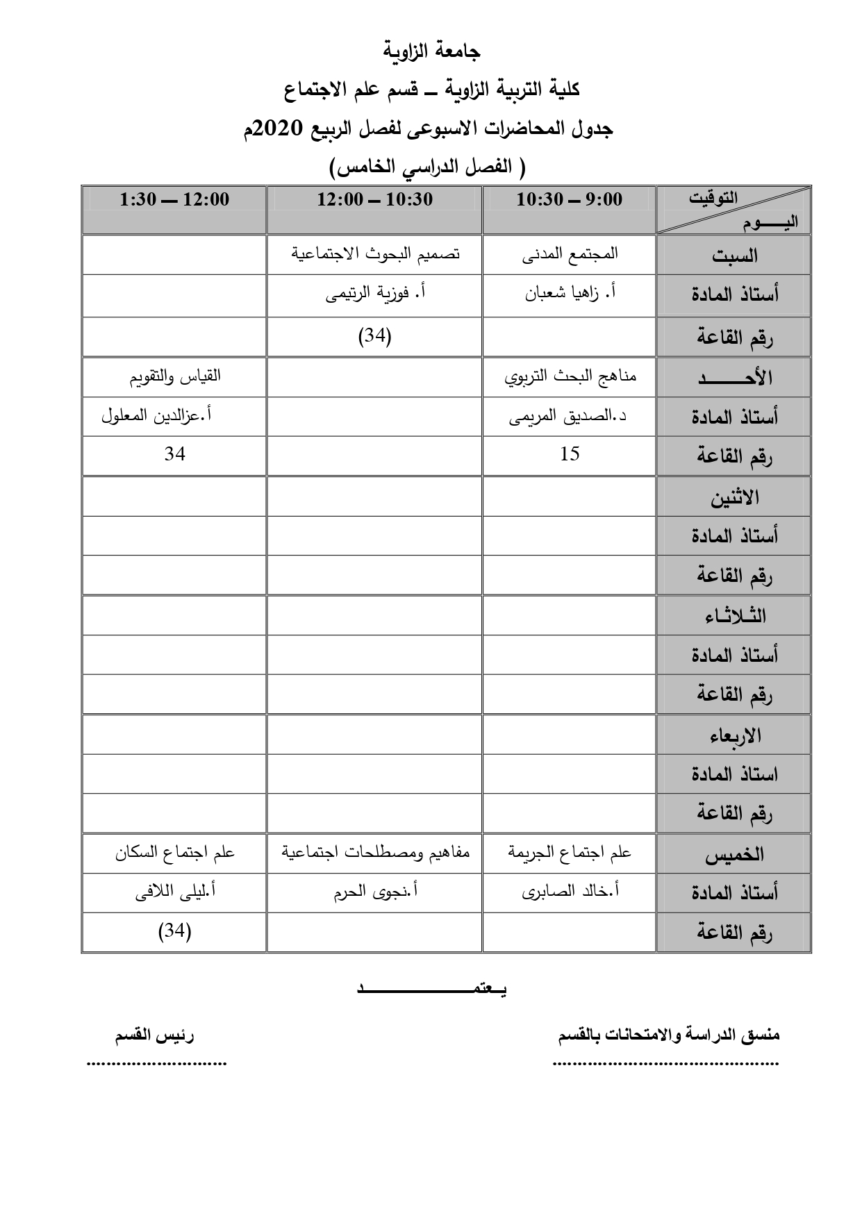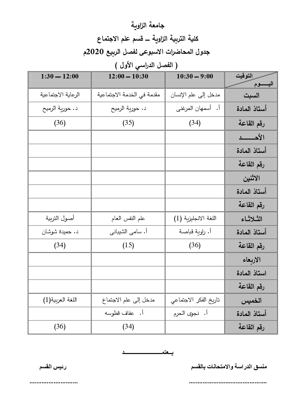 جدول قسم علم الإجتماع