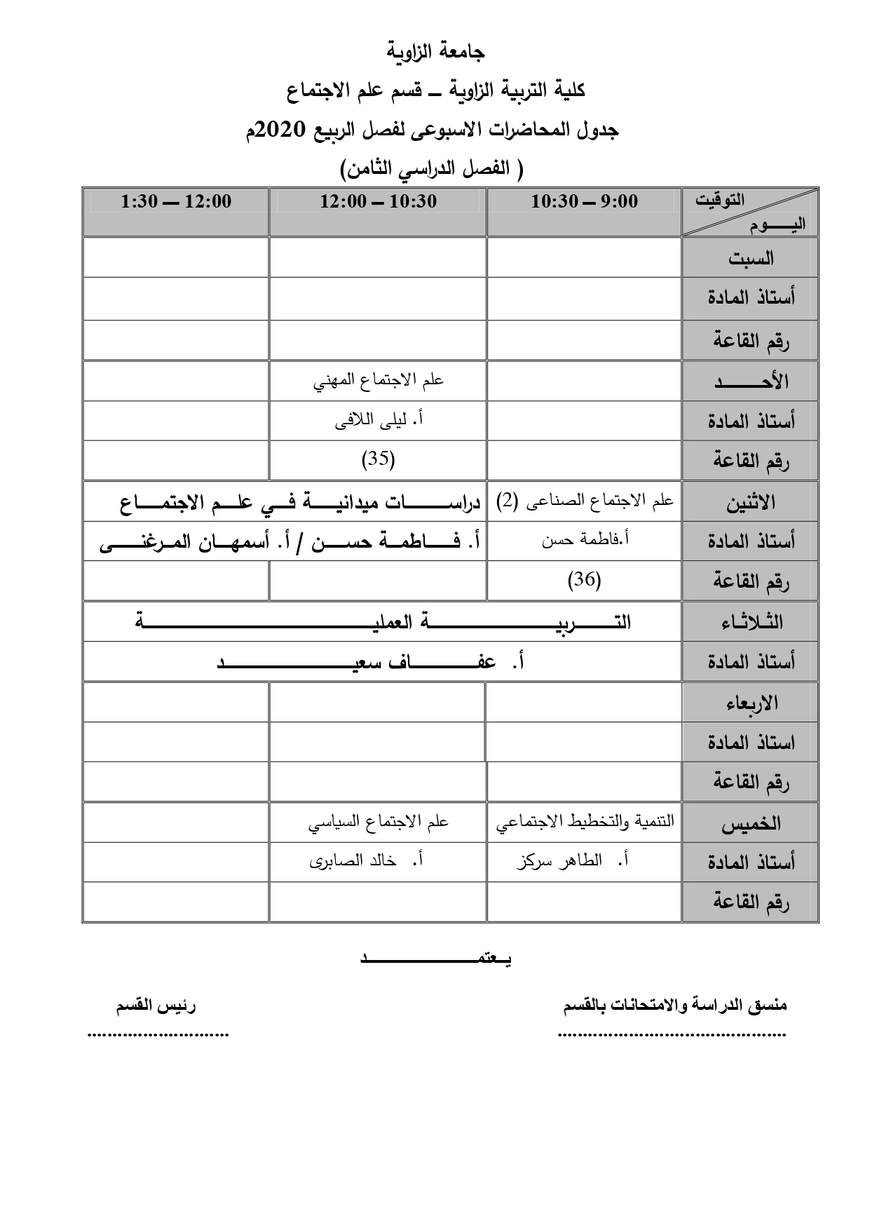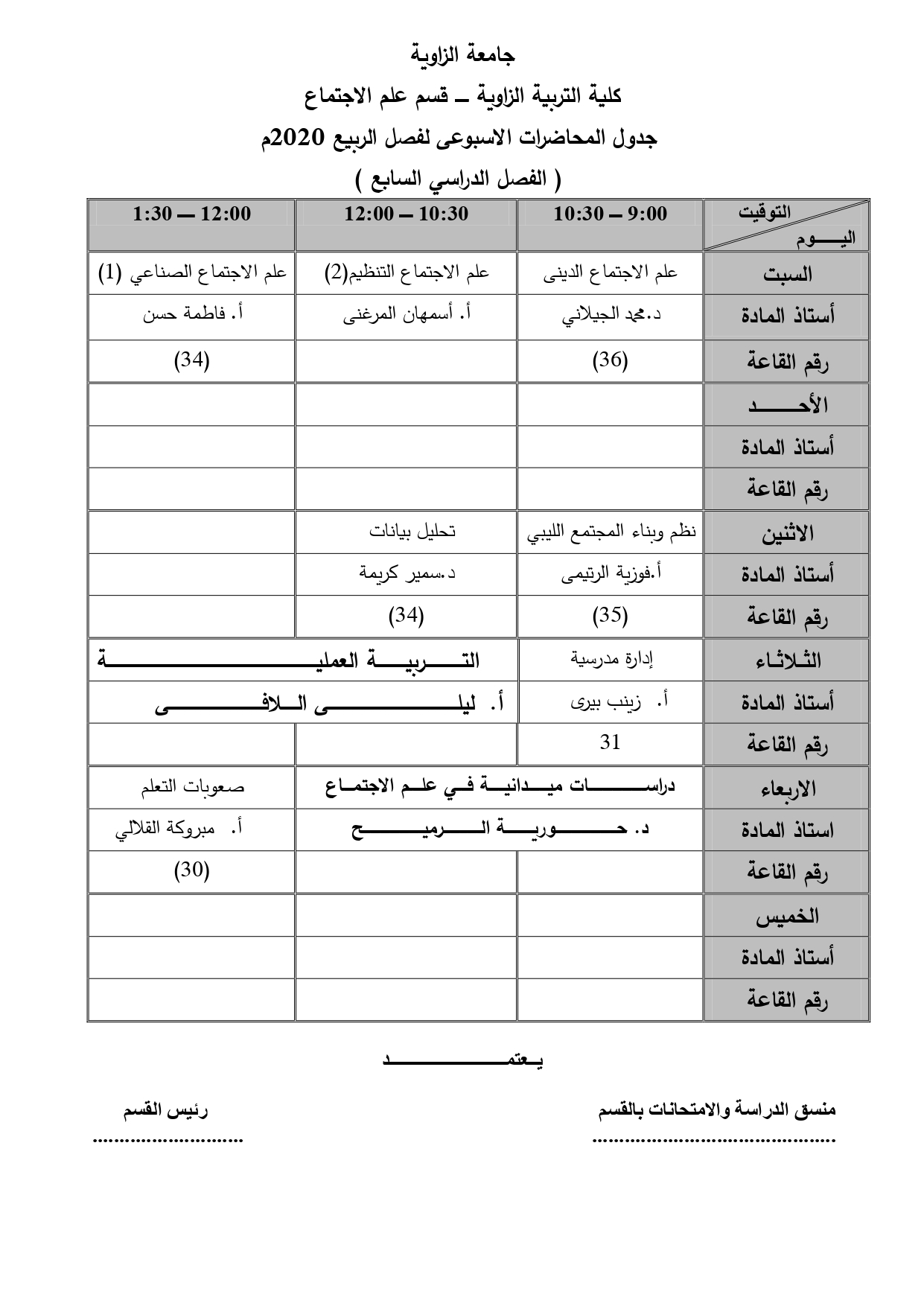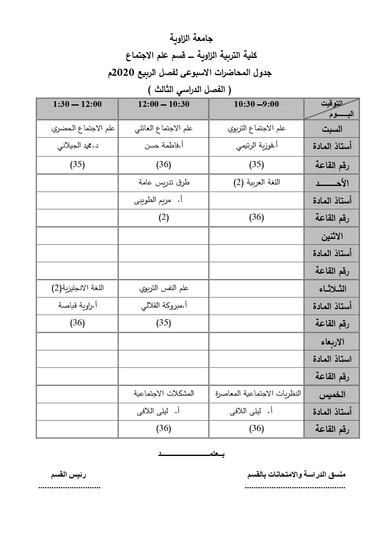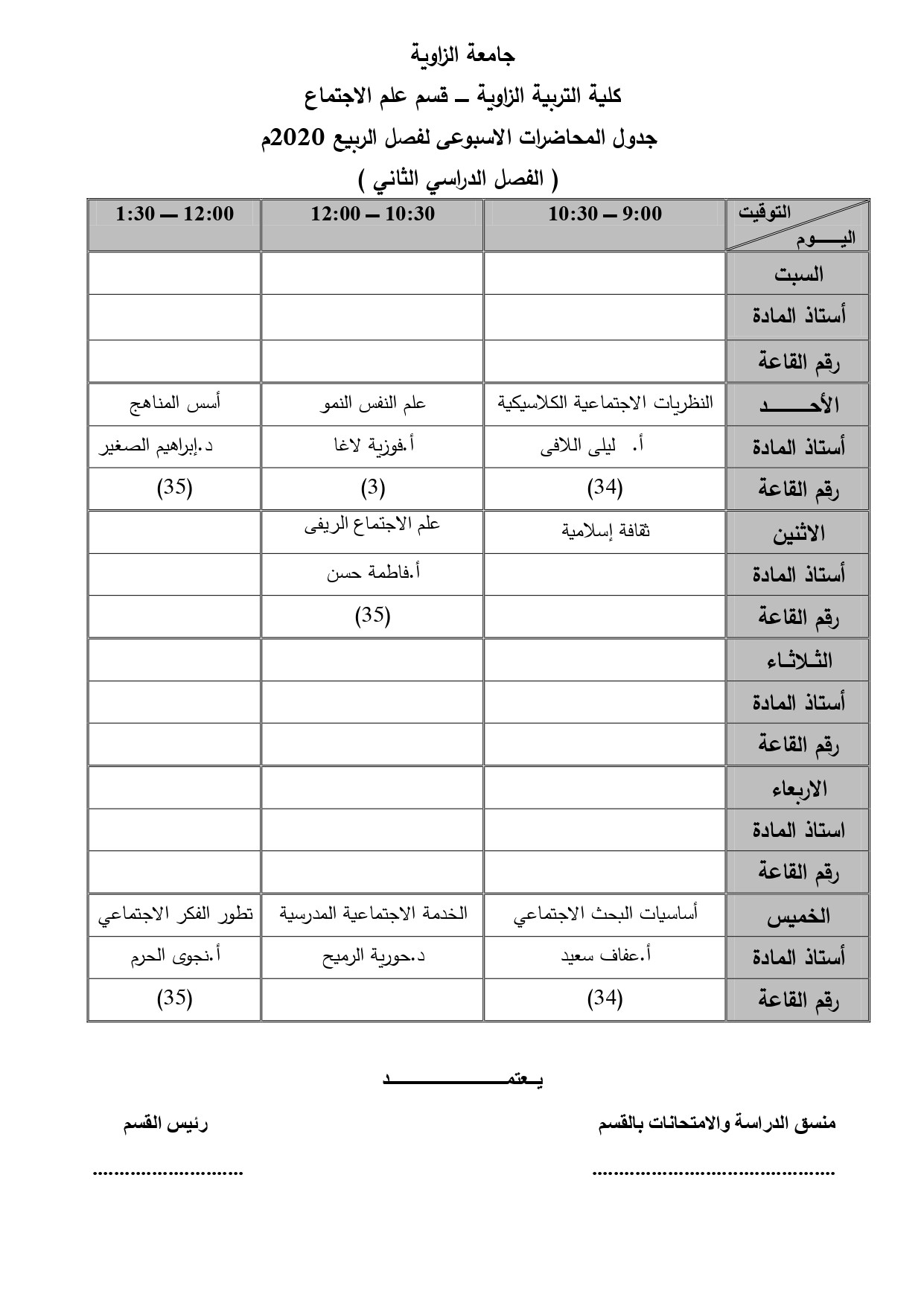 جدول قسم علم الإجتماع