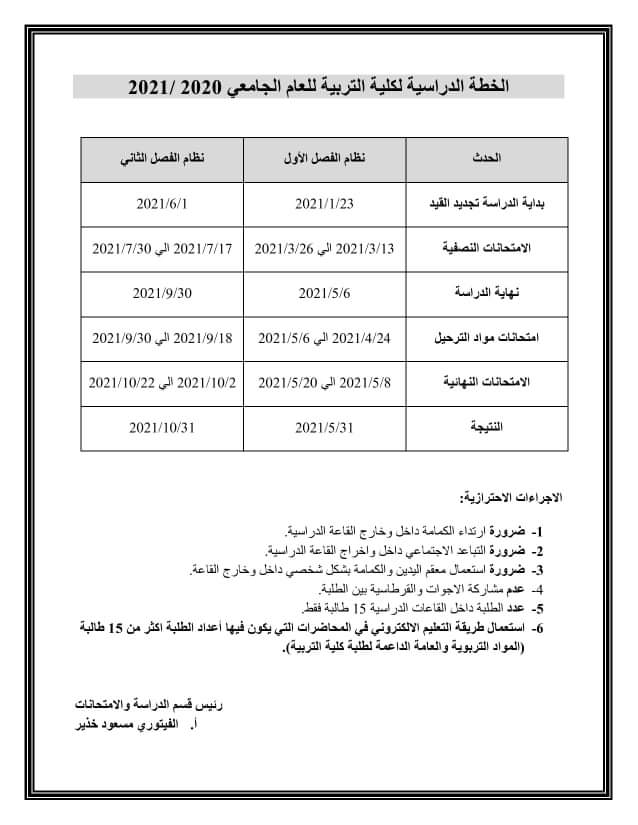 الخطة الدراسية لكلية التربية الزاوية للعام الجامعي 2021/2020م