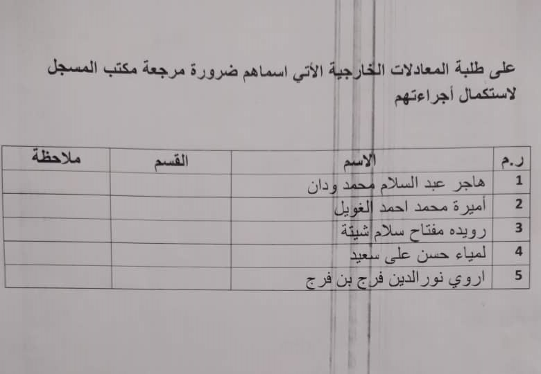 على الطالبات المنتقلات للكلية (المعادلات الخاردية) الأتي أسمائهن ضرورة مراجعة مكتب مسجل الكلية لإستكمال إجراءاتهن بأسرع وقت ممكن: