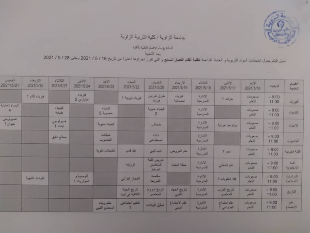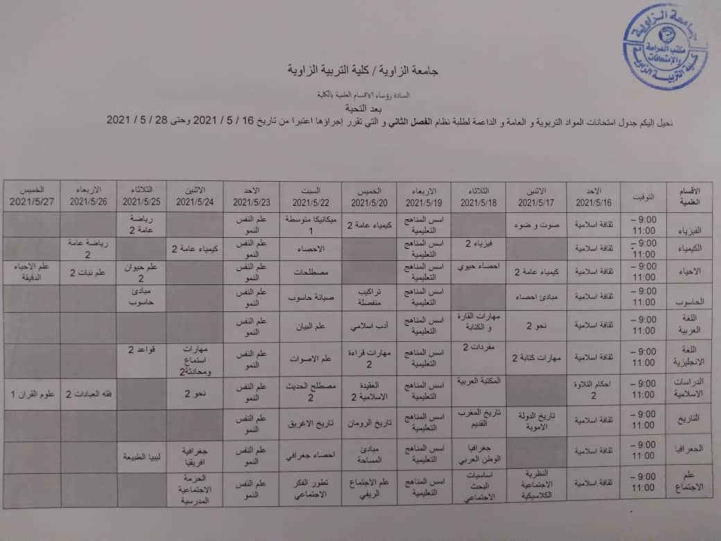 جدول الامتحانات النهائية لجميع الاقسام عد قسمي الرياضيات والتربية وعلم النفس