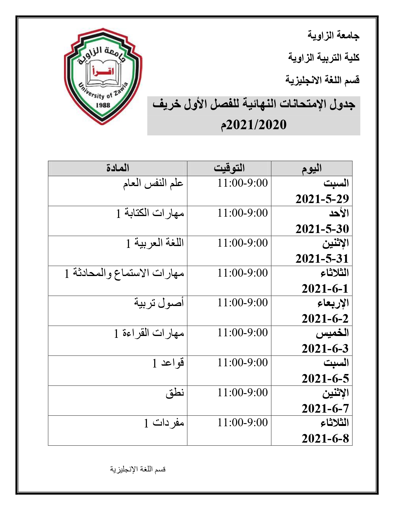 جدول الامتحان النهائي للفصل الأول بقسم اللغة الإنجليزية