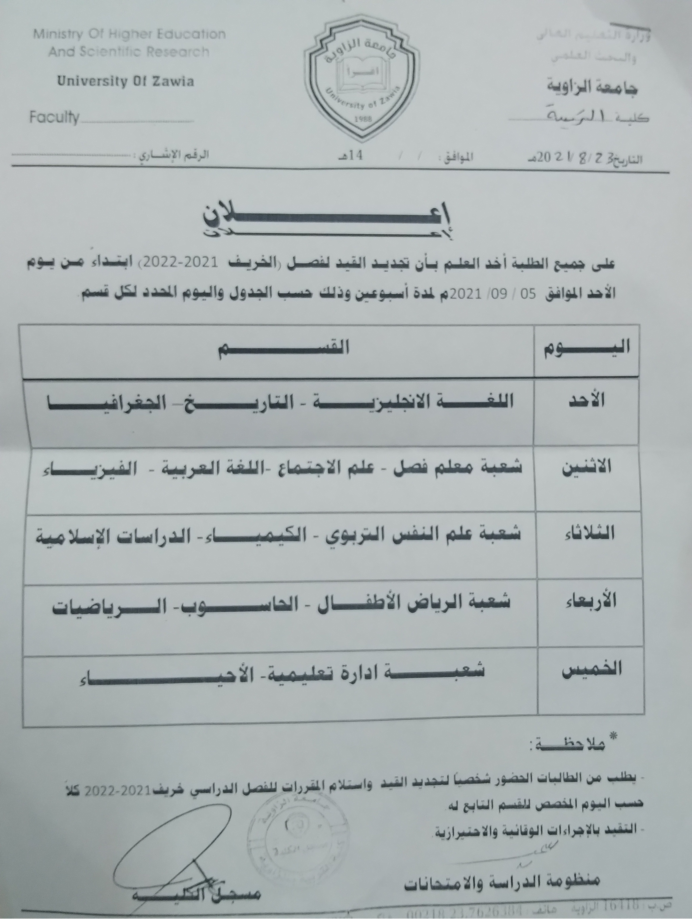 على جميع الطلبة أخذ العلم بأن تجديد القيد لفصل (الخريف 2021-2022) ابتداء من يوم الاحد الموافق 2021/09/05 م لمدة اسبوعين وذالك حسب الجدول واليوم المحدد لكل قسم حسب الجدول المرفق.