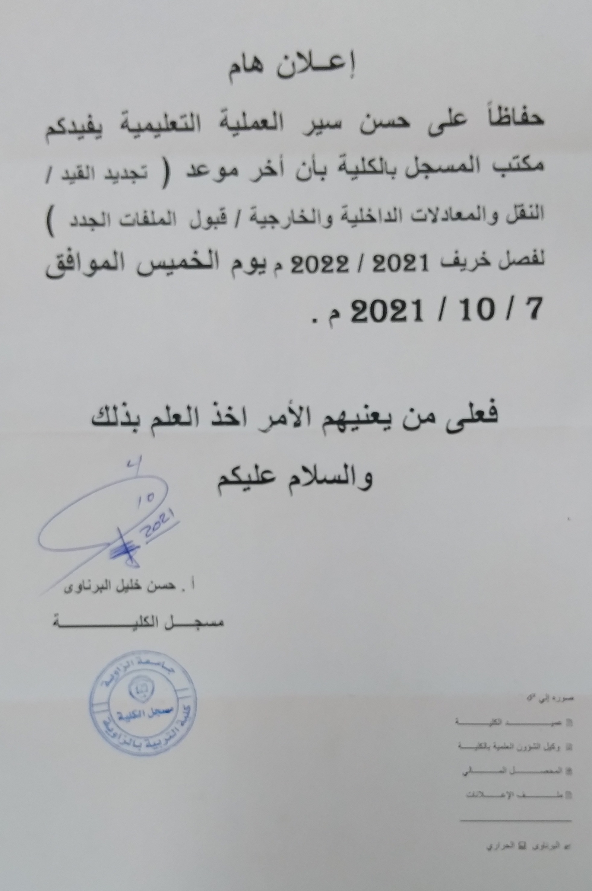حفاظا على حسن سير العملية التعليمية يفيدكم مكتب المسجل بالكلية بأن اخر موعد ( تجديد القيد / النقل والمعادلات الداخلية والخارجية / قبول الملفات الجدد) لفصل خريف 2021-2022 م. يوم الخميس الموافق 7-10-2021م.