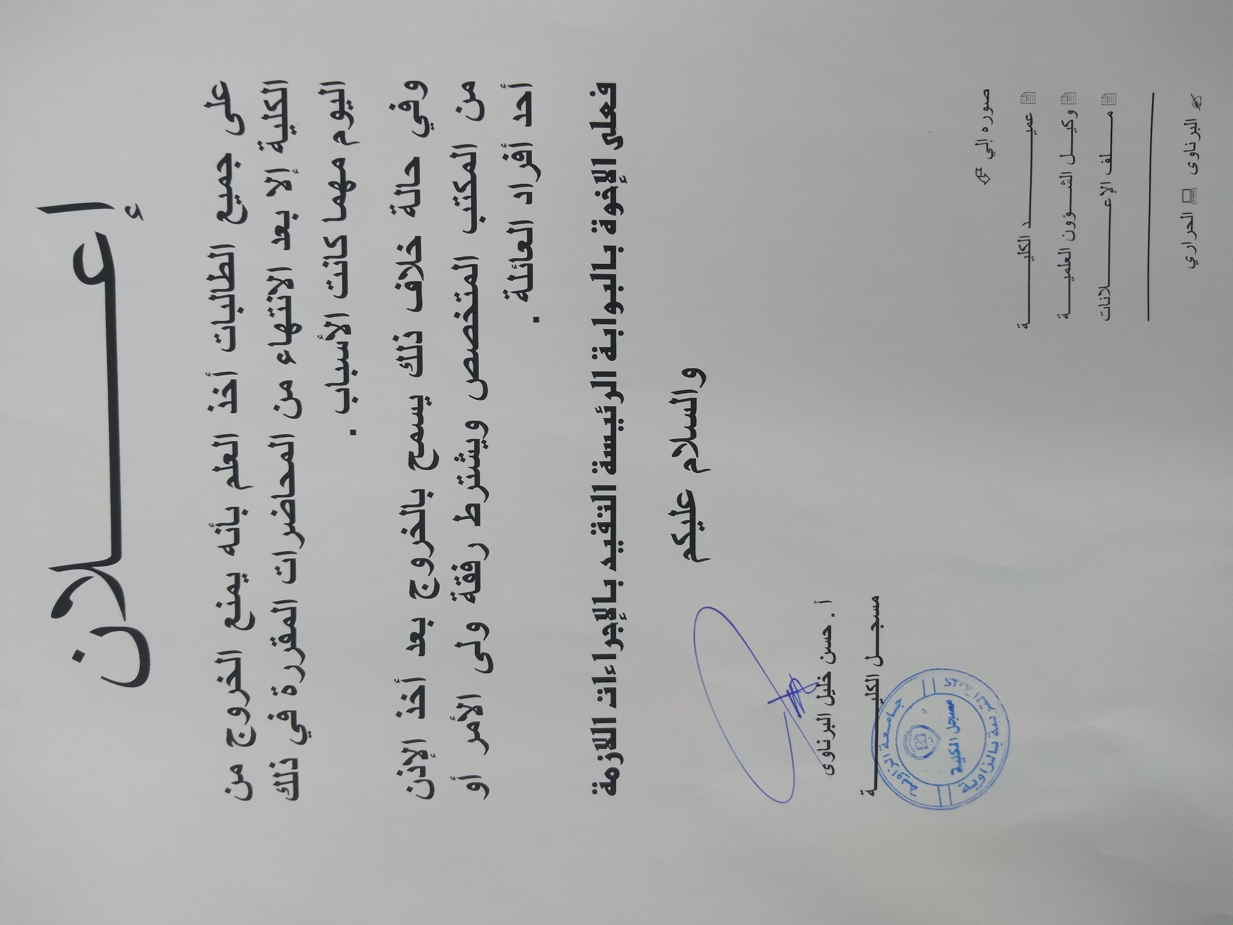 اعلان عن تنظيم الدخول والخروج من الكلية