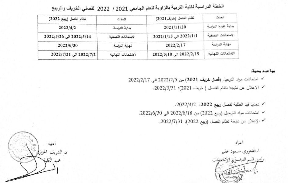الخطة الدراسية المعدلة للكلية مع ملاحظة تغيير موعد الامتحانات النصفية